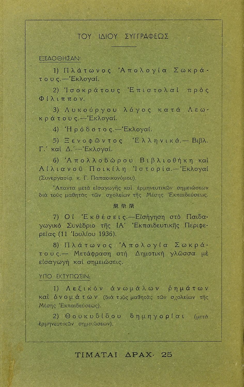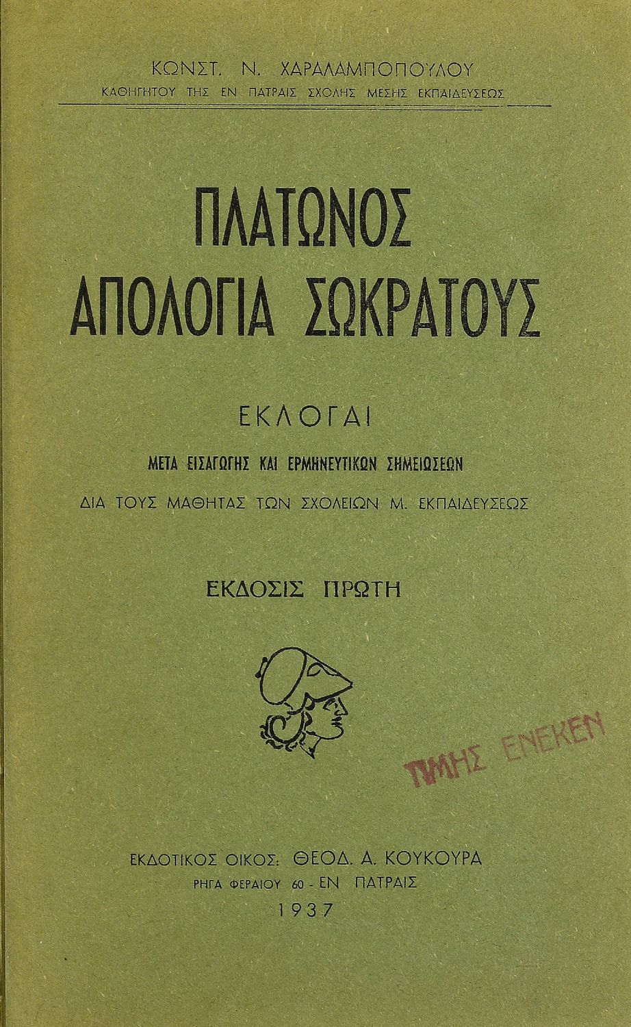Κωδικός αναγνώρισης: 20-01447 Τίτλος: Πλάτωνος Απολογία Σωκράτους εκλογαί μετά εισαγωγής και ερμηνευτικών σημειώσεων διά τους μαθητάς των σχολείων Μ. Εκπαιδεύσεως Συγγραφέας: Κωνστ. Ν. Χαραλαμπόπουλος Μέγεθος και υπόστρωμα: Σχολικό εγχειρίδιο, 20εκ., μαλακό εξώφυλλο, 90 σελίδες. |