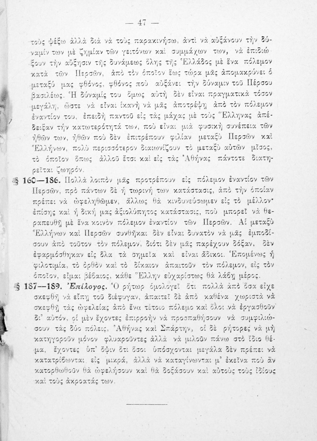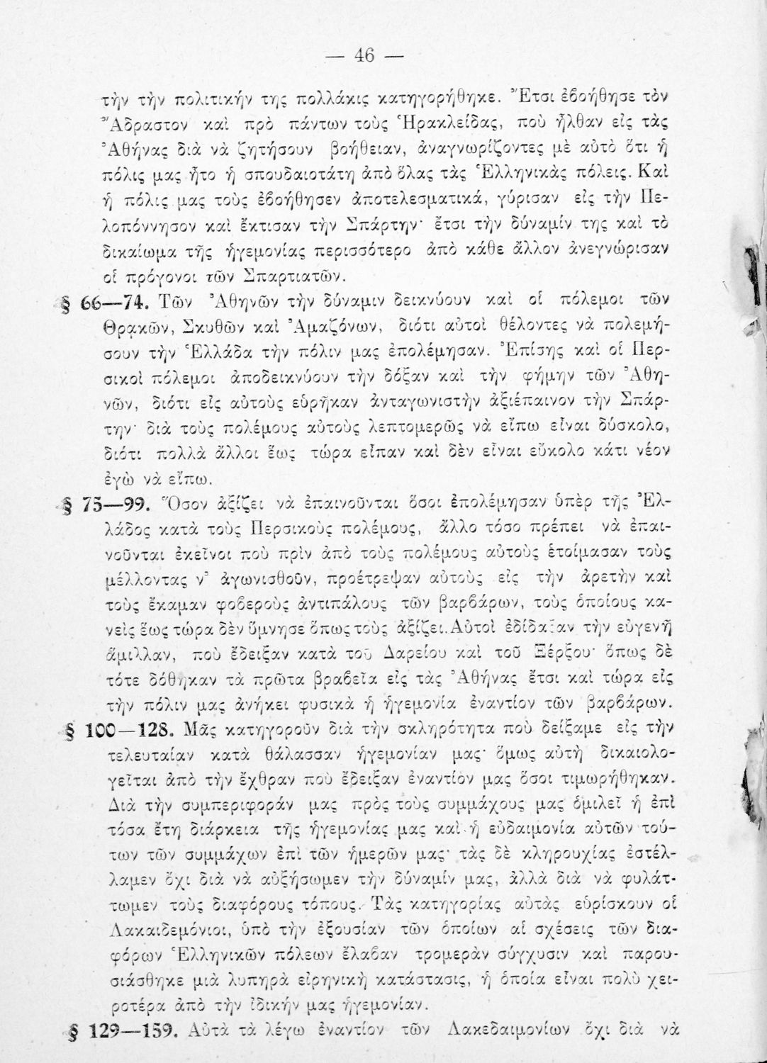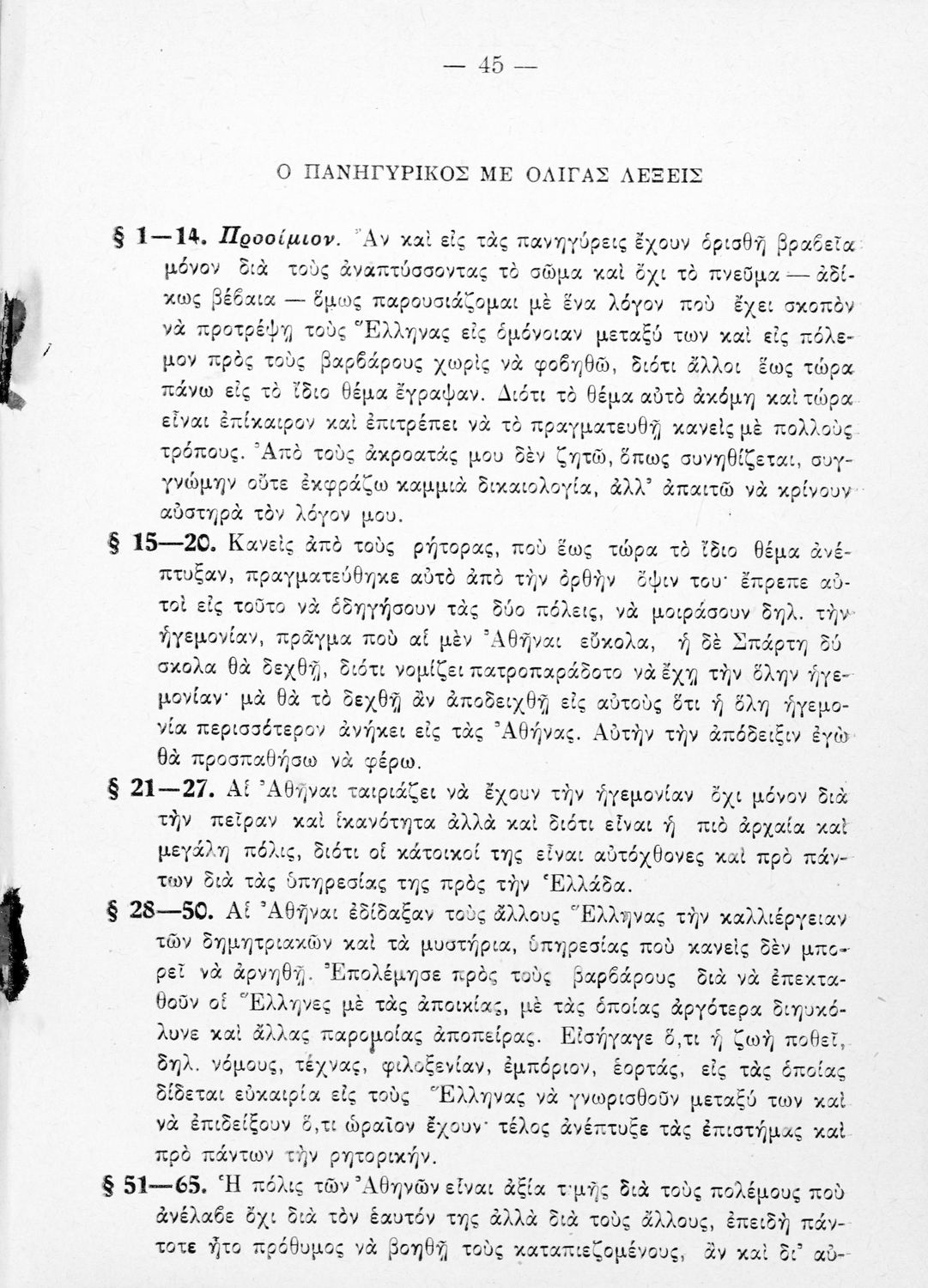 Σχολικό εγχειρίδιο Αρχαίων Ελληνικών Γ΄ Γυμνασίου που περιλαμβάνει μετάφραση του Λόγου του Ισοκράτη Πανηγυρικός, εισαγωγικά σχόλια για τη ζωή και το έργο του και ερμηνευτικά και πραγματολογικά σχόλια.