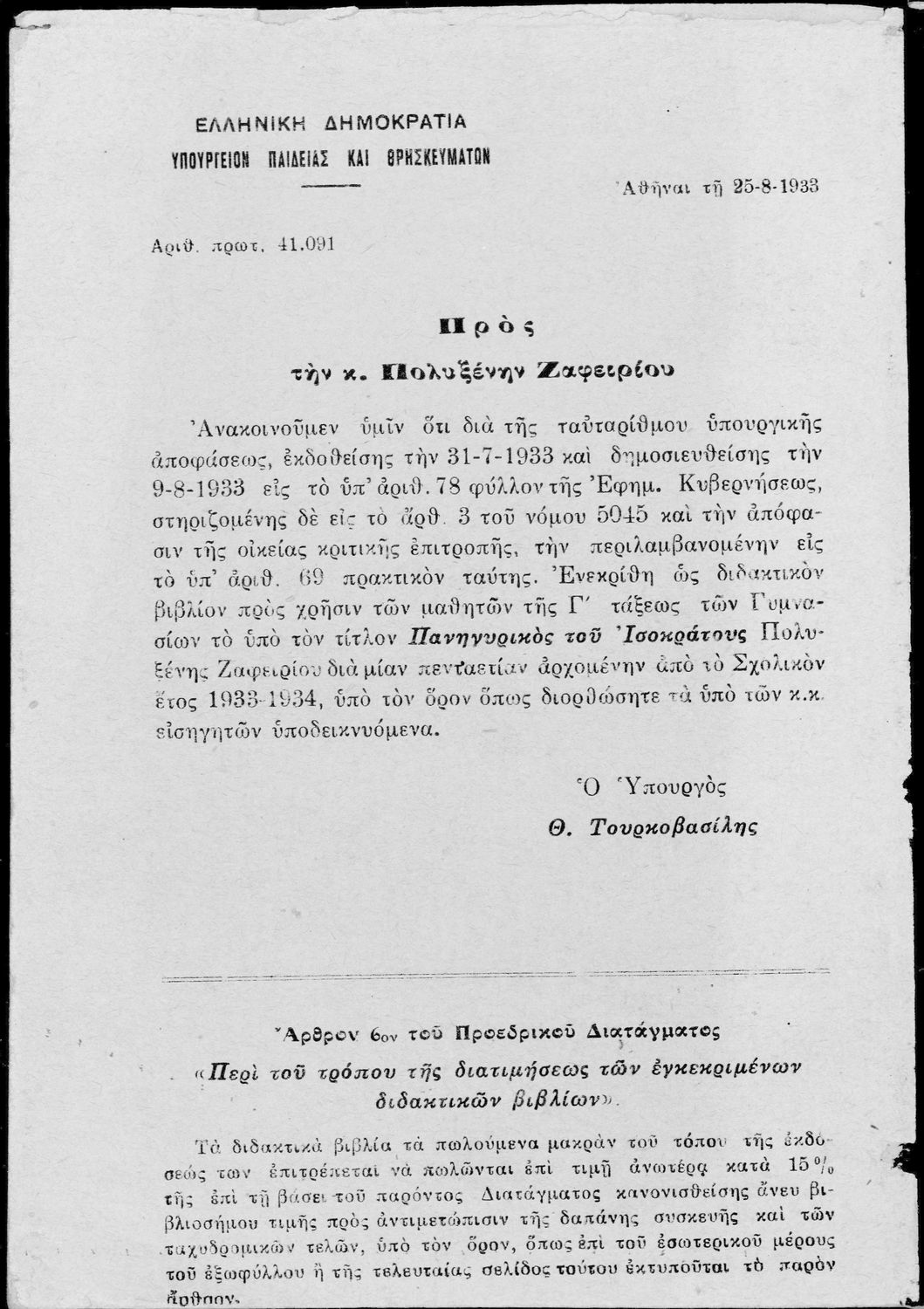 Εκδότης: Μιχ. Σ. Ζηκάκης Έτος έκδοσης: 1933 Τόπος έκδοσης: Αθήνα Έκδοση: 1η Υπουργική απόφαση / Σύμβαση: 41091/31-7-1933 Έτος έγκρισης: 1933 |