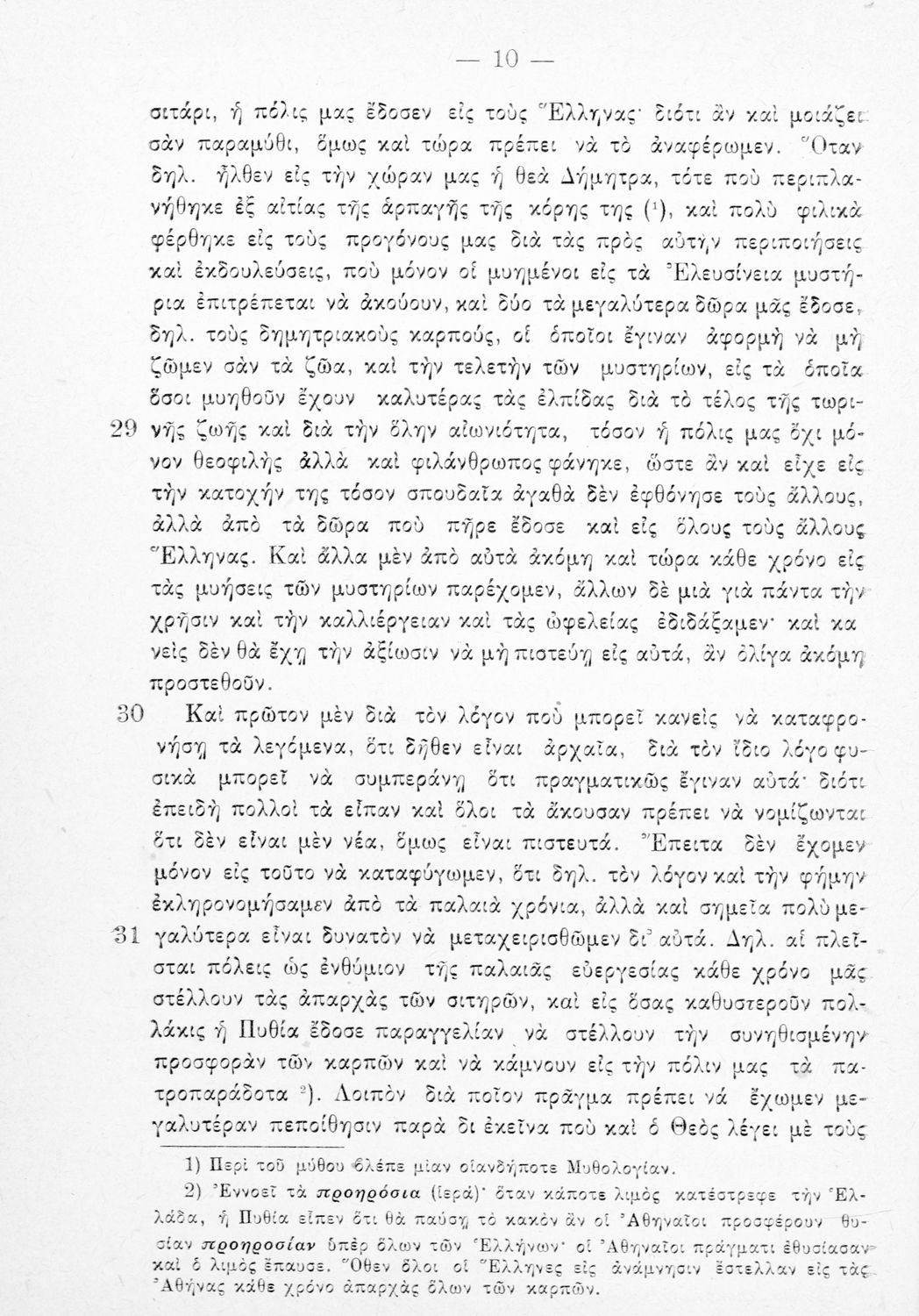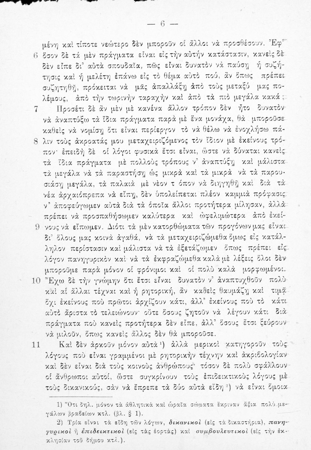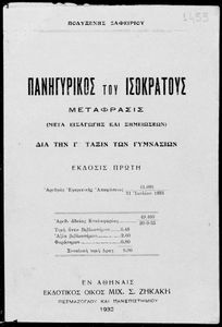 Βαθμίδα εκπαίδευσης: Δευτεροβάθμια Τάξη: Γ' Γυμνασίου Μάθημα: Αρχαία Ελληνικά Γλώσσα: Καθαρεύουσα Παρουσίαση περιεχομένου: Σχολικό εγχειρίδιο Αρχαίων Ελληνικών Γ΄ Γυμνασίου που περιλαμβάνει μετάφραση του Λόγου του Ισοκράτη Πανηγυρικός, εισαγωγικά σχόλια για τη ζωή και το έργο του και ερμηνευτικά και πραγματολογικά σχόλια. |