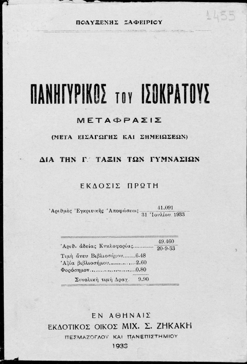 Εκδότης: Μιχ. Σ. Ζηκάκης Έτος έκδοσης: 1933 Τόπος έκδοσης: Αθήνα Έκδοση: 1η Υπουργική απόφαση / Σύμβαση: 41091/31-7-1933 Έτος έγκρισης: 1933 |