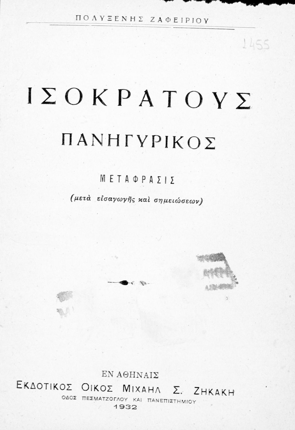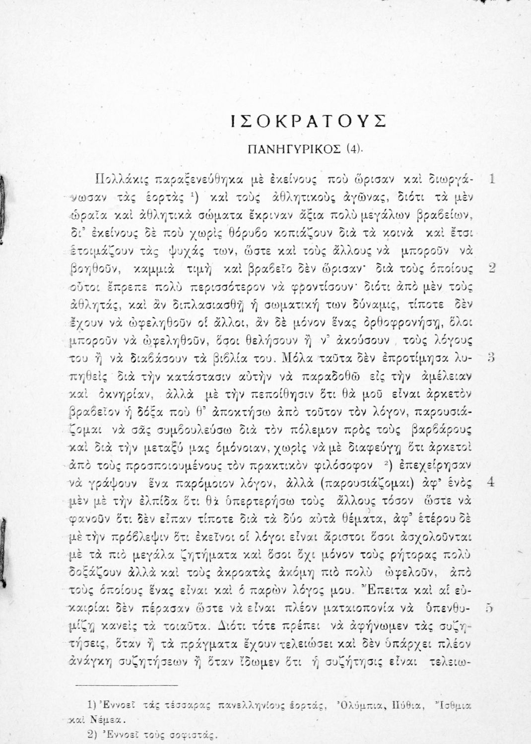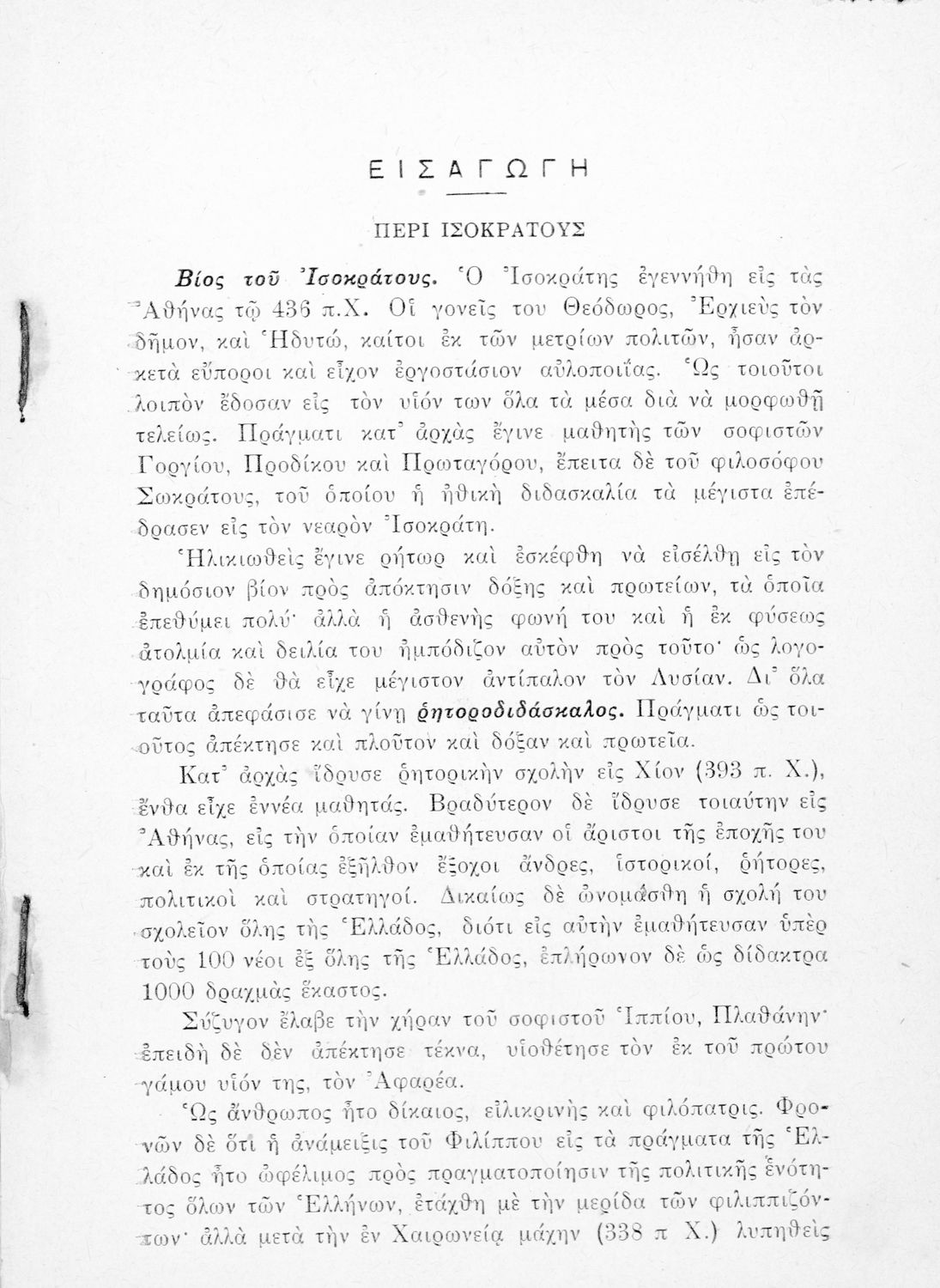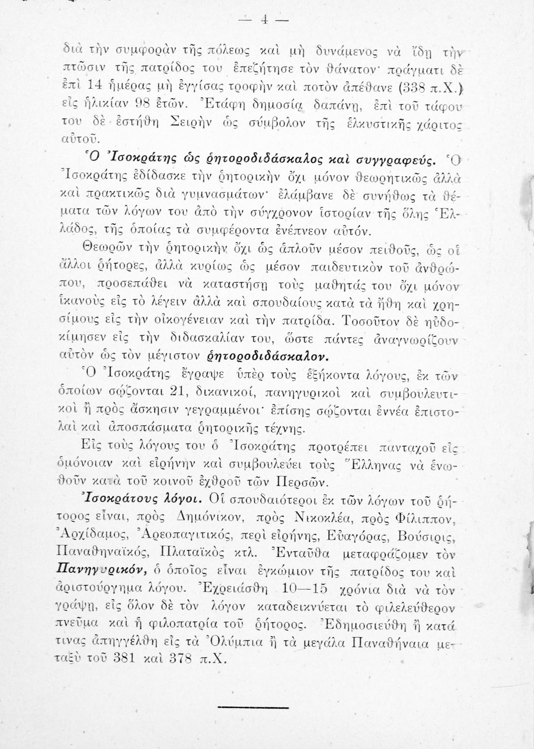 Σχολικό εγχειρίδιο Αρχαίων Ελληνικών Γ΄ Γυμνασίου που περιλαμβάνει μετάφραση του Λόγου του Ισοκράτη Πανηγυρικός, εισαγωγικά σχόλια για τη ζωή και το έργο του και ερμηνευτικά και πραγματολογικά σχόλια.