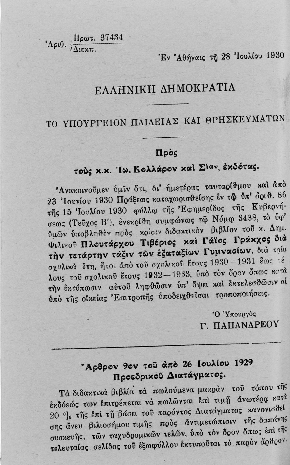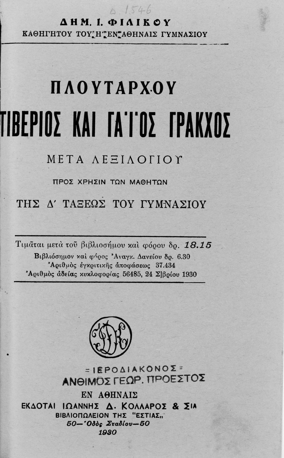 520 ## _aΣχολικό εγχειρίδιο Αρχαίων Ελληνικών Δ΄ Γυμνασίου που περιλαμβάνει το έργο του Πλούταρχου Τιβέριος και Γάιος Γράκχος, εισαγωγή στη ζωή και το έργο του και λεξιλογικά και ερμηνευτικά σχόλια.
