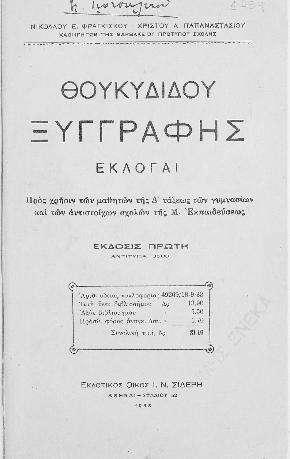Τίτλος: Θουκυδίδου Ξυγγραφής - Εκλογαί προς χρήσιν των μαθητών της Δ΄ τάξεως των Γυμνασίων και των αντιστοίχων σχολών της Μέσης Εκπαιδεύσεως