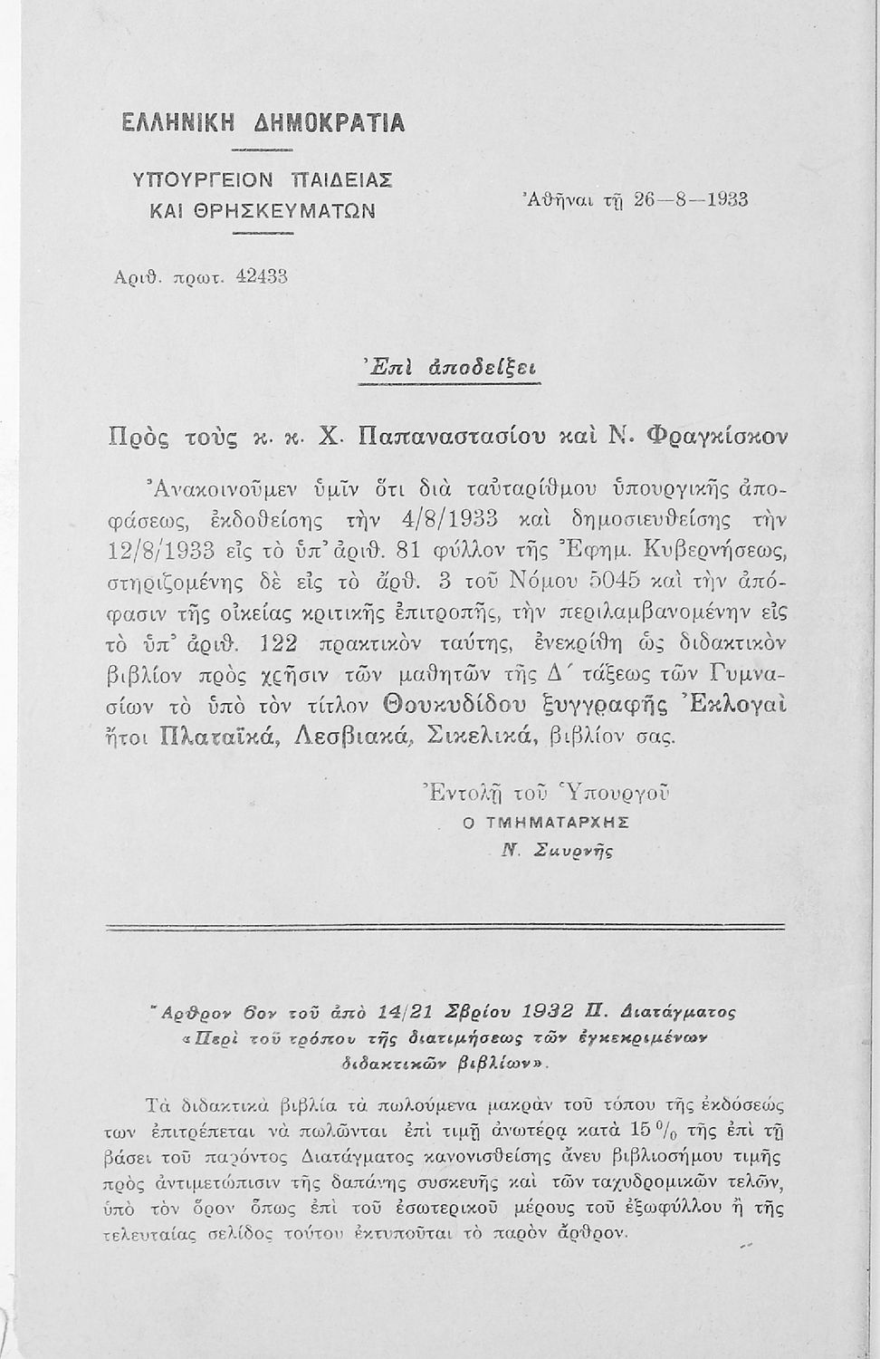 Υπουργική απόφαση / Σύμβαση: 42433/4-8-1933