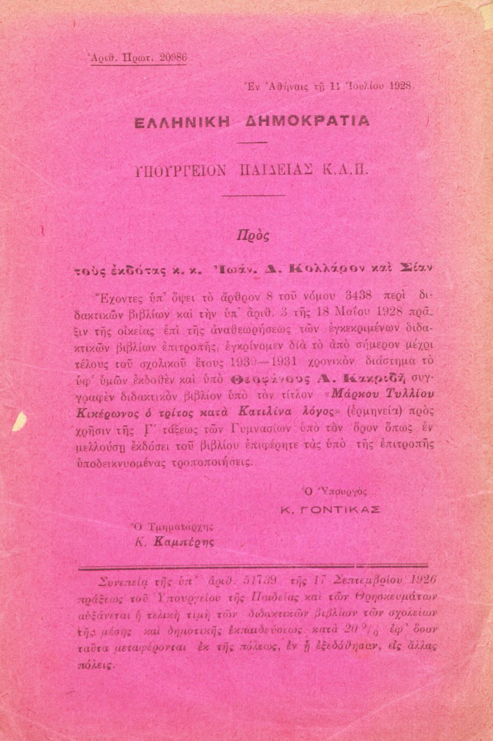 Τίτλος: Μάρκου Τύλλιου Κικέρωνος Ο τρίτος κατά Κατιλίνα Λόγος προς χρήσιν των μαθητών της Γ΄ τάξεως του Γυμνασίου