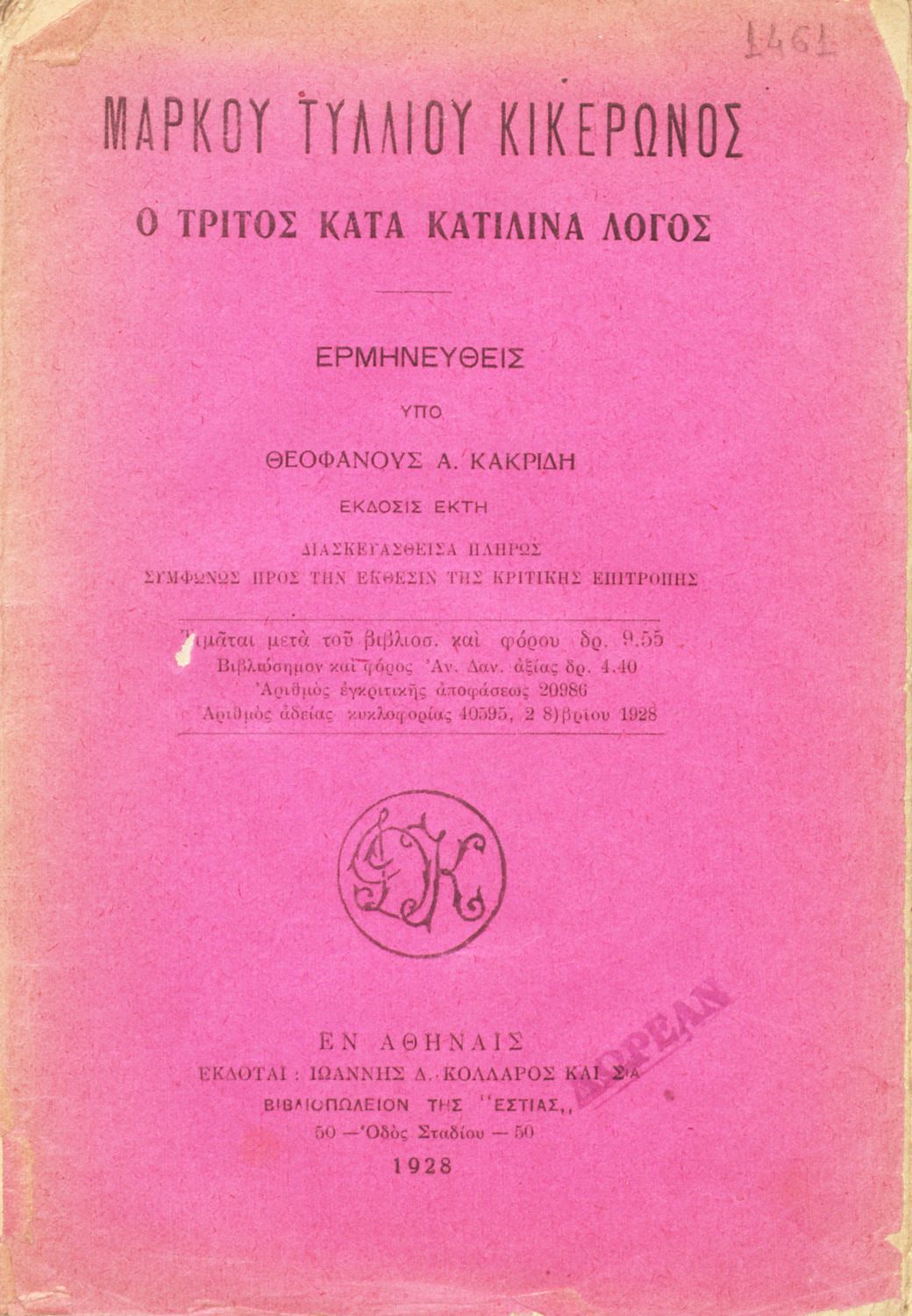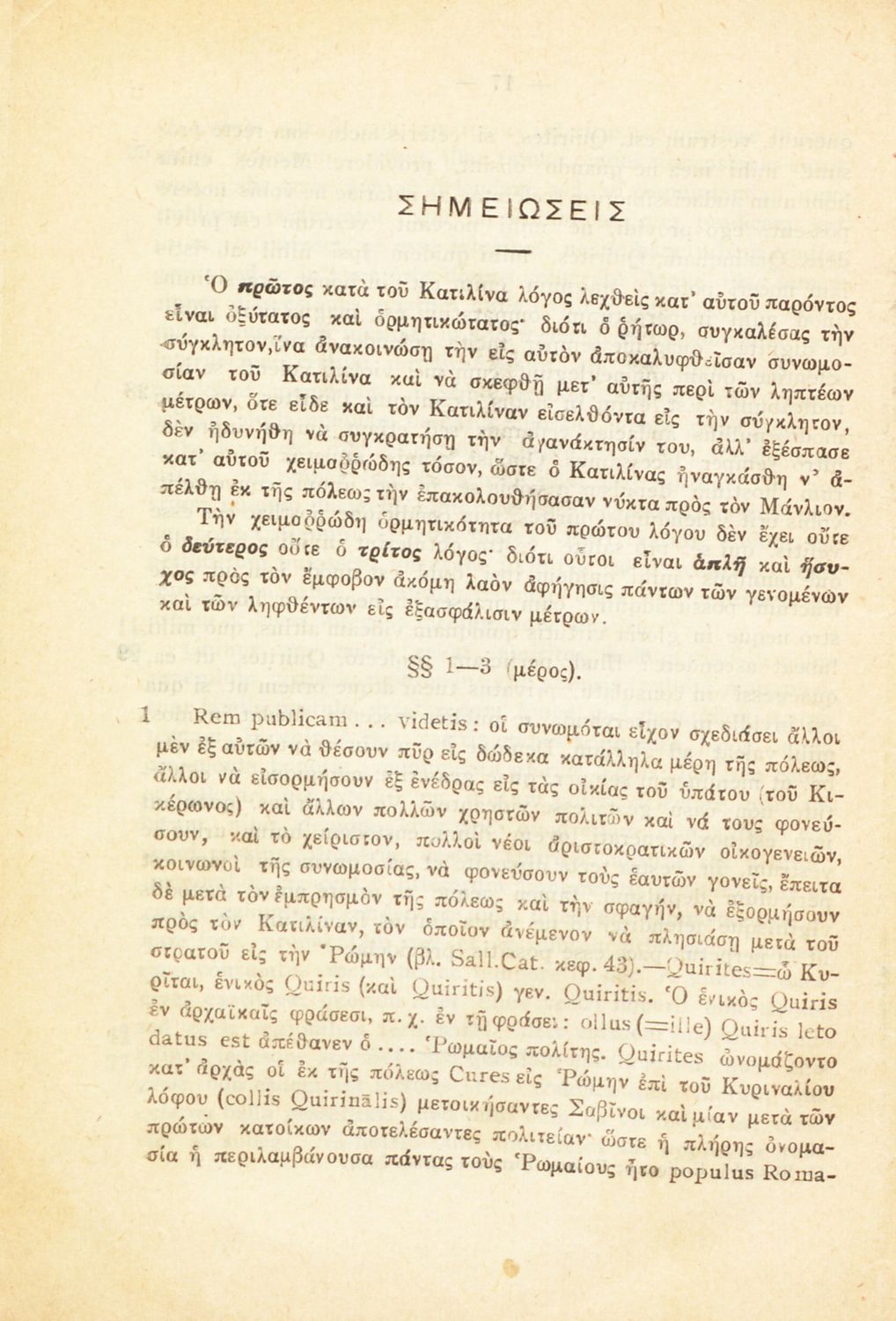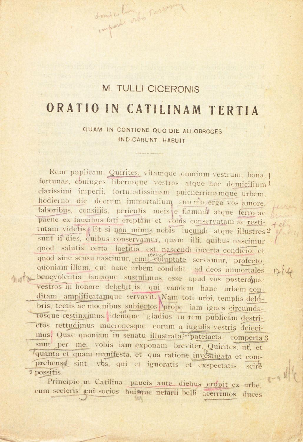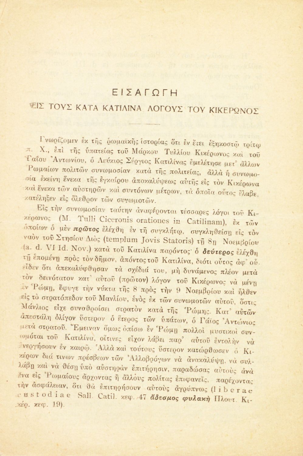 Σχολικό εγχειρίδιο Λατινικών Γ΄ Γυμνασίου που περιλαμβάνει την εισαγωγή στο έργο και τη ζωή του Κικέρωνα, το λατινικό κείμενο του Τρίτου Λόγου κατά Κατιλίνα και ερμηνευτικά, γραμματικά και πραγματολογικά σχόλια.