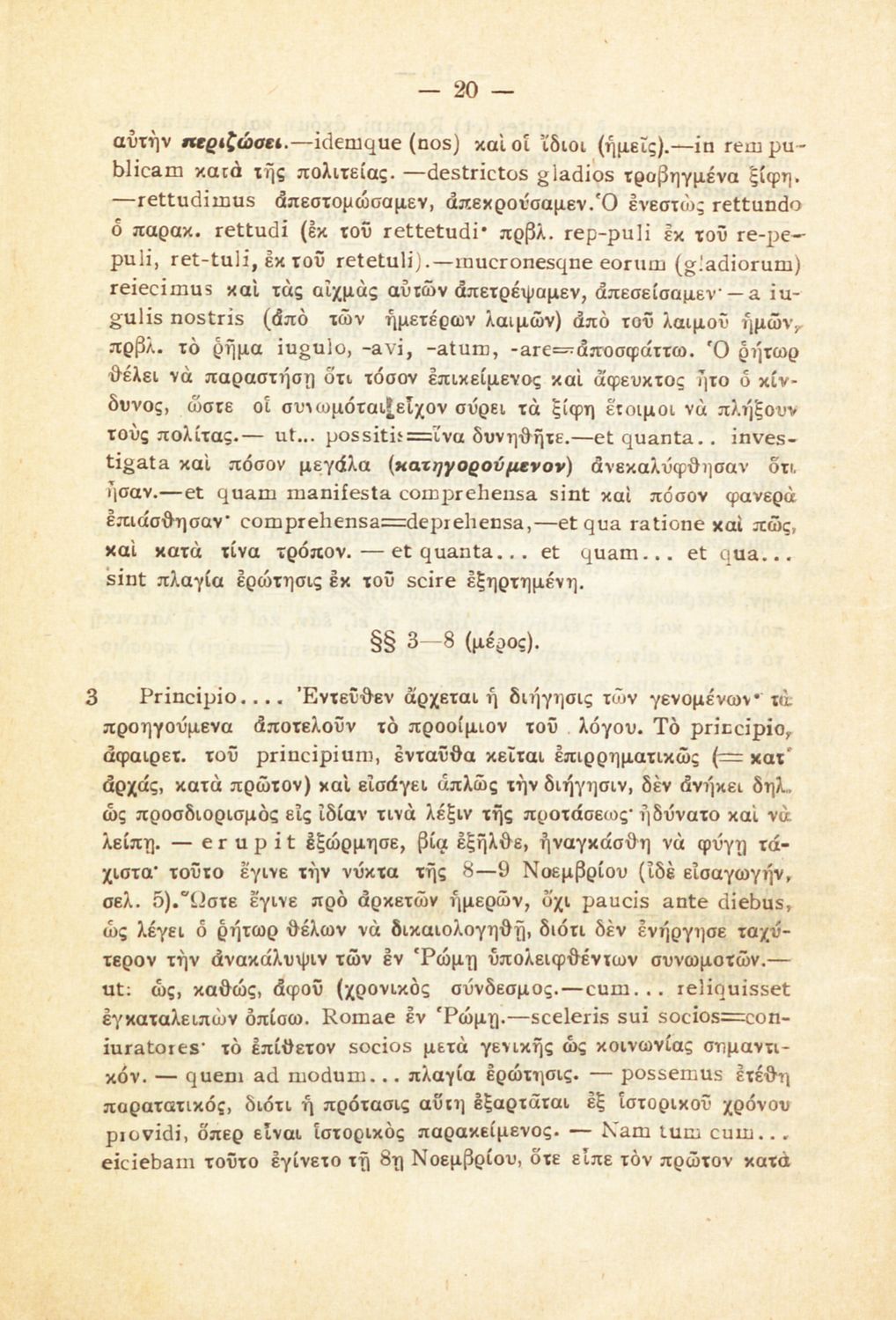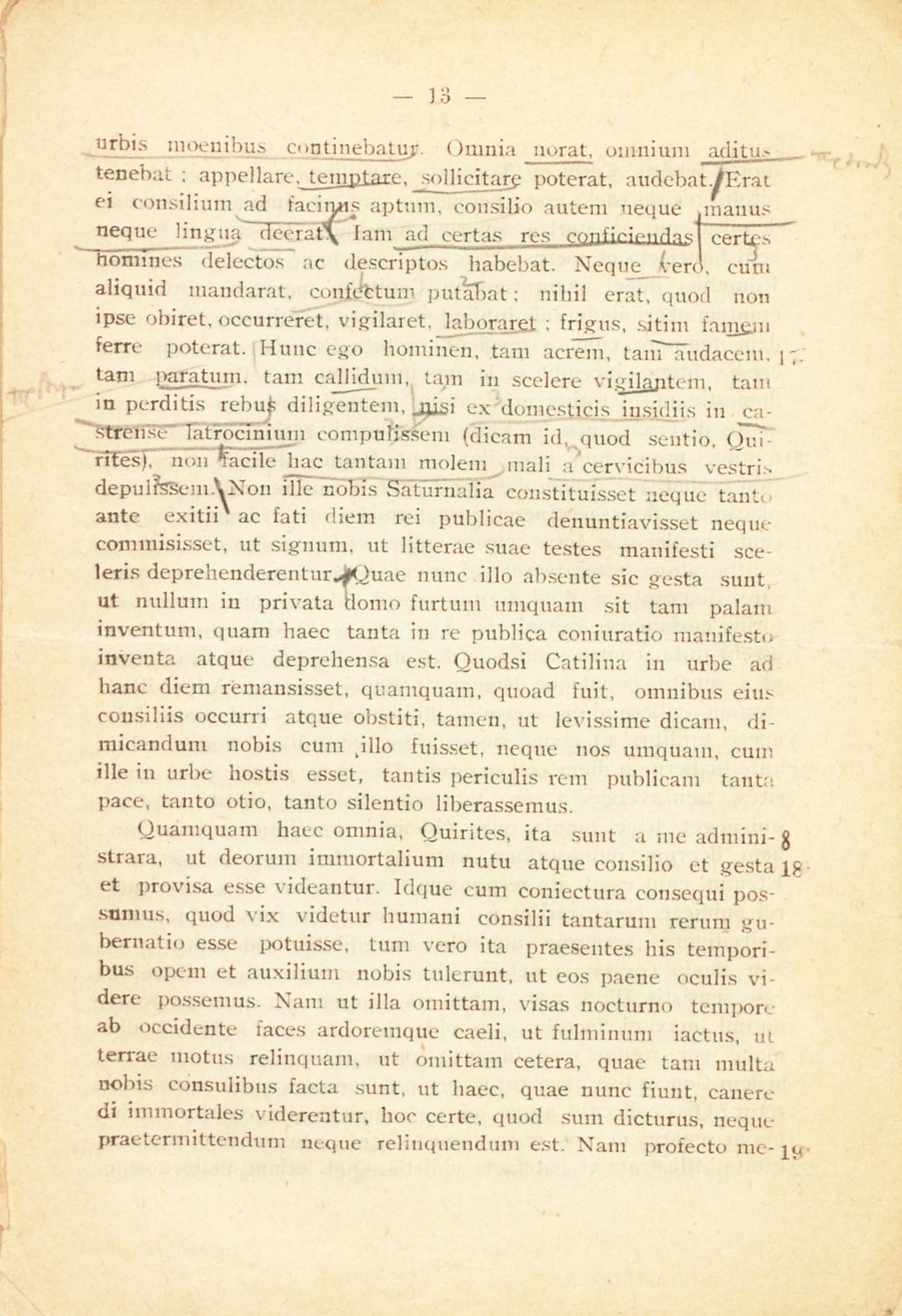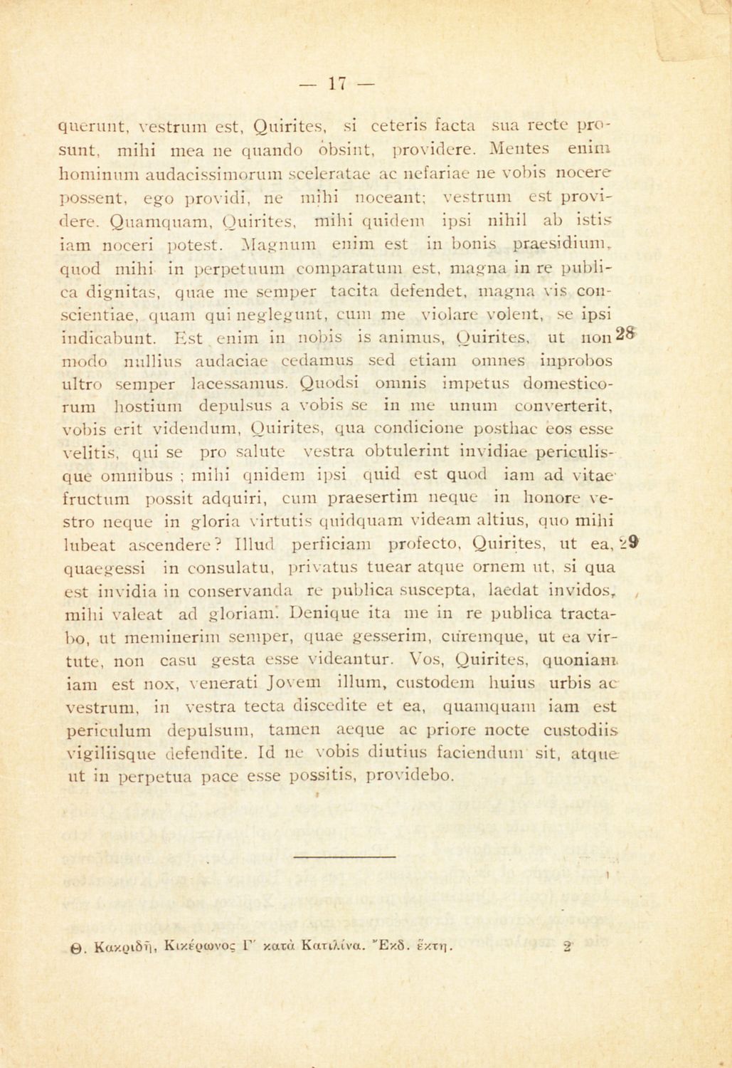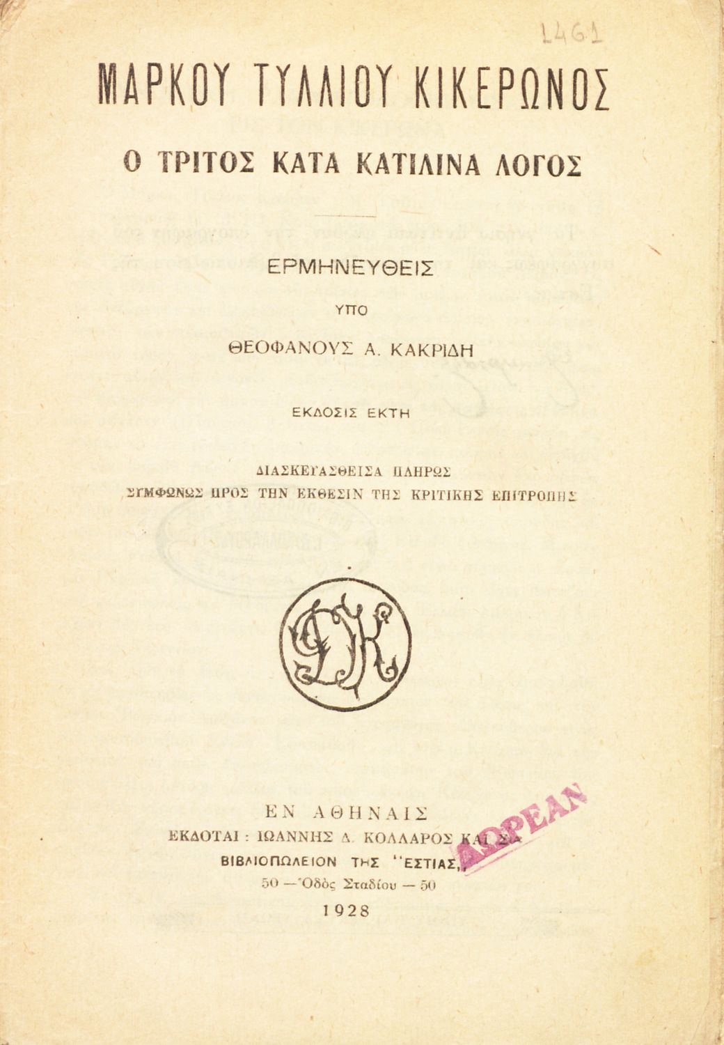 Σχολικό εγχειρίδιο Λατινικών Γ΄ Γυμνασίου που περιλαμβάνει την εισαγωγή στο έργο και τη ζωή του Κικέρωνα, το λατινικό κείμενο του Τρίτου Λόγου κατά Κατιλίνα και ερμηνευτικά, γραμματικά και πραγματολογικά σχόλια.