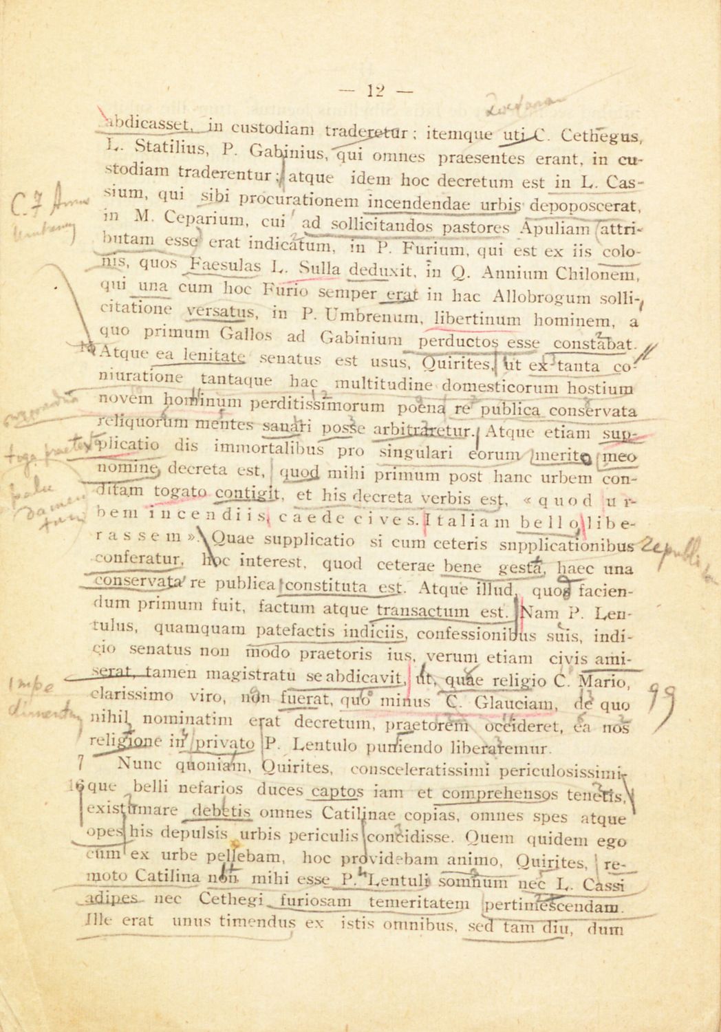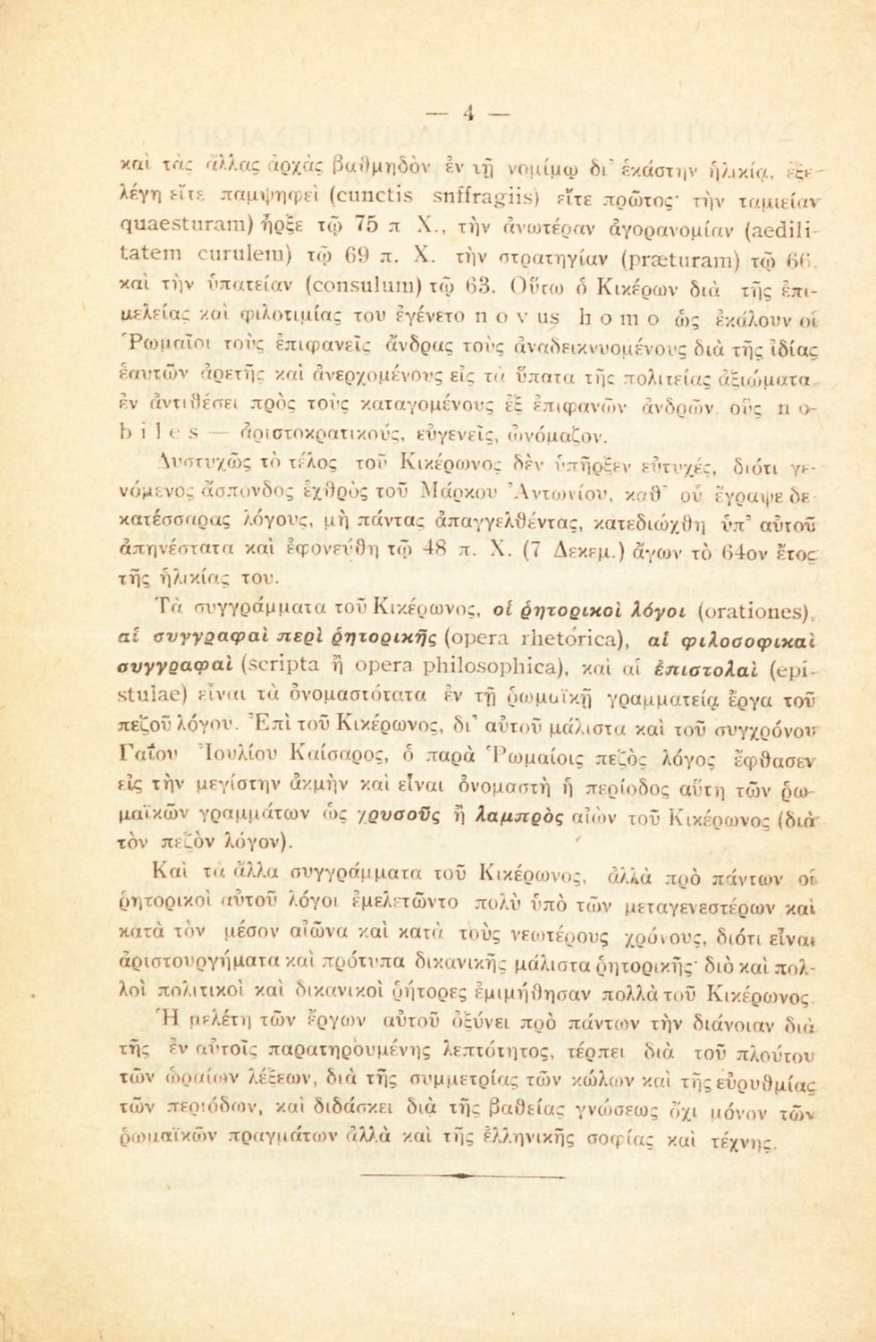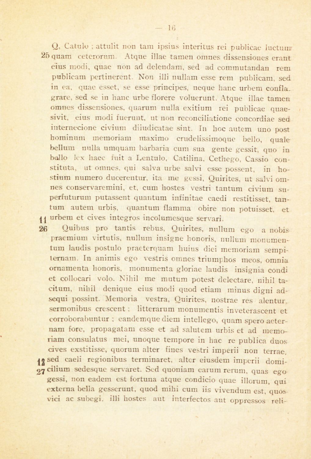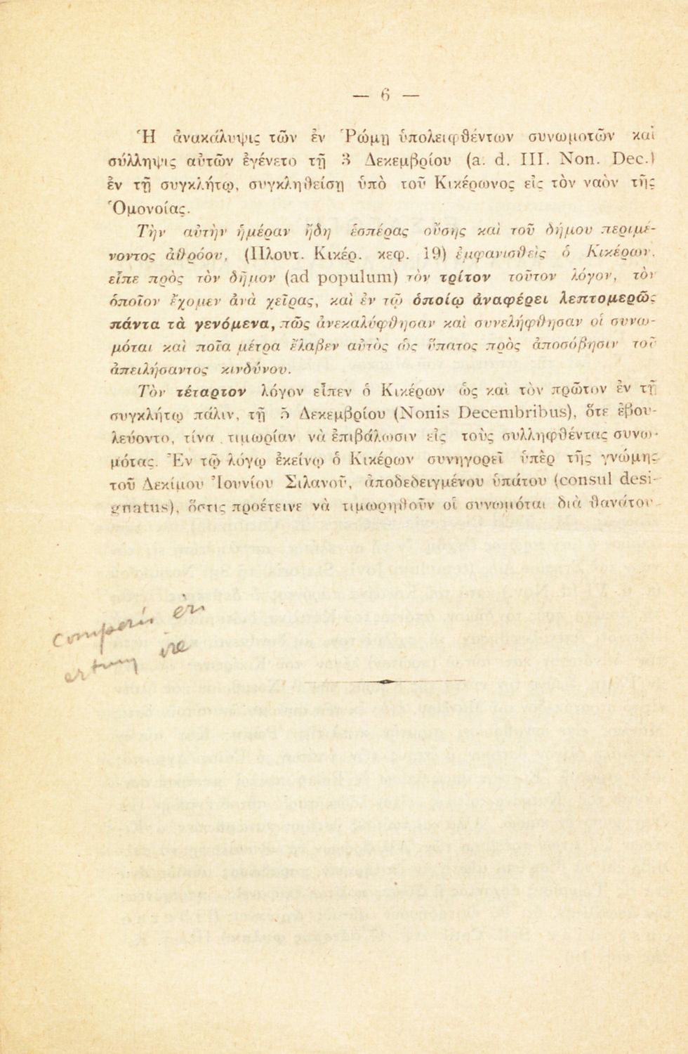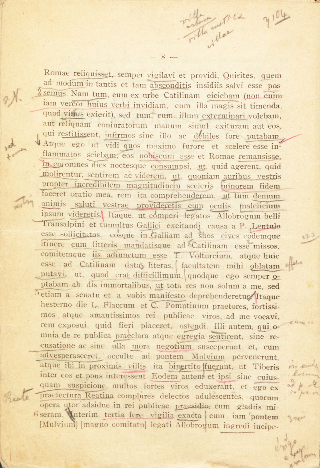 Σχολικό εγχειρίδιο Λατινικών Γ΄ Γυμνασίου που περιλαμβάνει την εισαγωγή στο έργο και τη ζωή του Κικέρωνα, το λατινικό κείμενο του Τρίτου Λόγου κατά Κατιλίνα και ερμηνευτικά, γραμματικά και πραγματολογικά σχόλια.