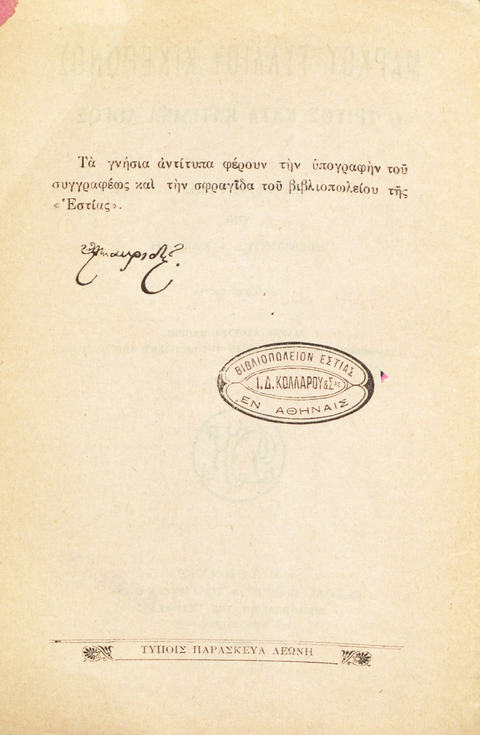 Εκδότης: Ιωάννης Δ. Κολλάρος, Βιβλιοπωλείο της "Εστίας" Έτος έκδοσης: 1928 Τόπος έκδοσης: Αθήνα Έκδοση: 6η Υπουργική απόφαση / Σύμβαση: 20986/ 18-5-1928 Έτος έγκρισης: 1928 |