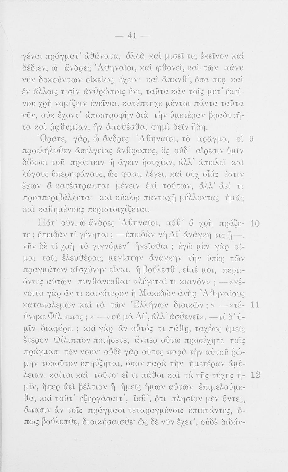 Σχολικό εγχειρίδιο Αρχαίων Ελληνικών Δ΄ Γυμνασίου που περιλαμβάνει εισαγωγή στη ζωή και στο έργο του Δημοσθένη, τον Α΄ κατά Φιλίππου, και τους Α΄ και Β΄ Ολυνθιακούς και ερμηνευτικά και ετυμολογικά σχόλια.