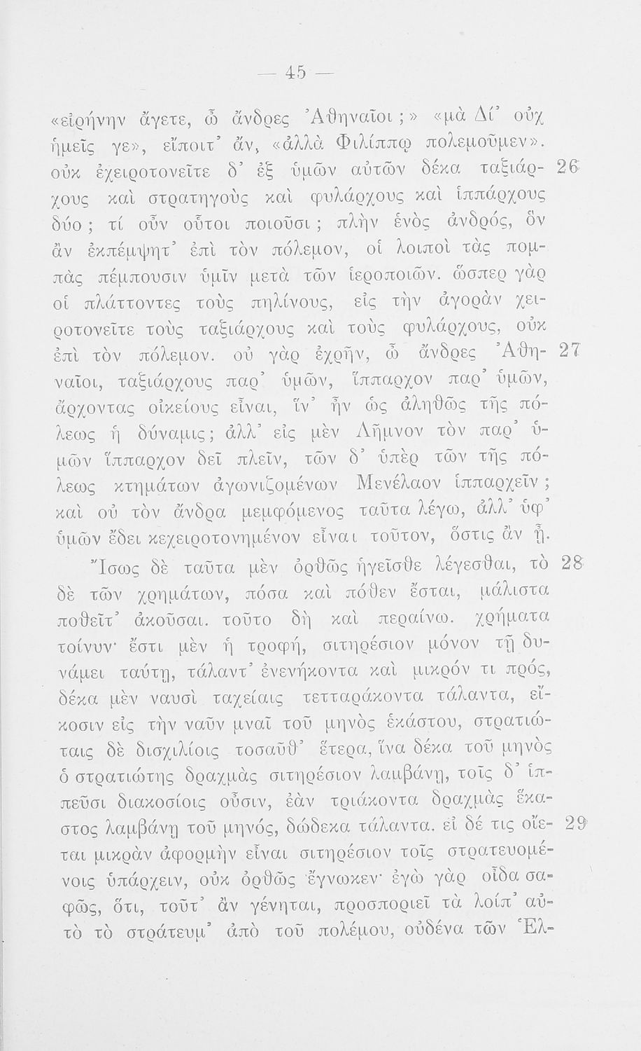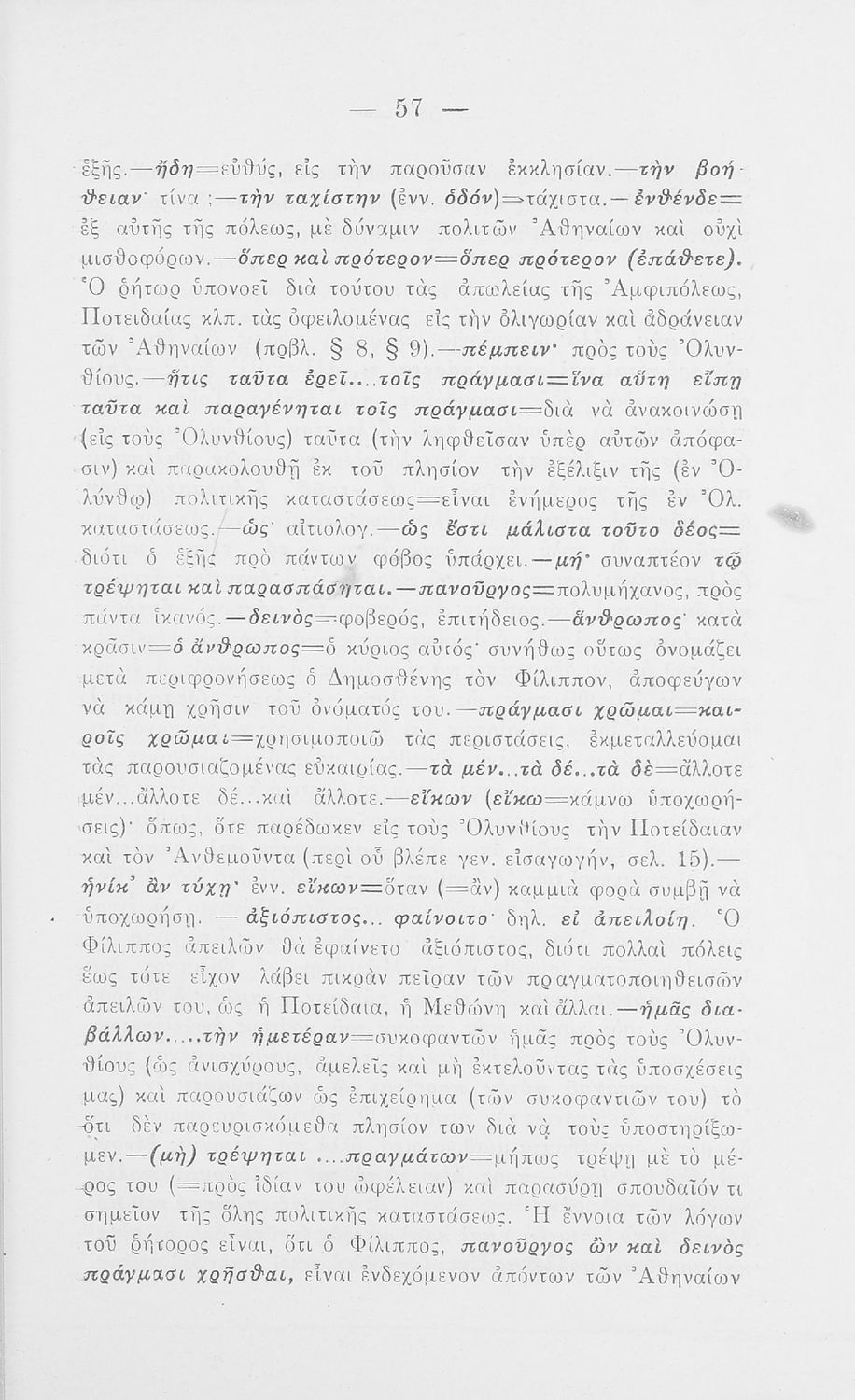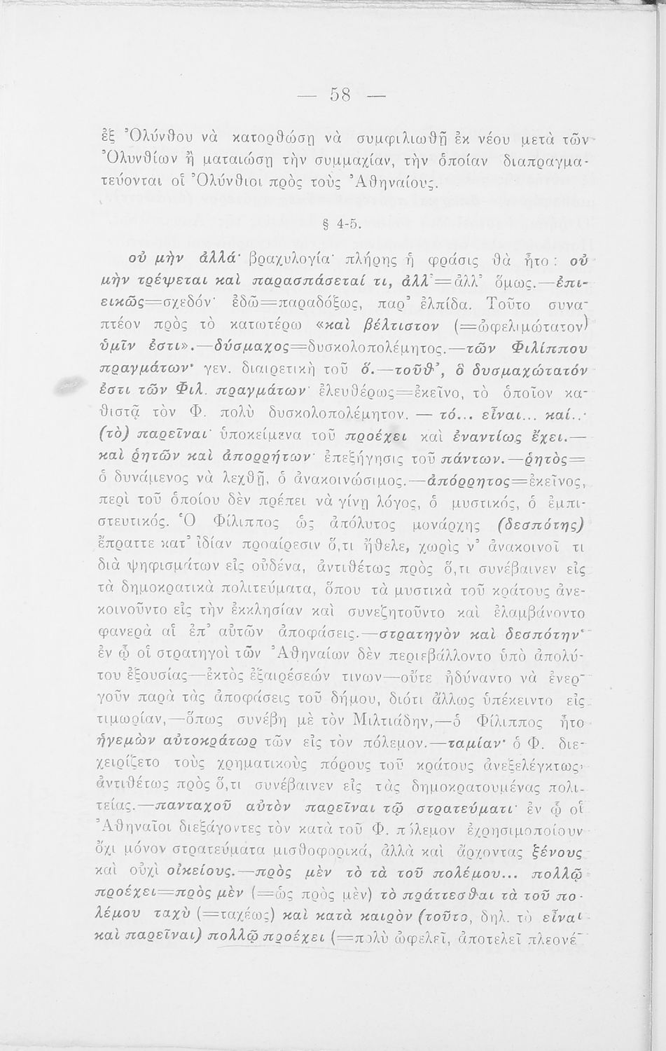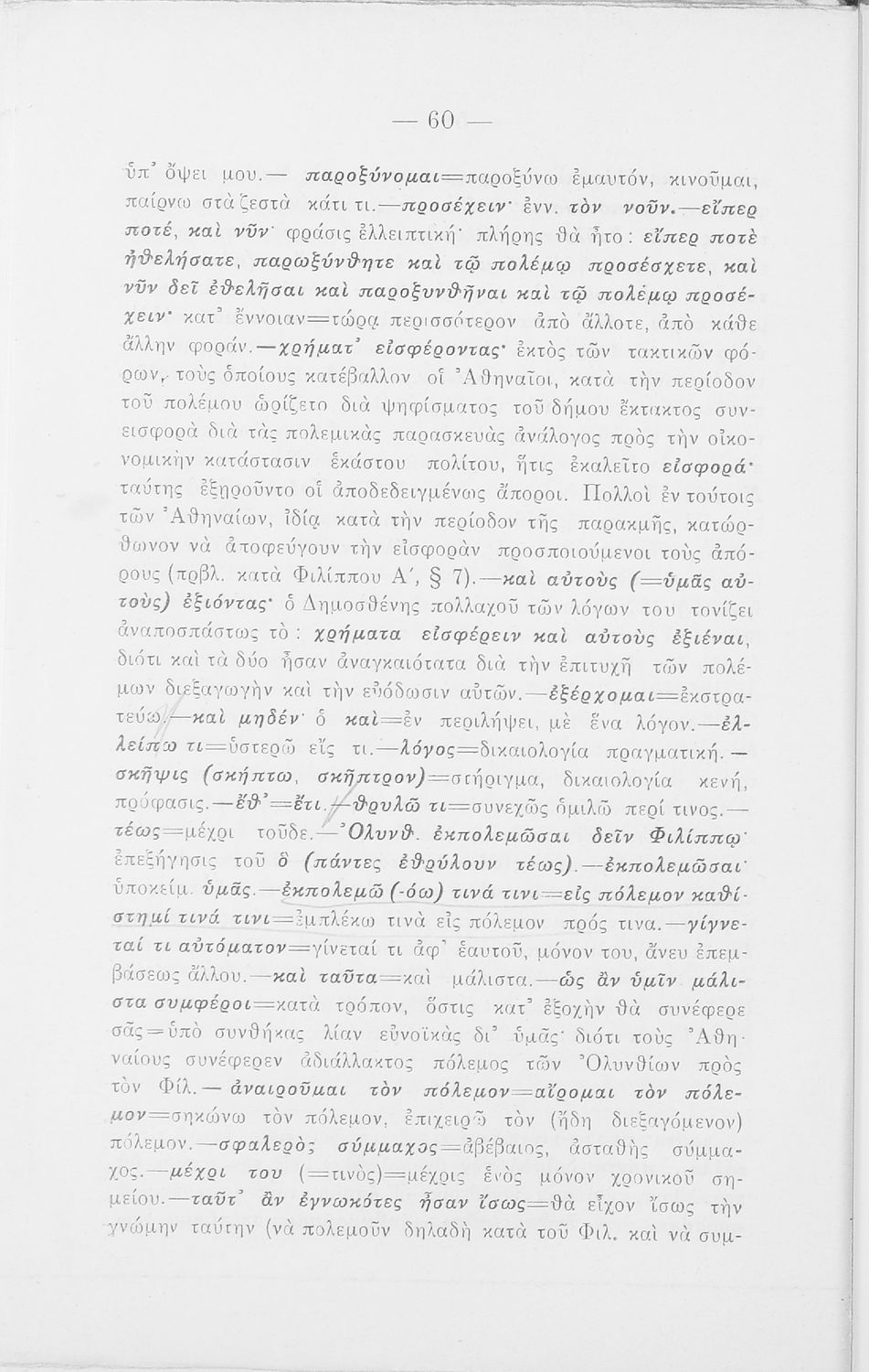 Μαθητικό βοήθημα Αρχαίων Ελληνικών της τρίτης τάξης των τετρατάξιων Γυμνασίων. Το βιβλίο περιέχει τα έργα του Δημοσθένη, Περί της ειρήνης και Α΄ Φιλιππικός από μετάφραση.