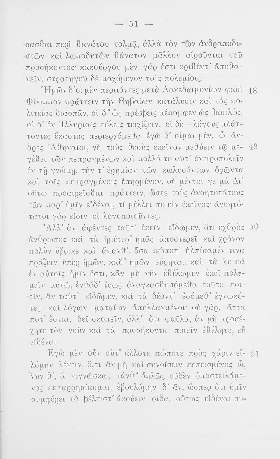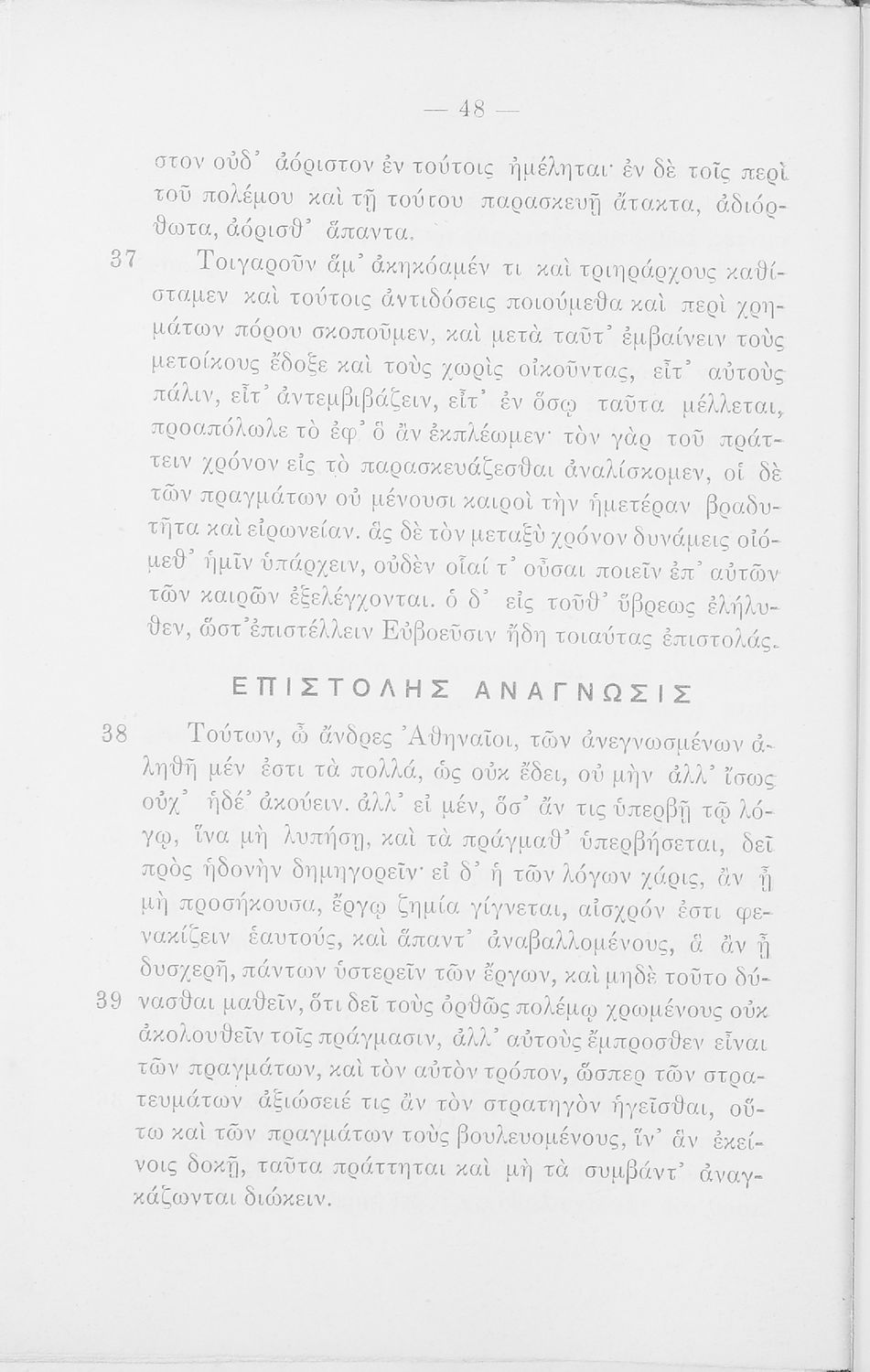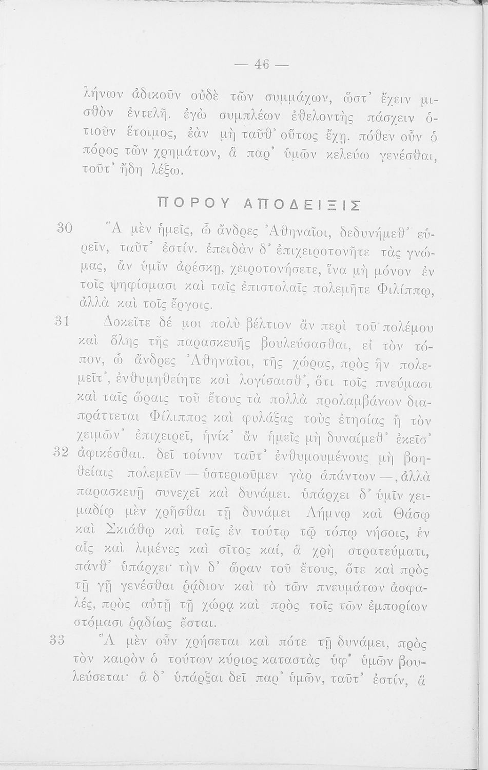 Μαθητικό βοήθημα Αρχαίων Ελληνικών της τρίτης τάξης των τετρατάξιων Γυμνασίων. Το βιβλίο περιέχει τα έργα του Δημοσθένη, Περί της ειρήνης και Α΄ Φιλιππικός από μετάφραση.
