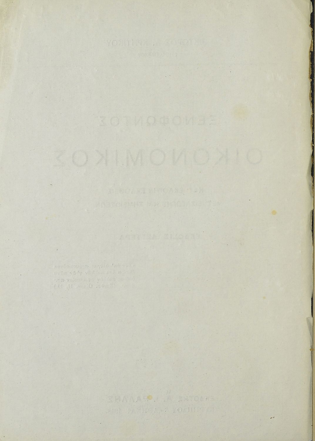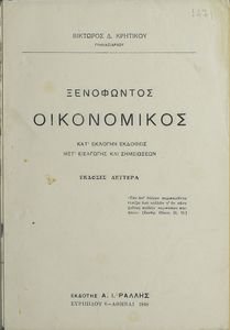 Βαθμίδα εκπαίδευσης: Δευτεροβάθμια Μάθημα: Αρχαία Ελληνικά Γλώσσα: Καθαρεύουσα Παρουσίαση περιεχομένου: Σχολικό εγχειρίδιο Αρχαίων Ελληνικών που περιλαμβάνει το έργο του Ξενοφώντα Ο Οικονομικός και εισαγωγικά και ερμηνευτικά σχόλια. |
