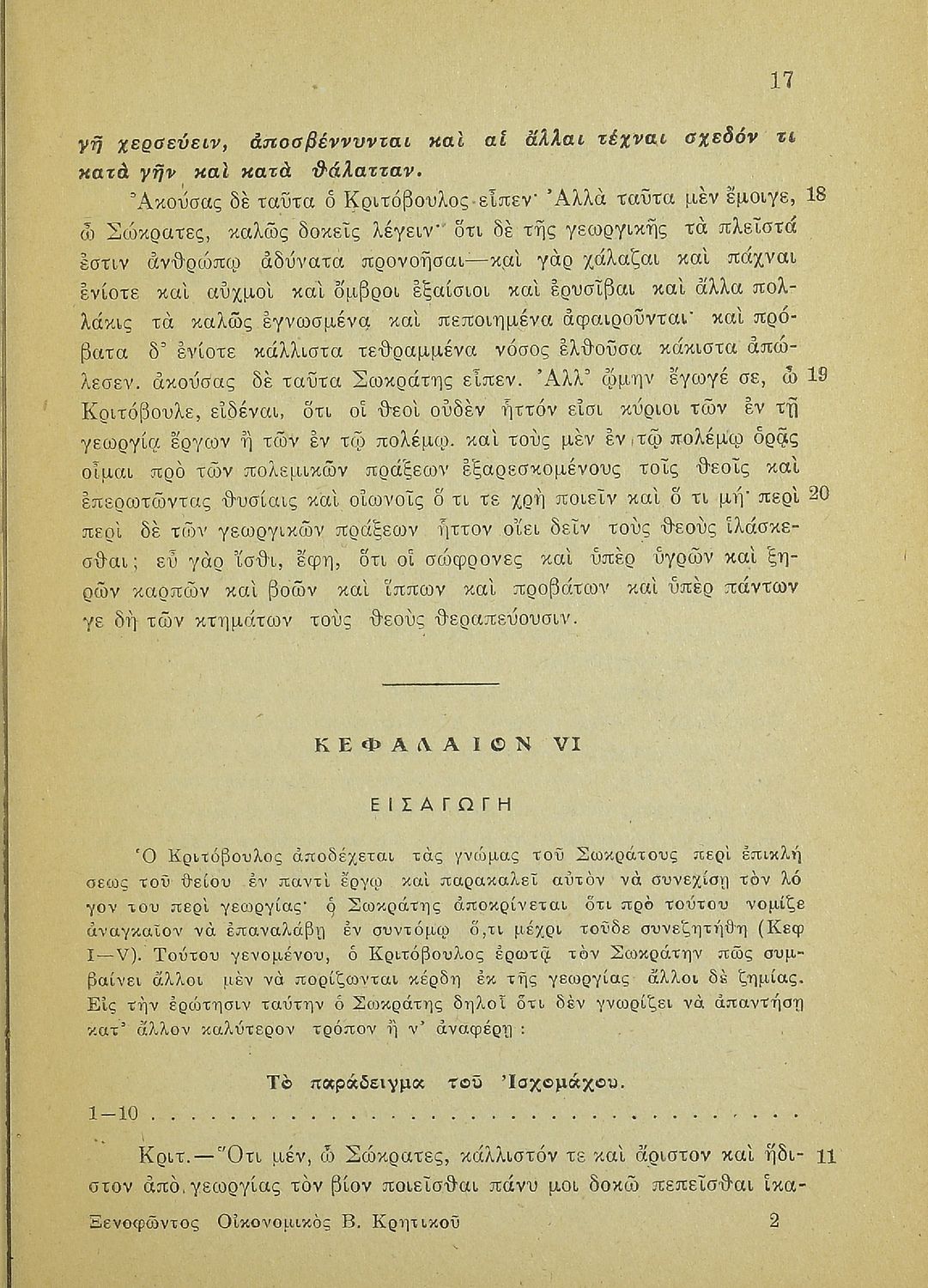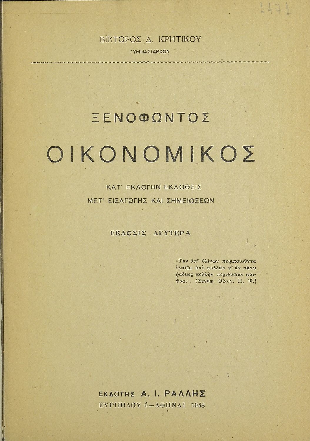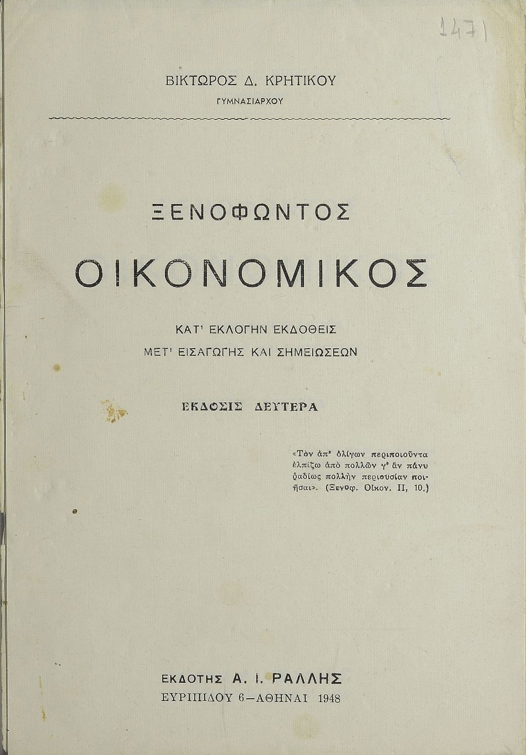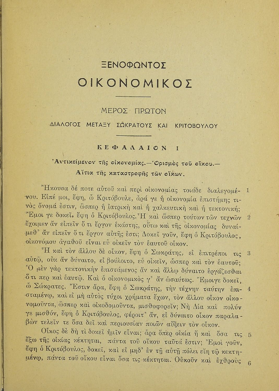 Σχολικό εγχειρίδιο Αρχαίων Ελληνικών που περιλαμβάνει το έργο του Ξενοφώντα Ο Οικονομικός και εισαγωγικά και ερμηνευτικά σχόλια.