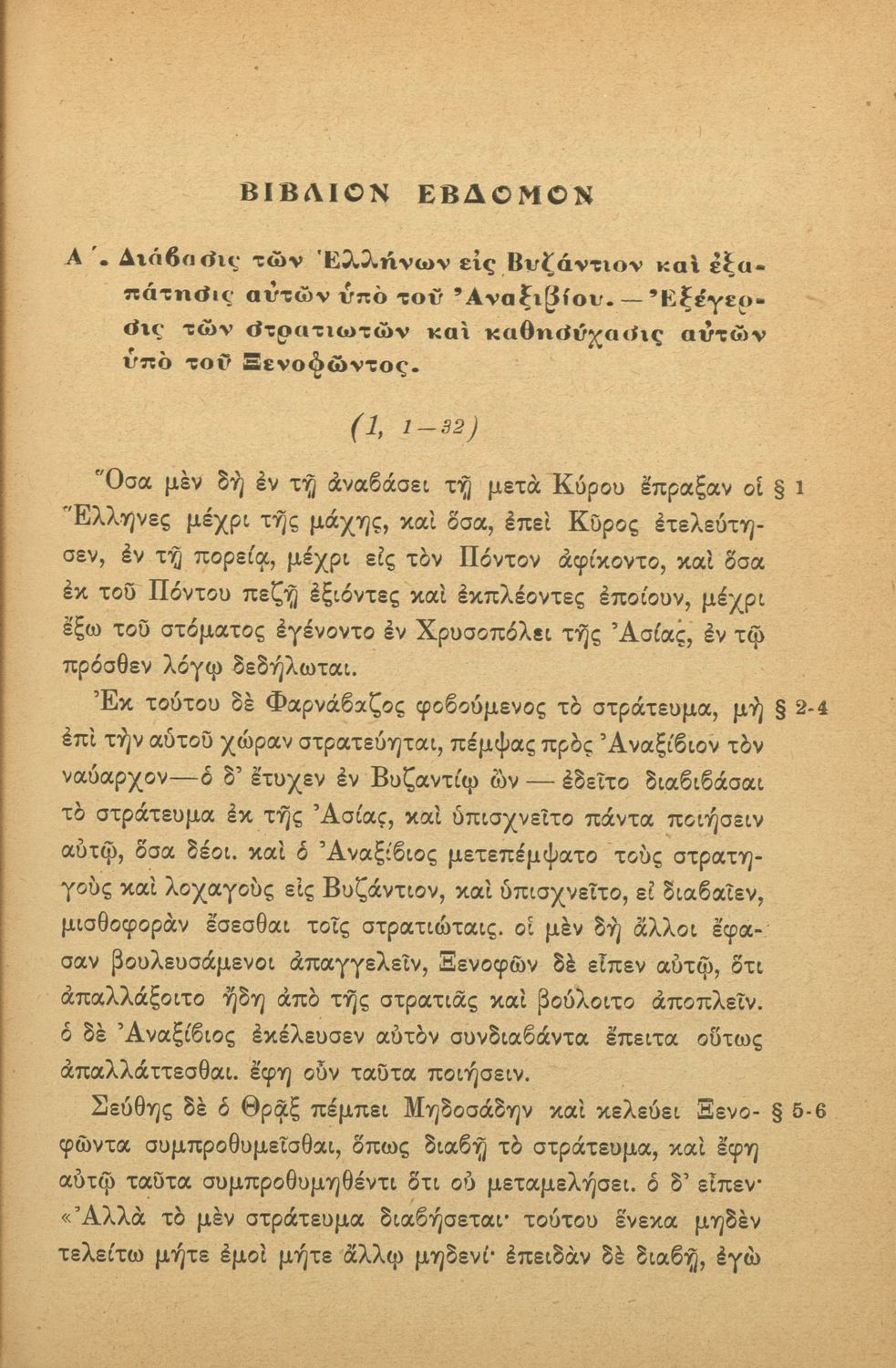 Σχολικό εγχειρίδιο Αρχαίων Ελληνικών για τις Γ΄ Ελληνικών Σχολείων και Α΄ Αστικών Σχολείων Θηλέων που περιλαμβάνει το έργο του Ξενοφώντα Κύρου Ανάβασις, εισαγωγικά σχόλια για τη ζωή και το έργο του, ...
