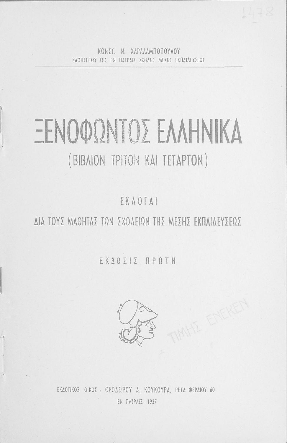 Τίτλος: Ξενοφώντος Ελληνικά (βιβλίον τρίτον και τέταρτον) εκλογαί διά τους μαθητάς των σχολείων της Μέσης Εκπαιδεύσεως