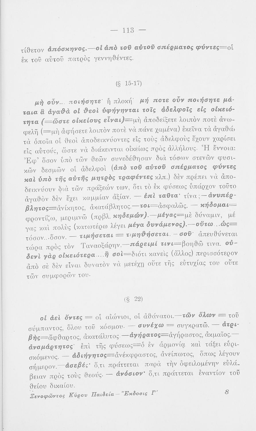 Σχολικό εγχειρίδιο της Γ' Γυμνασίου των Εξατάξιων Γυμνασίων για το μάθημα των Αρχαίων. Περιλαμβάνει κείμενα κατ΄ επιλογή από το έργο Κύρου Παιδεία από το πρωτότυπο και συνοδευμένα από τη μετάφραση του ...
