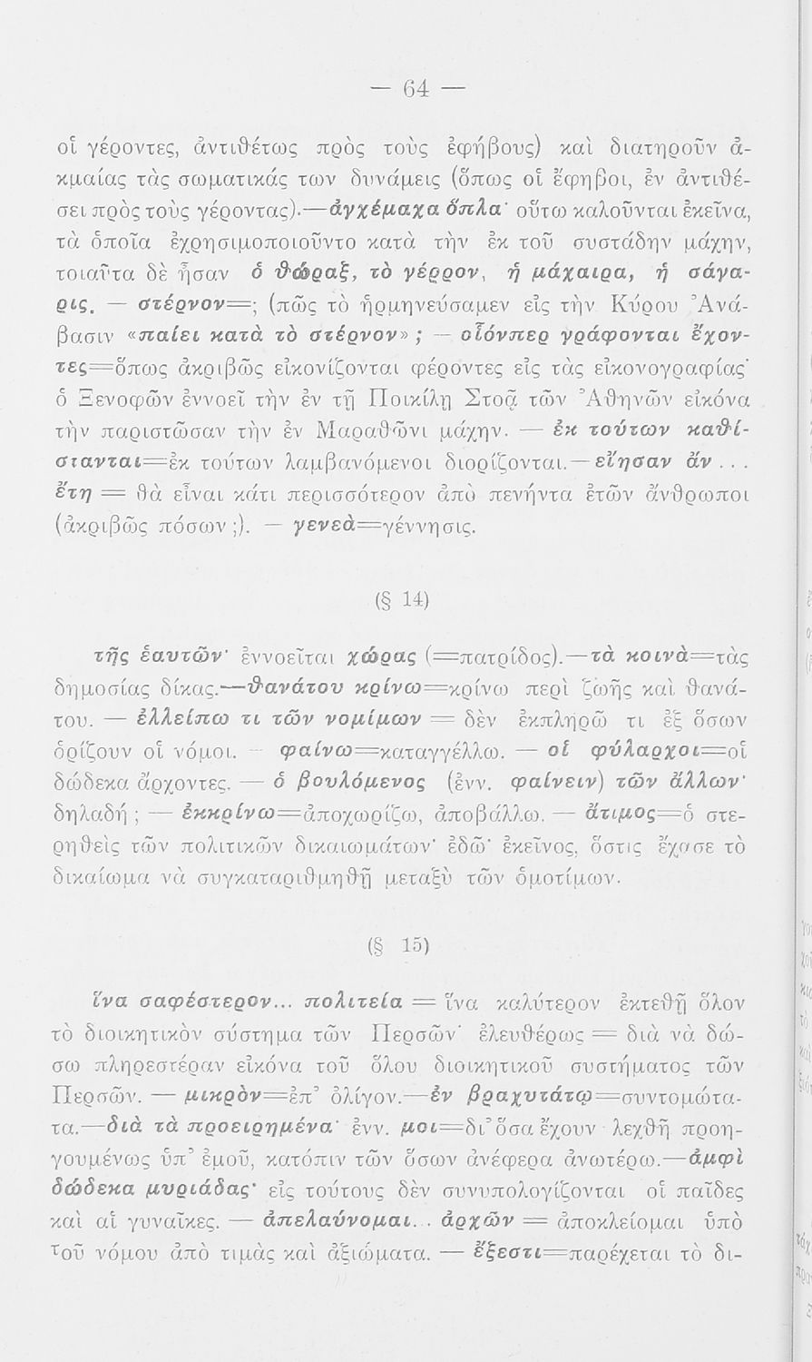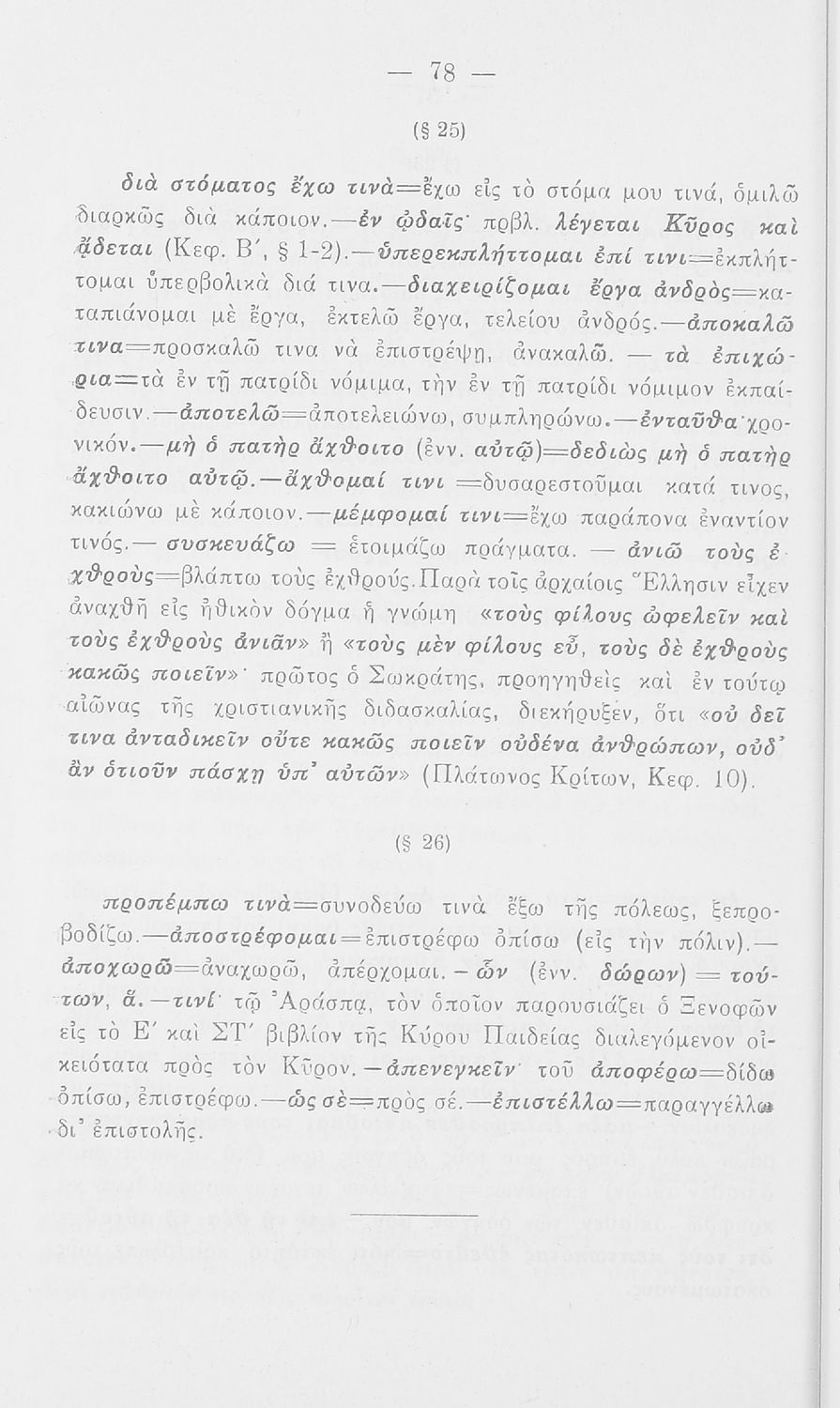 Σχολικό εγχειρίδιο Αρχαίων Ελληνικών για την Γ΄ Εξαταξίου Γυμνασίου που περιλαμβάνει εισαγωγή στη ζωή και το έργο του Ξενοφώντα, αποσπάσματα από το Κύρου Παιδεία, ερμηνευτικές σημειώσεις, σκίτσα που απεικονίζουν πολεμικά όπλα της εποχής και χωρογραφικό πίνακα της περιοχής.