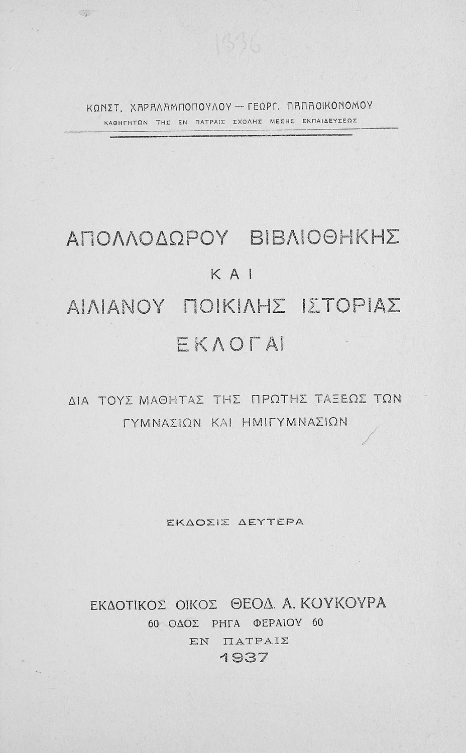 Εκδότης: Θεοδ. Α. Κούκουρας Έτος έκδοσης: 1937 Τόπος έκδοσης: Πάτρα Έκδοση: 2η |