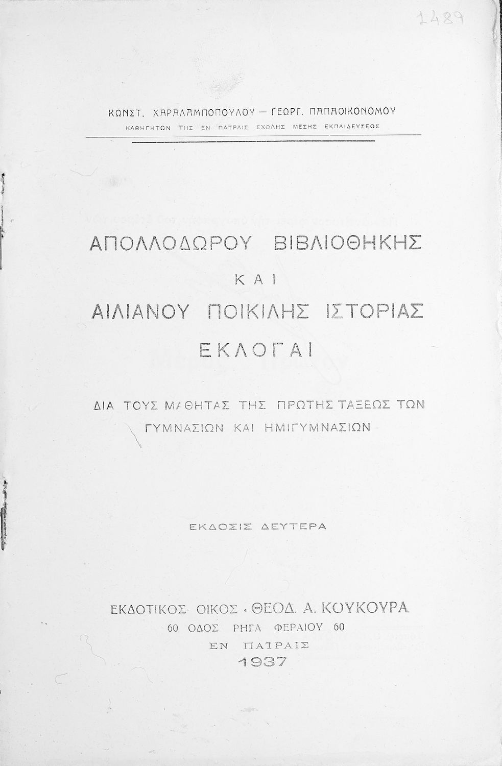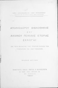 Τίτλος: Απολλοδώρου Βιβλιοθήκης και Αιλιανού Ποικίλης Ιστορίας Εκλογαί δια τους μαθητάς της πρώτης τάξεως των Γυμνασίων και Ημιγυμνασίων