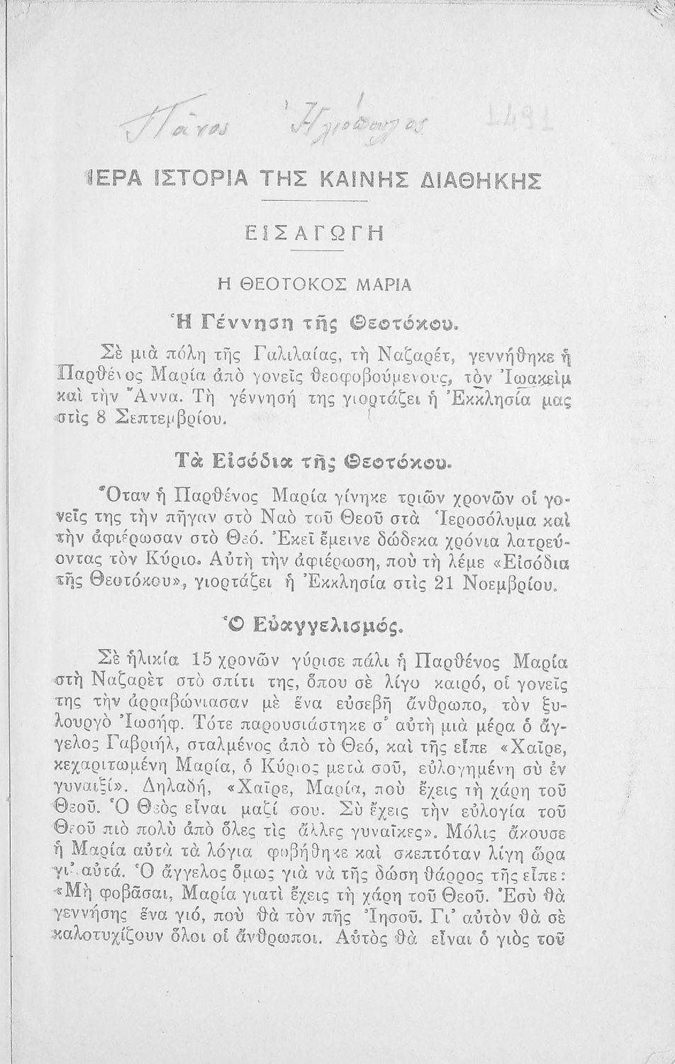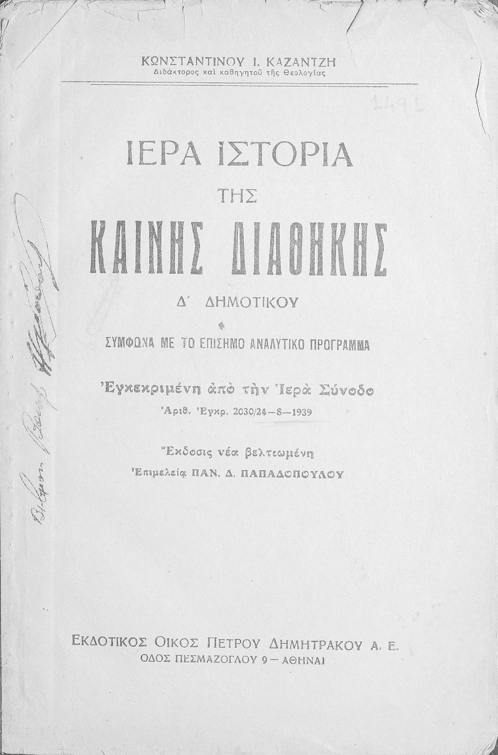 LDR 01095 2200205 4500 035 ## _a20-01491 040 ## _aΚΕΝΕΚ - Εταιρεία Σπουδών Νεοελληνικού Πολιτισμού και Παιδείας 041 ## _ael 100 ## _aΚωνσταντίνος Ι. Καζαντζής 110 ## _a1491 245 0# _aΙερά Ιστορία της Καινής Διαθήκης Δ΄ Δημοτικού 260 ## _aΑθήνα _bΠέτρος Δημητράκος _c1939 300 ## _a49 _bΣκίτσα (ασπρόμαυρα) _c22 520 ## _aΣχολικό εγχειρίδιο Θρησκευτικών Δ΄ Δημοτικού που συνιστά μία εξιστόρηση της Καινής Διαθήκης από τη γέννηση της Θεοτόκου ως την ανάληψη του Χριστού. 521 ## _aΔ' Δημοτικού 522 ## _aΕλλάδα 546 ## _aΔημοτική 563 ## _aΜαλακό Εξώφυλλο 583 ## _a2030/24-8-1939 _c1939 650 #4 _aΘαύματα _aΙωάννης ο Πρόδρομος _aΠαραβολές _aΣταύρωση