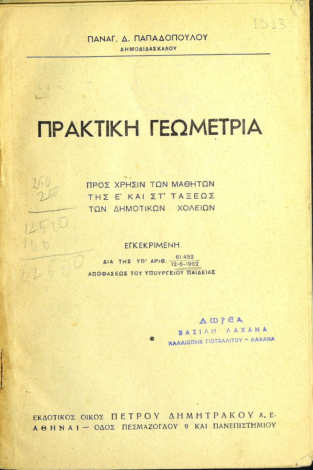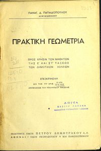 Κωδικός αναγνώρισης: 20-01513 Τίτλος: Πρακτική γεωμετρία προς χρήσιν των μαθητών της Ε΄ και ΣΤ΄ τάξεως των Δημοτικών Σχολείων Συγγραφέας: Παναγ. Δ. Παπαδόπουλος Μέγεθος και υπόστρωμα: Μαθητικό βοήθημα, 20εκ., μαλακό εξώφυλλο, 100 σελίδες. Εξώφυλλο (έγχρωμο). |
