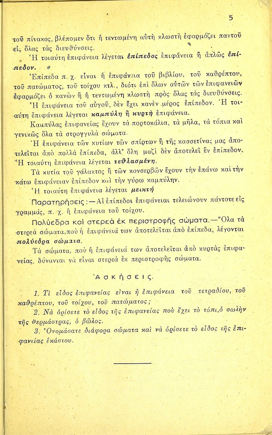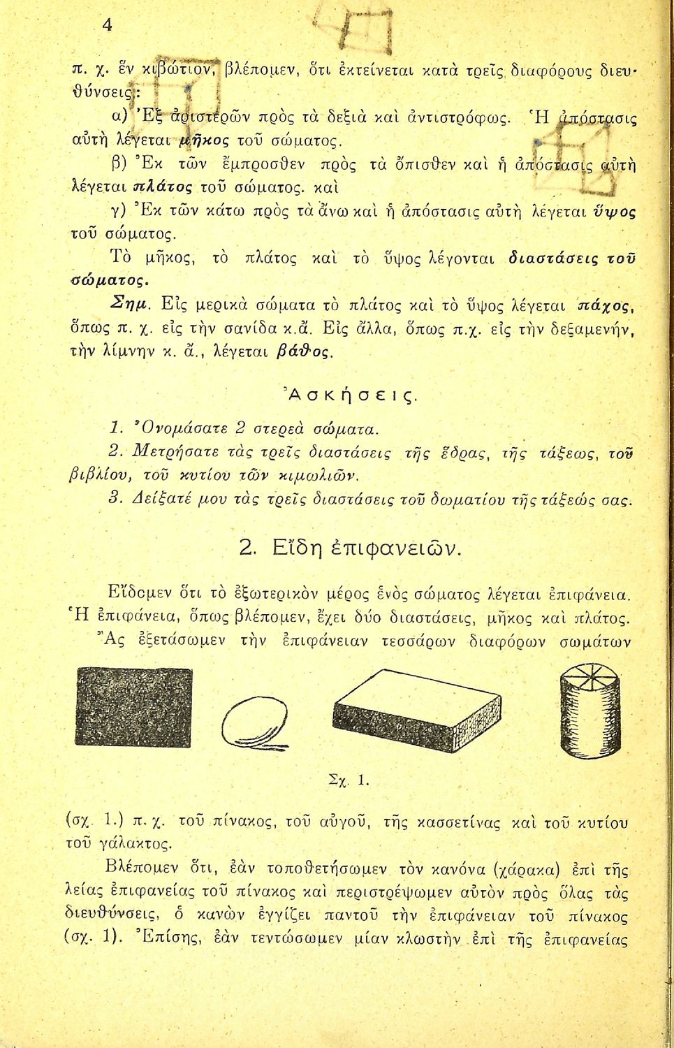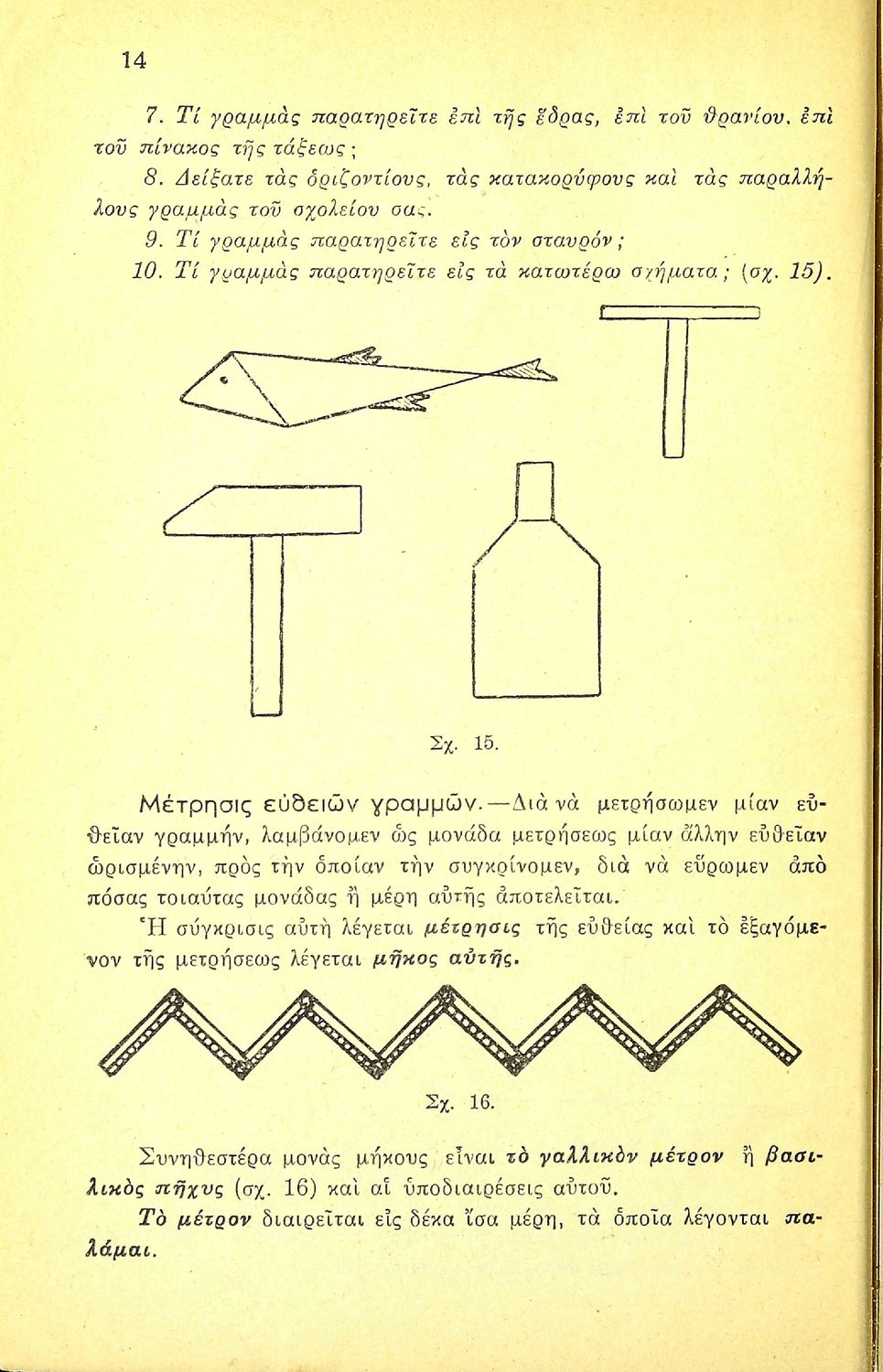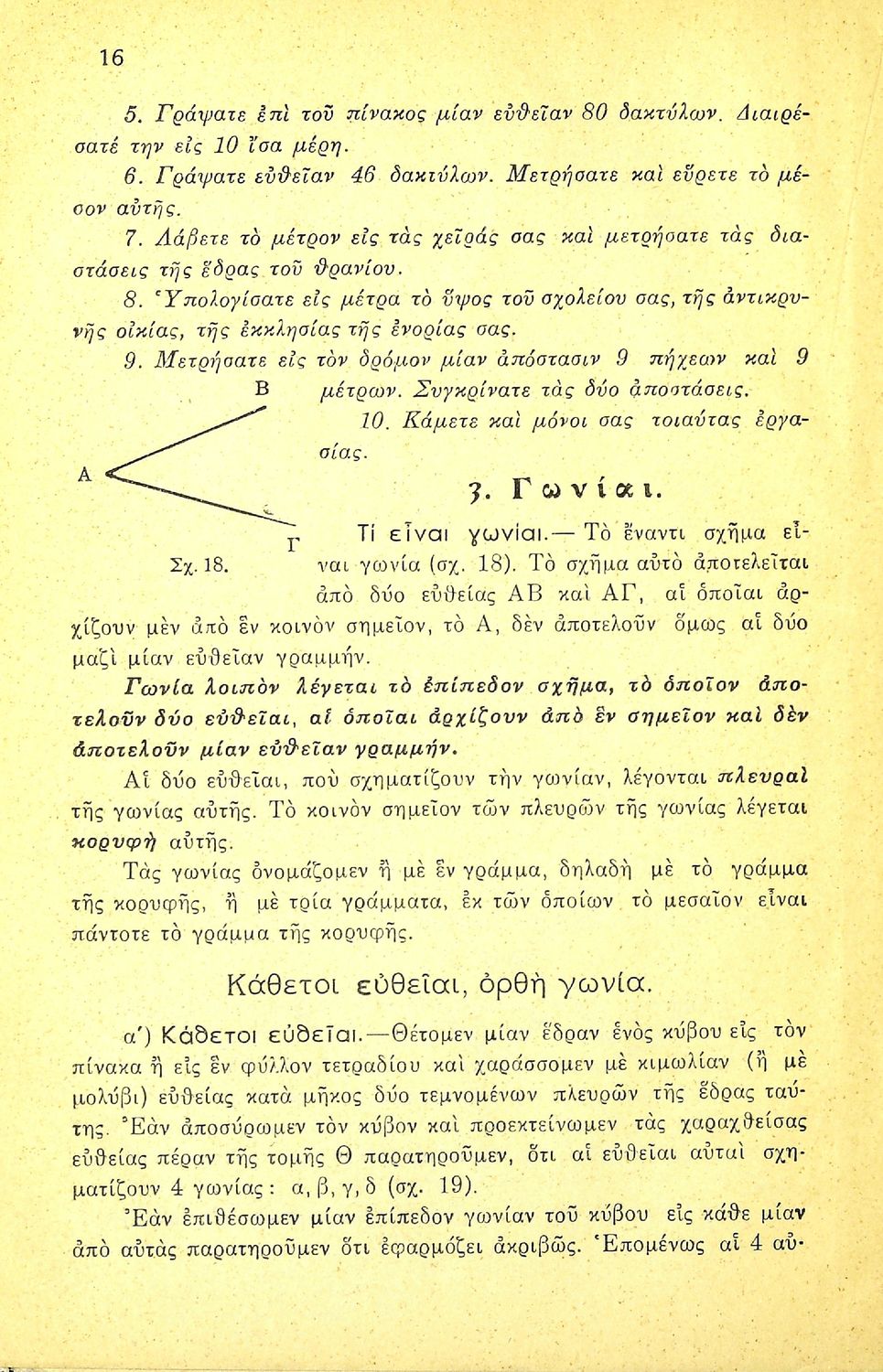Βαθμίδα εκπαίδευσης: Πρωτοβάθμια Τάξη: Ε' Δημοτικού / ΣΤ' Δημοτικού Μάθημα: Γεωμετρία Γλώσσα: Καθαρεύουσα Παρουσίαση περιεχομένου: Μαθητικό βοήθημα Γεωμετρίας Ε΄ και ΣΤ΄ Δημοτικού που περιλαμβάνει θεωρία, παραδείγματα, ασκήσεις και προβλήματα και εστιάζει στα γεωμετρικά σχήματα και σώματα και στην μέτρησή τους. |
