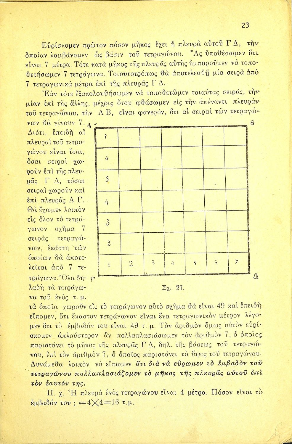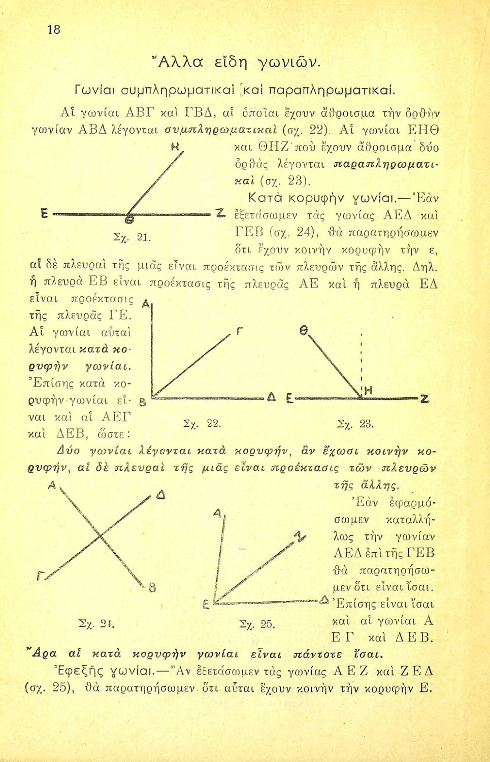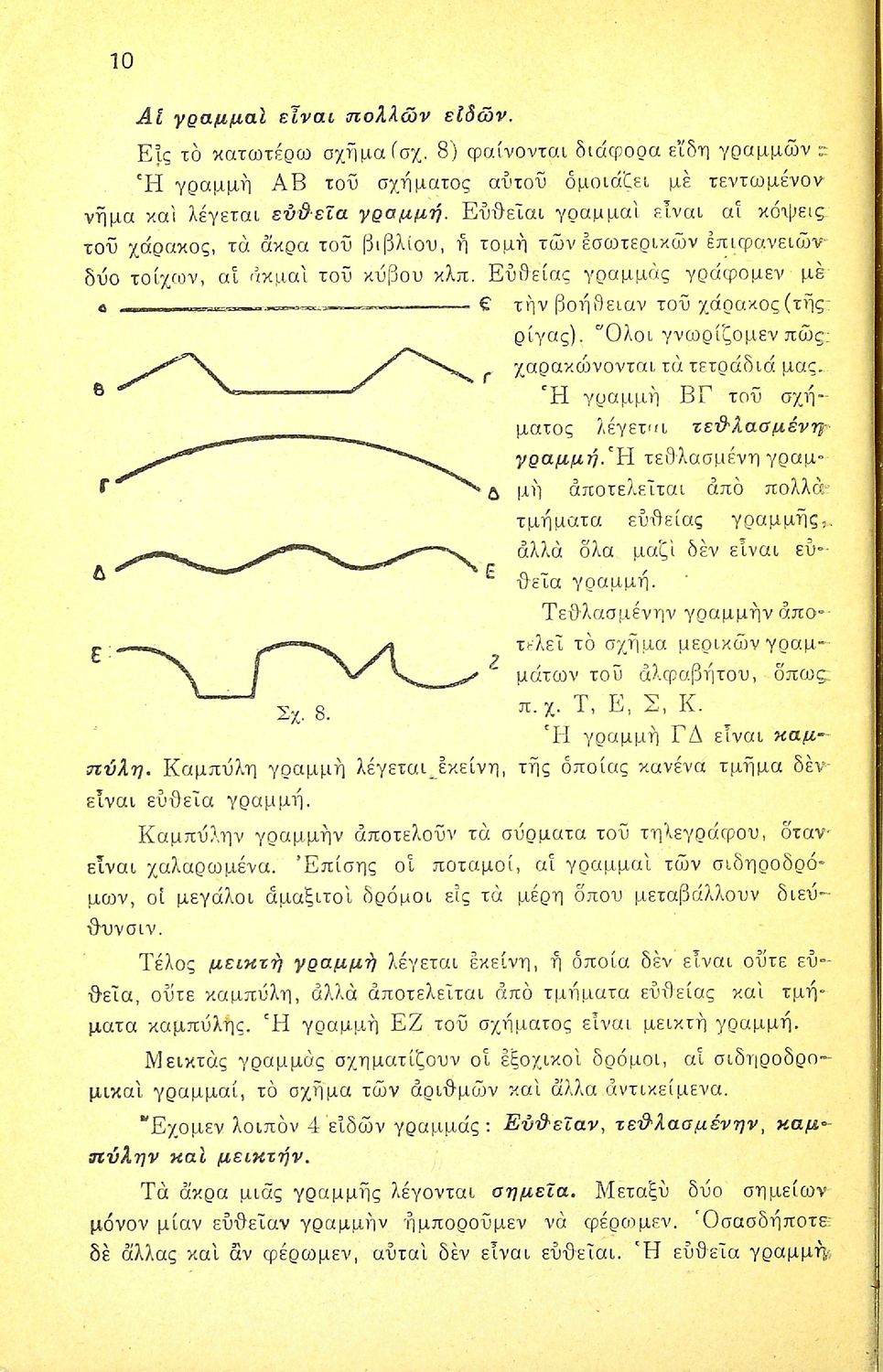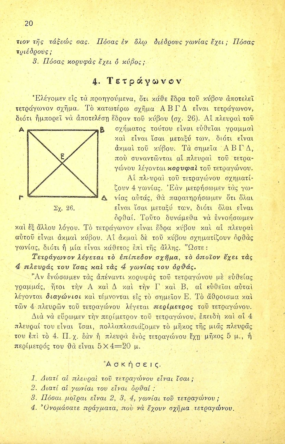 Βαθμίδα εκπαίδευσης: Πρωτοβάθμια Τάξη: Ε' Δημοτικού / ΣΤ' Δημοτικού Μάθημα: Γεωμετρία Γλώσσα: Καθαρεύουσα Παρουσίαση περιεχομένου: Μαθητικό βοήθημα Γεωμετρίας Ε΄ και ΣΤ΄ Δημοτικού που περιλαμβάνει θεωρία, παραδείγματα, ασκήσεις και προβλήματα και εστιάζει στα γεωμετρικά σχήματα και σώματα και στην μέτρησή τους. |