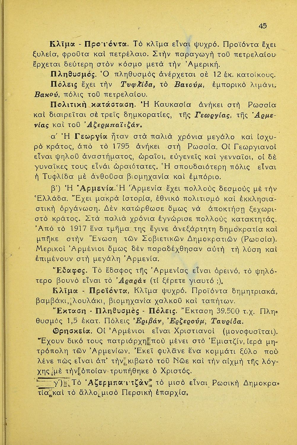 Μαθητικό βοήθημα Γεωγραφίας Ε΄ Δημοτικού που πραγματεύεται την σύσταση και δομή της Γης, τις ηπείρους πλην της Ευρώπης και τις μεγαλύτερες πληθυσμιακά πόλεις κατά το 1920. Περιέχει και συγκριτική μελέτη για ...