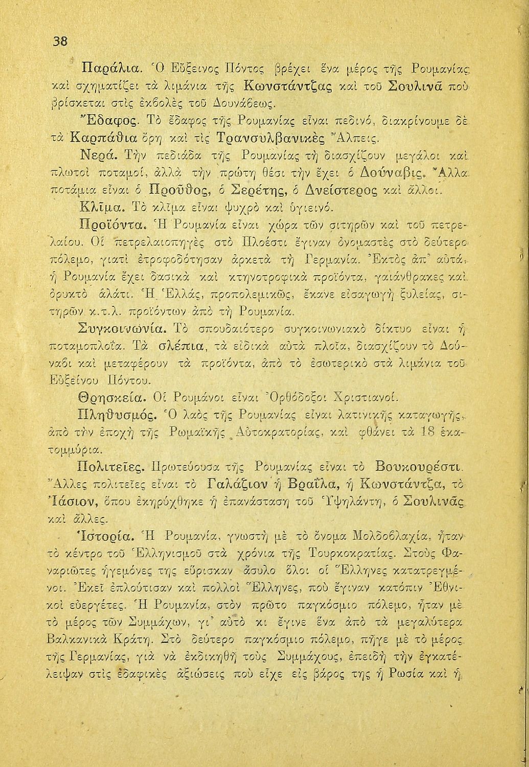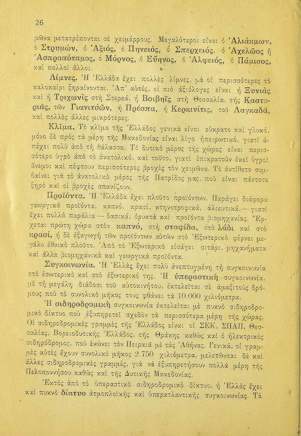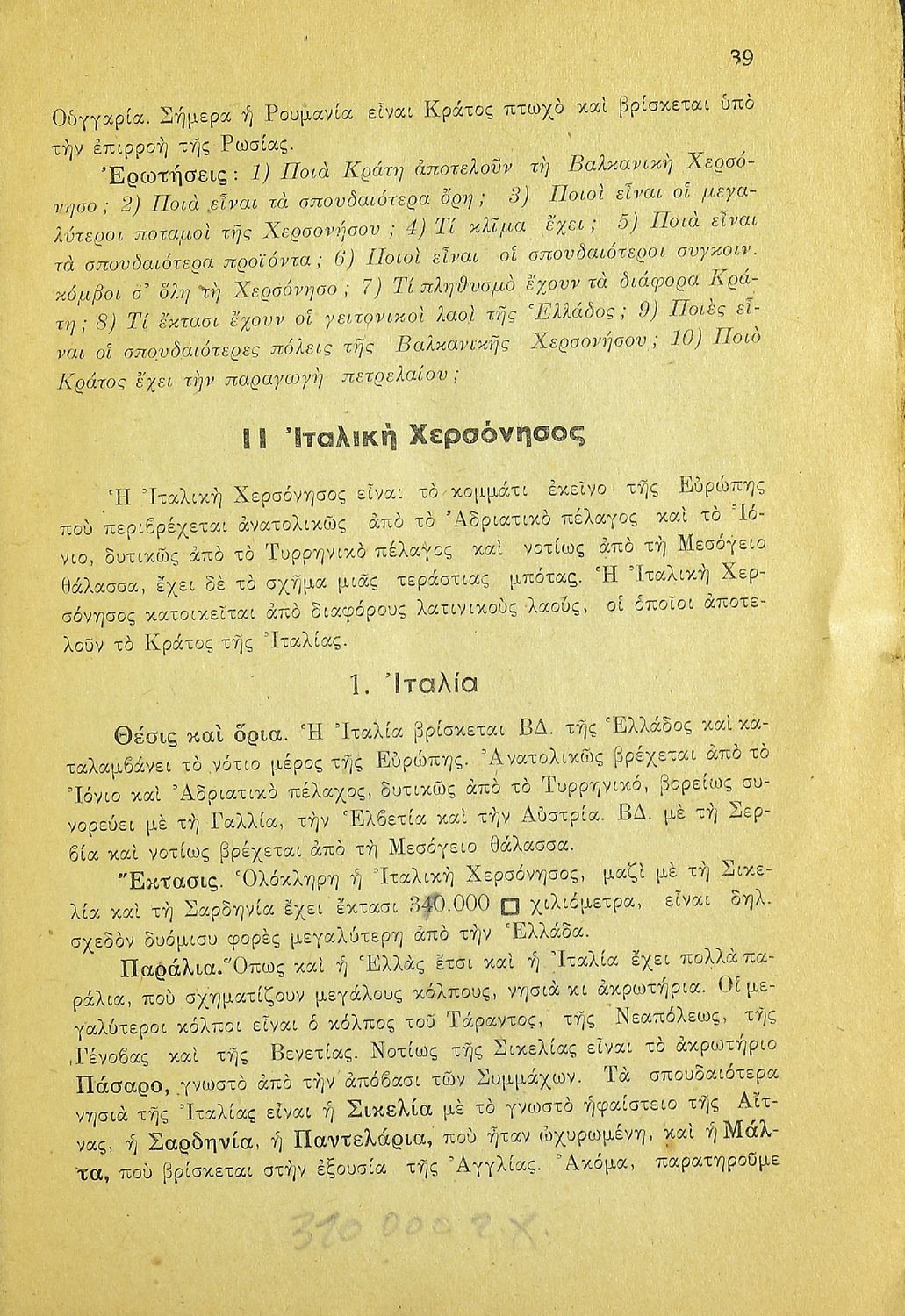 Βαθμίδα εκπαίδευσης: Πρωτοβάθμια Τάξη: ΣΤ' Δημοτικού Μάθημα: Γεωγραφία Γλώσσα: Απλή καθαρεύουσα Παρουσίαση περιεχομένου: Μαθητικό βοήθημα Γεωγραφίας ΣΤ΄ Γυμνασίου που περιέχει στοιχεία φυσικής και μαθηματικής γεωγραφίας και εξετάζει τα κράτη της Ευρώπη από γεωφυσική, πολιτική και οικονομική άποψη. Περιλαμβάνει και στοιχεία ανθρωπογεωγραφίας. |
