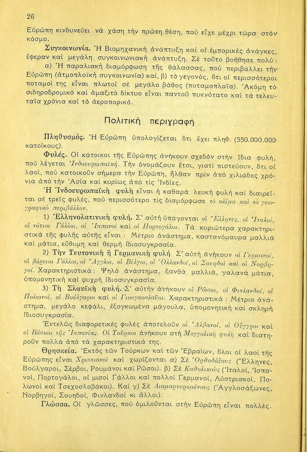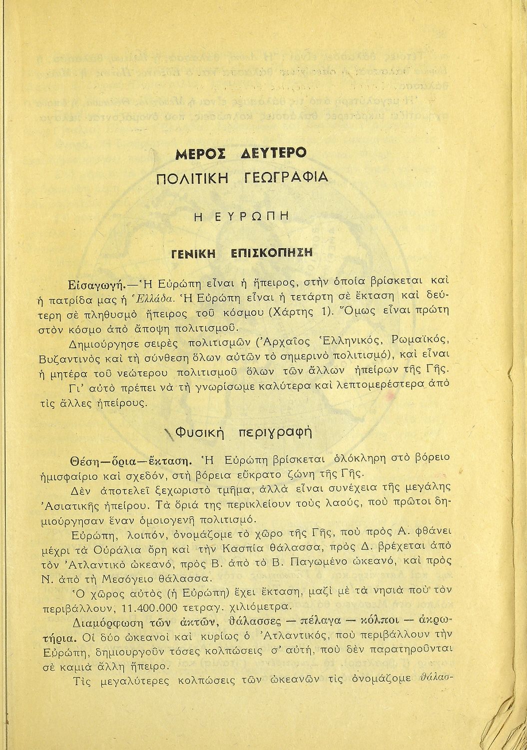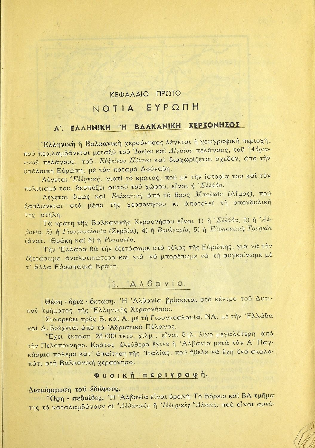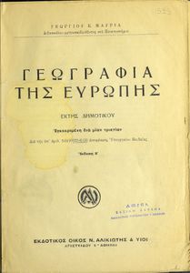 Βαθμίδα εκπαίδευσης: Πρωτοβάθμια Τάξη: ΣΤ' Δημοτικού Μάθημα: Γεωγραφία Γλώσσα: Δημοτική με στοιχεία καθαρεύουσας Παρουσίαση περιεχομένου: Μαθητικό βοήθημα Γεωγραφίας ΣΤ΄ Γυμνασίου που περιέχει στοιχεία φυσικής και μαθηματικής γεωγραφίας και εξετάζει τα κράτη της Ευρώπη από γεωφυσική, πολιτική και οικονομική άποψη. Περιλαμβάνει και στοιχεία ανθρωπογεωγραφίας. |