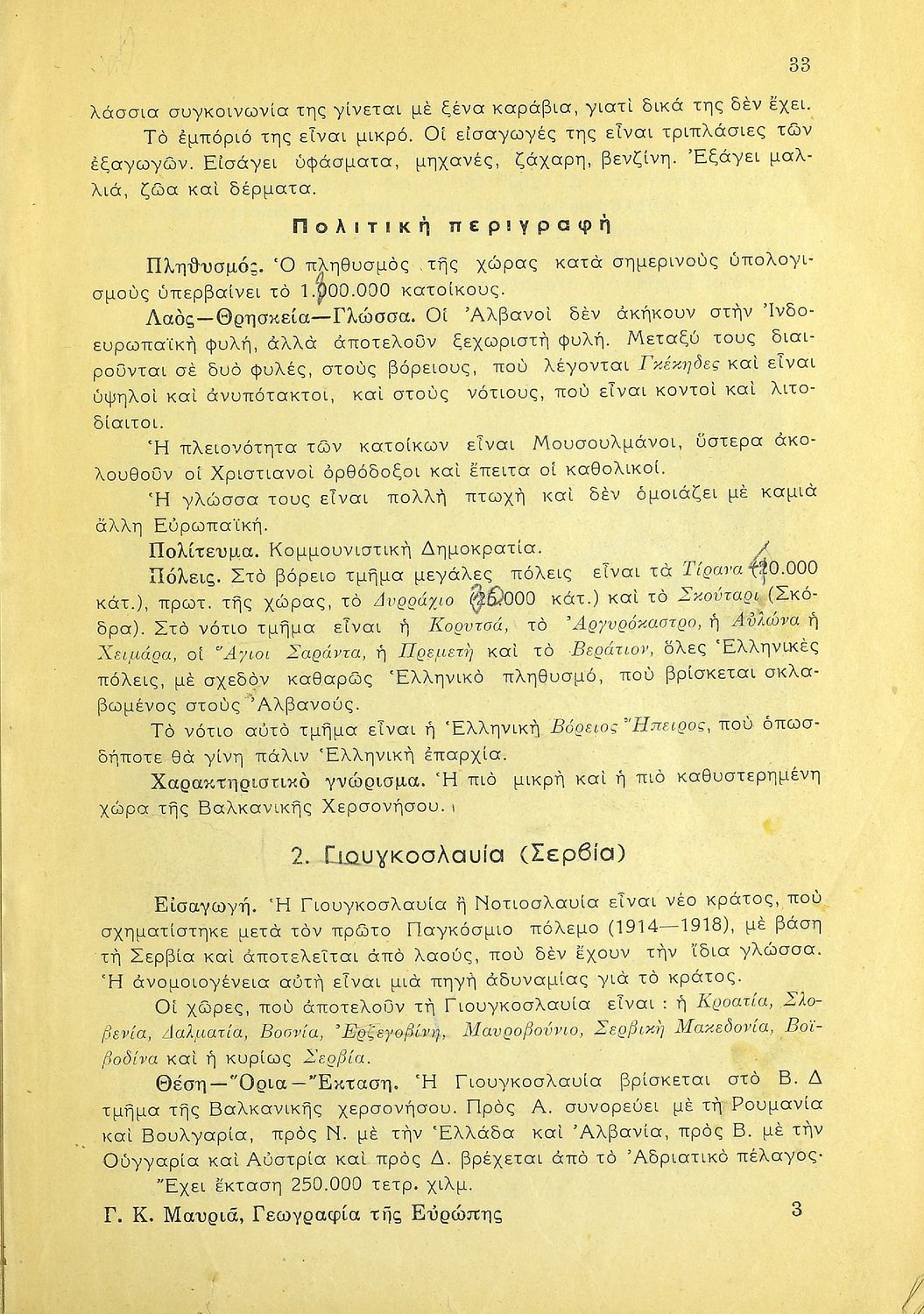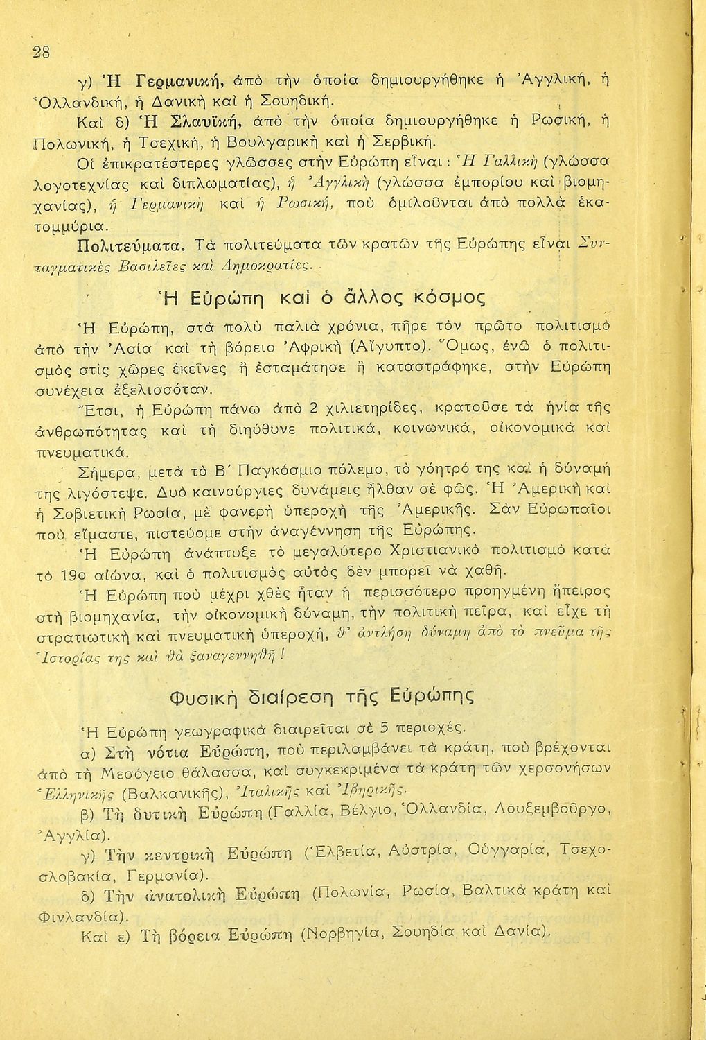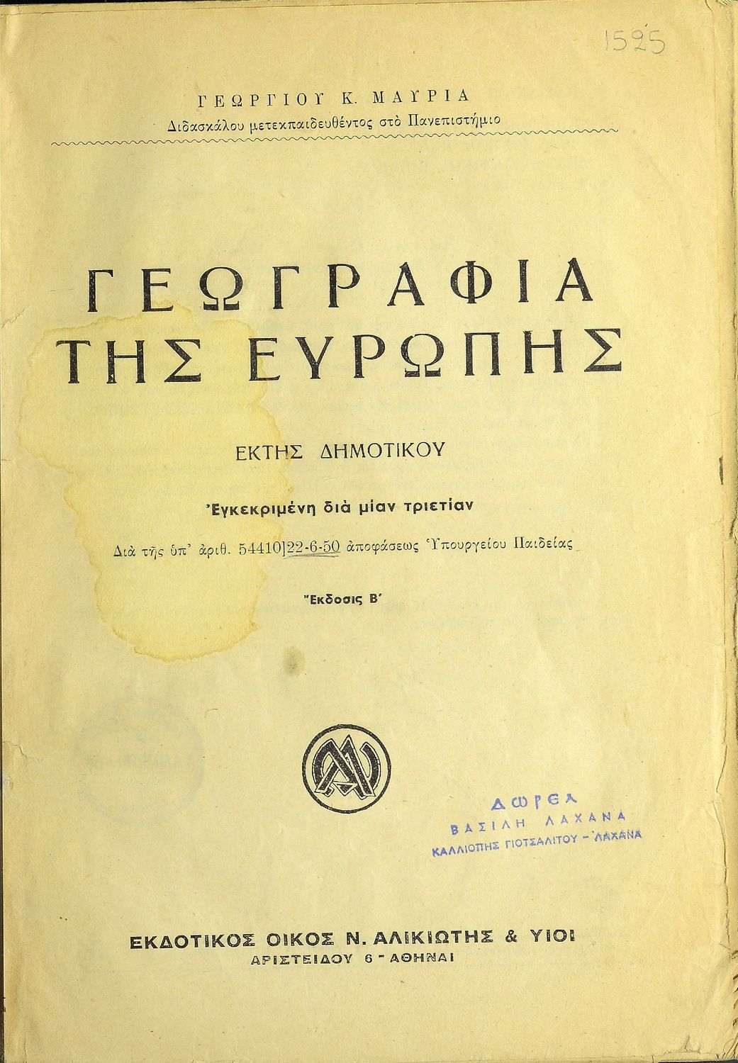 Βαθμίδα εκπαίδευσης: Πρωτοβάθμια Τάξη: ΣΤ' Δημοτικού Μάθημα: Γεωγραφία Γλώσσα: Δημοτική με στοιχεία καθαρεύουσας Παρουσίαση περιεχομένου: Μαθητικό βοήθημα Γεωγραφίας ΣΤ΄ Γυμνασίου που περιέχει στοιχεία φυσικής και μαθηματικής γεωγραφίας και εξετάζει τα κράτη της Ευρώπη από γεωφυσική, πολιτική και οικονομική άποψη. Περιλαμβάνει και στοιχεία ανθρωπογεωγραφίας. |