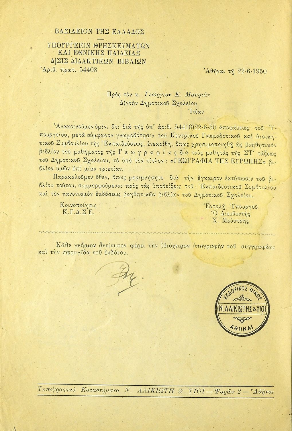 Εκδότης: Εκδόσεις Ατλαντίς Έτος έκδοσης: 1950 Τόπος έκδοσης: Αθήνα Έκδοση: 2η Υπουργική απόφαση / Σύμβαση: 54410/22-6-1950 Έτος έγκρισης: 1950 |