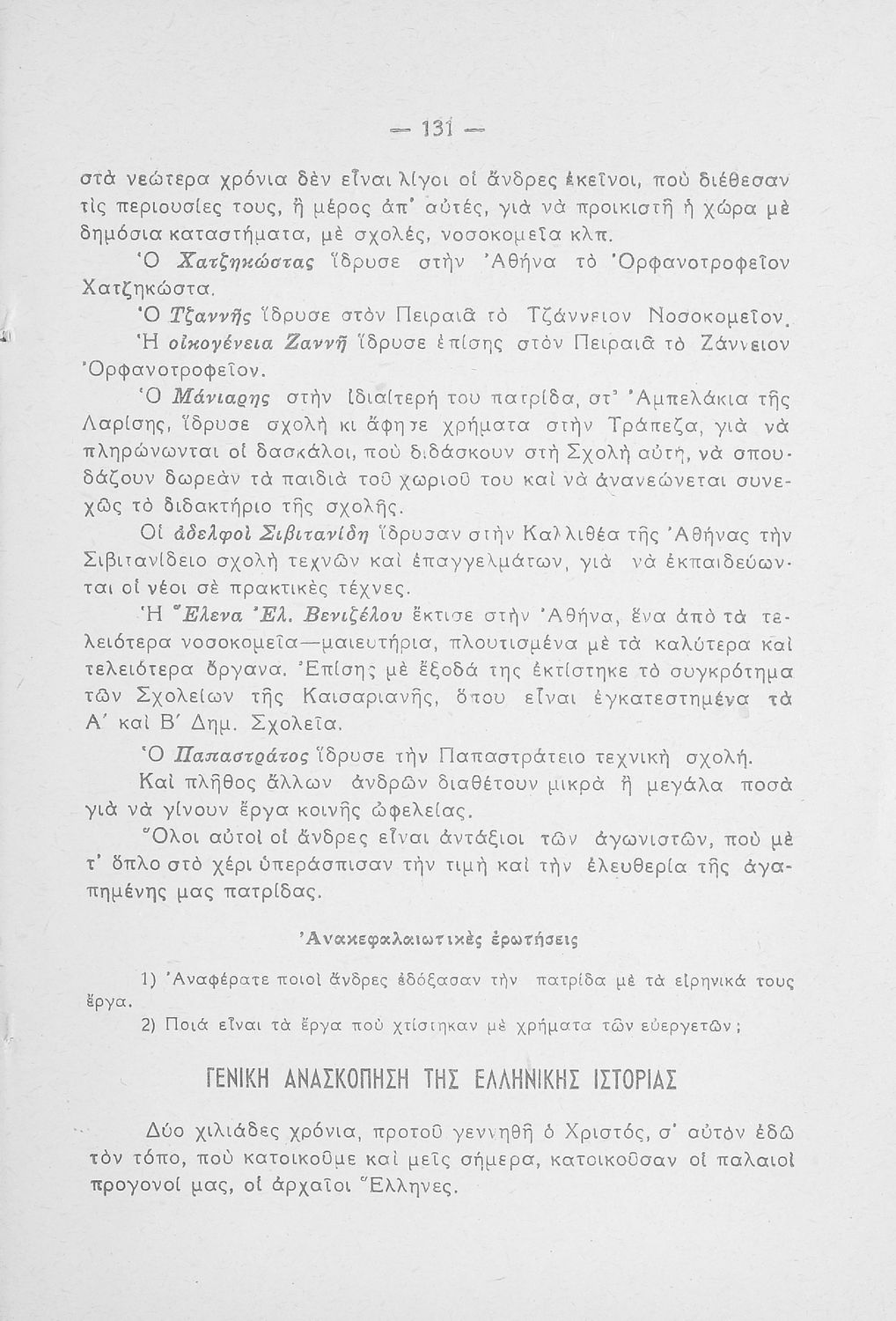 Βαθμίδα εκπαίδευσης: Πρωτοβάθμια Τάξη: ΣΤ' Δημοτικού Μάθημα: Ιστορία Γλώσσα: Δημοτική με στοιχεία καθαρεύουσας Παρουσίαση περιεχομένου: Μαθητικό βοήθημα Ιστορίας ΣΤ΄ Δημοτικού που καλύπτει την περίοδο της σύγχρονης ελληνικής ιστορίας από την Τουρκοκρατία ως τον Β΄ Παγκόσμιο Πόλεμο. Περιέχει ξεχωριστό κεφάλαιο για τους εθνικούς ευεργέτες (Αβέρωφ, Συγγρός, Βαρβάκης, Μαρασλής κ.α.). |