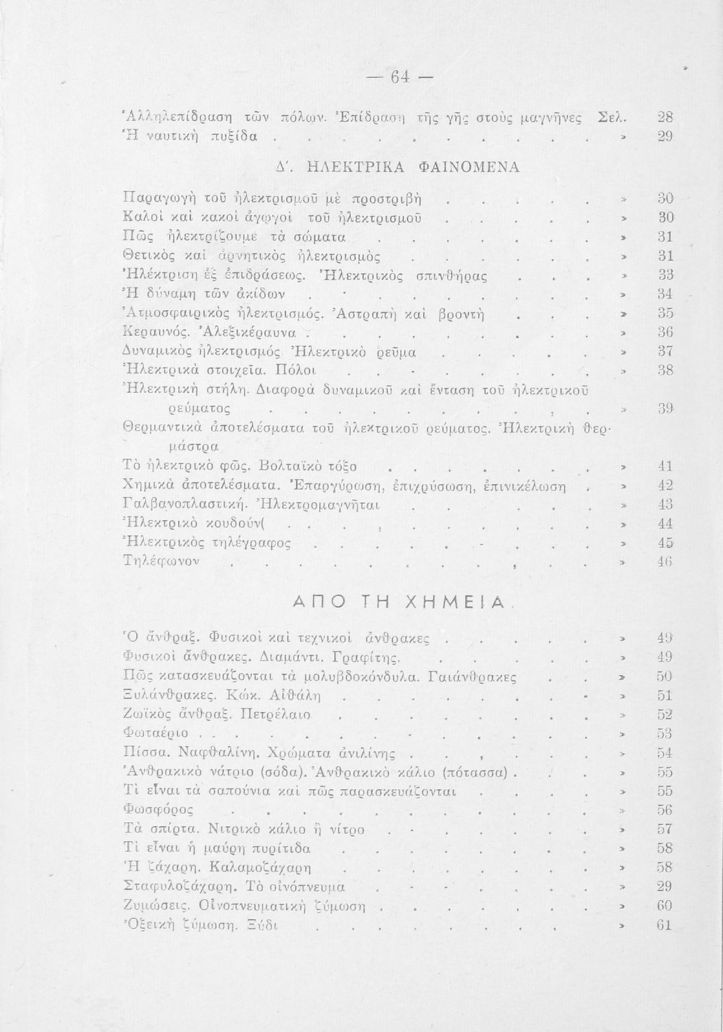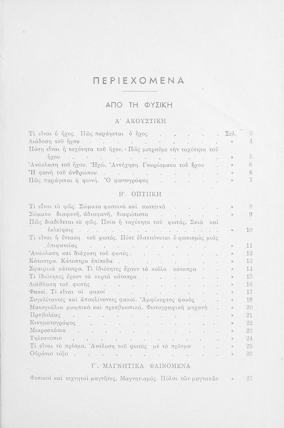Σχολικό εγχειρίδιο Φυσικής Πειραματικής ΣΤ΄ Δημοτικού που εστιάζει στα φυσικά φαινόμενα (ακουστική, οπτική, μαγνητισμός και ηλεκτρισμός) και στα χημικά φαινόμενα (είδη του άνθρακα, παραγωγή πίσσας, ναφθαλίνης, σαπουνιού, πυρίτιδας, ζάχαρης, οινοπνεύματος).