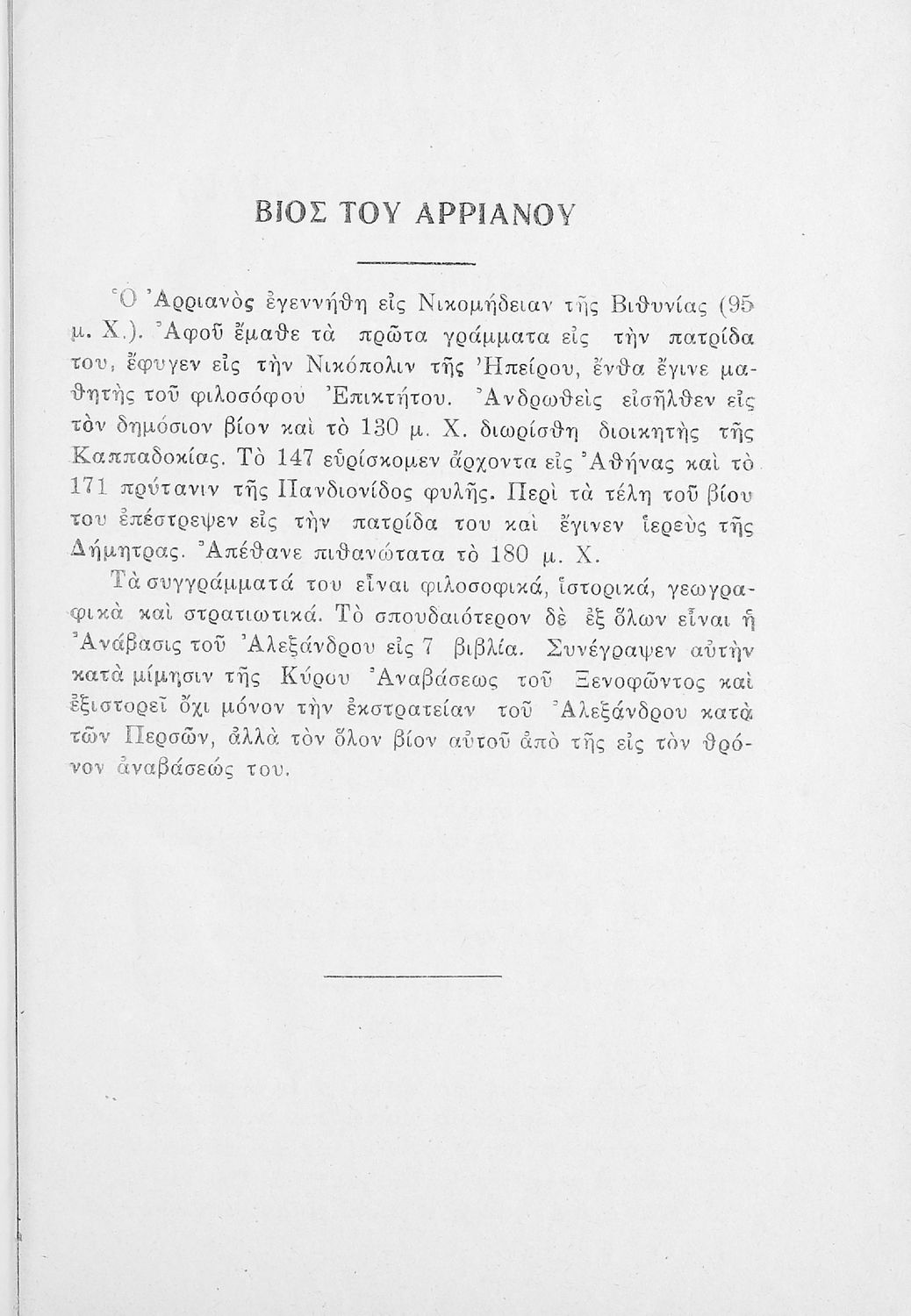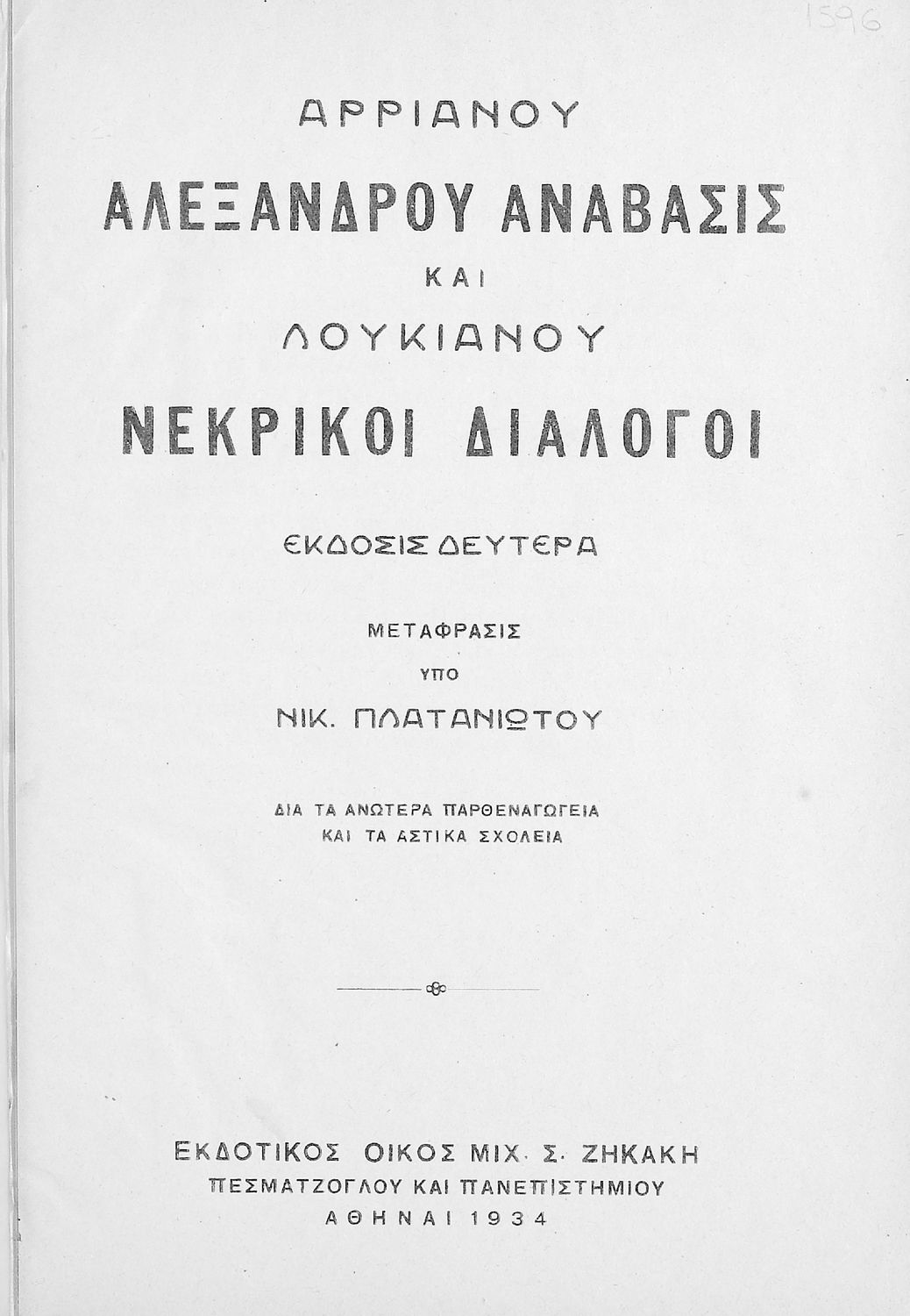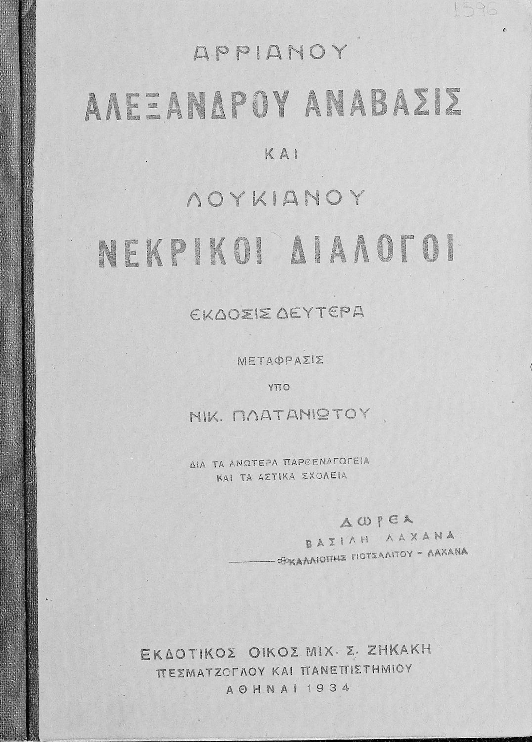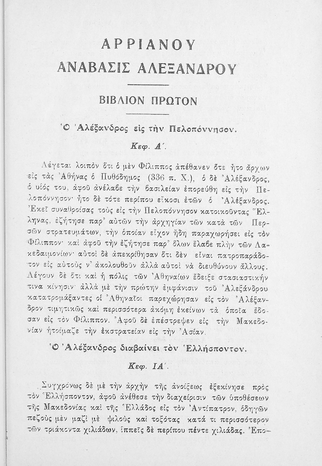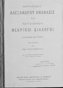 Μαθητικό βοήθημα Αρχαίων Ελληνικών για τα Αστικά Σχολεία και Παρθεναγωγεία που περιέχει μετάφραση αποσπασμάτων από το έργο του Αρριανού Αλέξανδρου Ανάβασις και του Λουκιανού Νεκρικοί Διάλογοι, ερμηνευτικά και πραγματολογικά σχόλια.