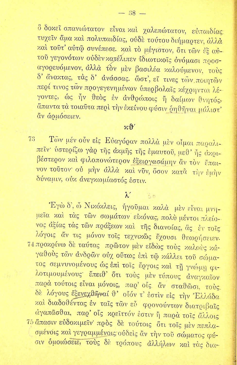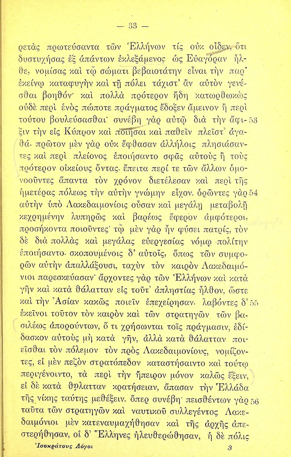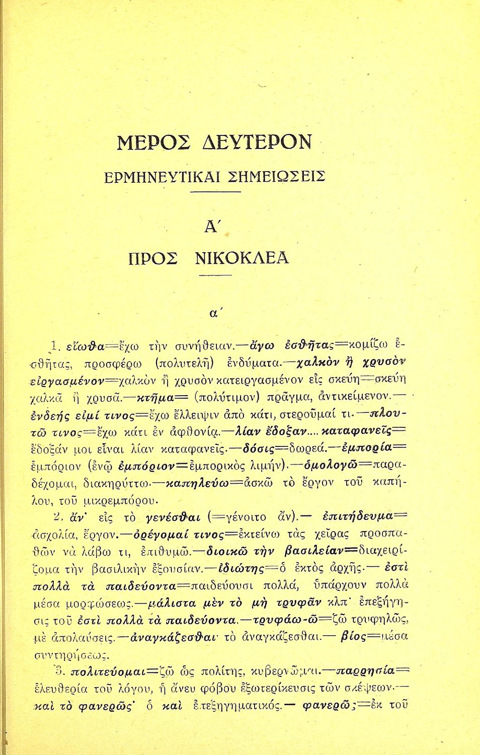 Σχολικό εγχειρίδιο Αρχαίων Ελληνικών Ε΄ Εξαταξίου Γυμνασίου που περιλαμβάνει εισαγωγή στη ζωή και στο έργο του Ισοκράτη, τους Λόγους του Προς Νικοκλέα και Ευαγόρας και ερμηνευτικά και λεξιλογικά σχόλια.