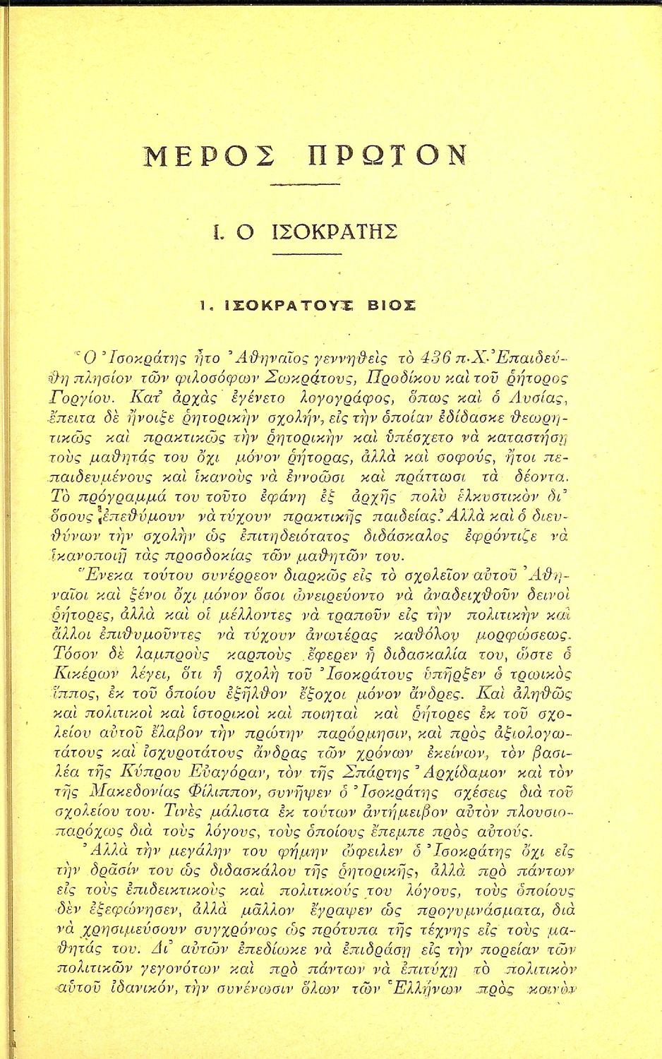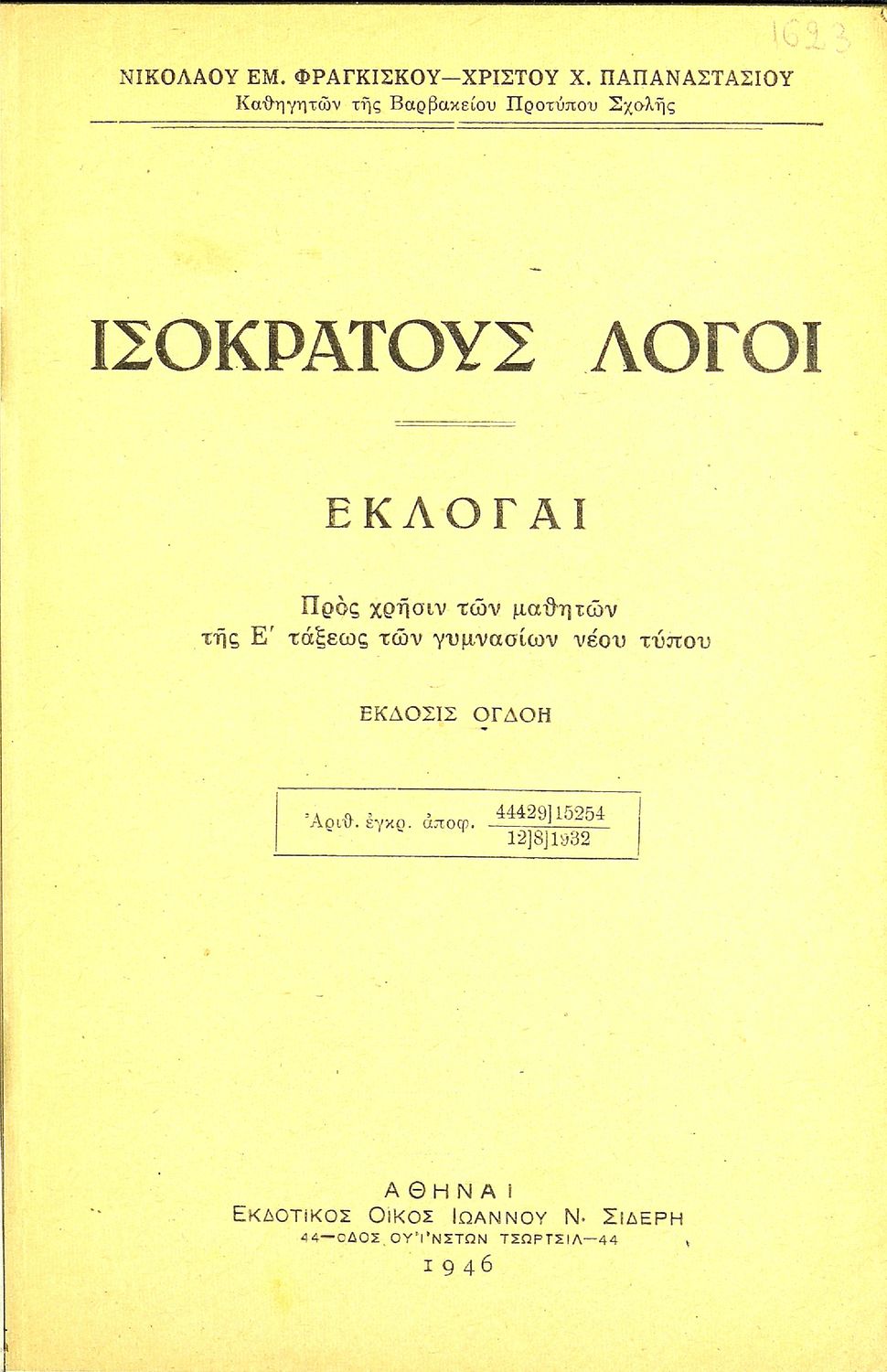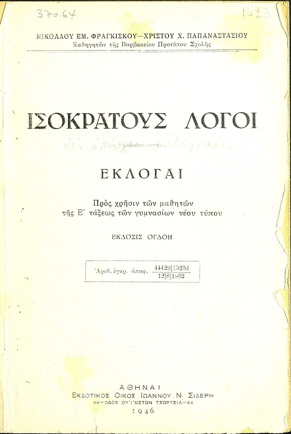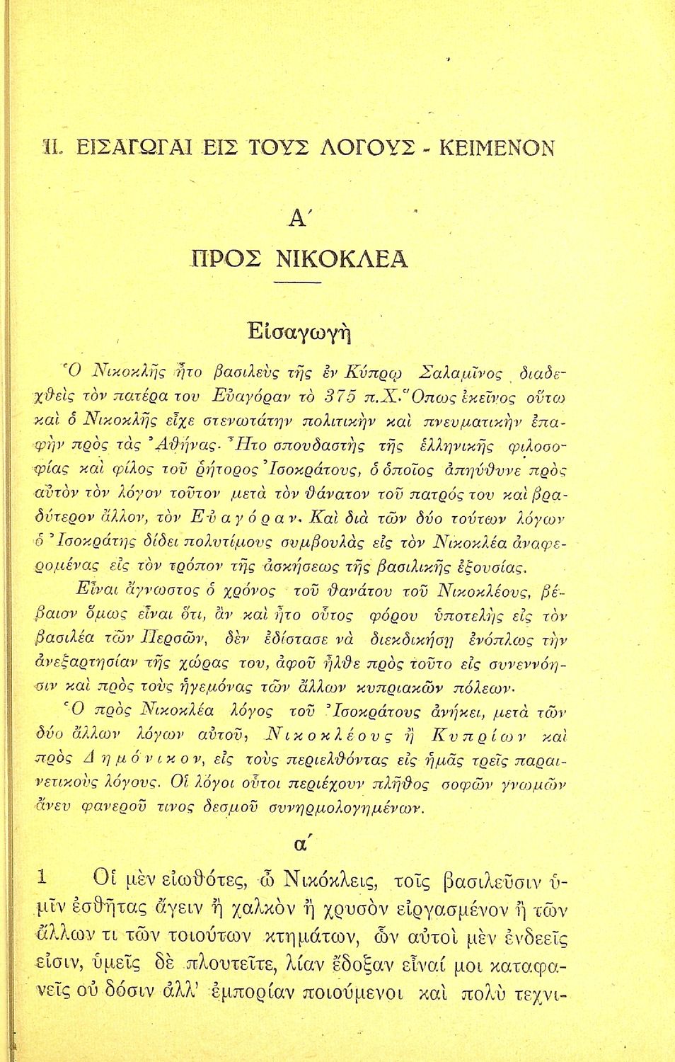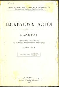 Σχολικό εγχειρίδιο Αρχαίων Ελληνικών Ε΄ Εξαταξίου Γυμνασίου που περιλαμβάνει εισαγωγή στη ζωή και στο έργο του Ισοκράτη, τους Λόγους του Προς Νικοκλέα και Ευαγόρας και ερμηνευτικά και λεξιλογικά σχόλια.