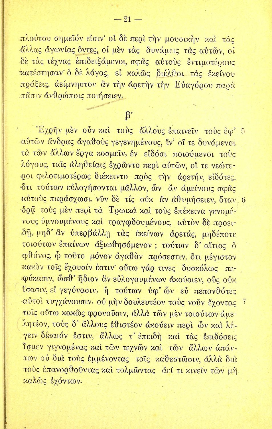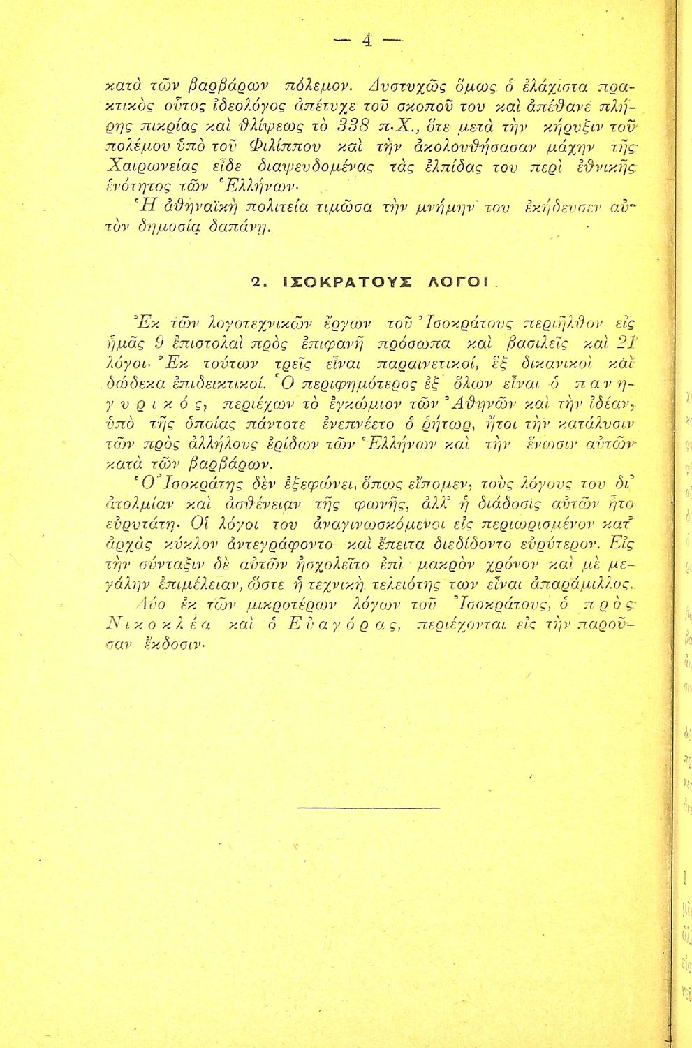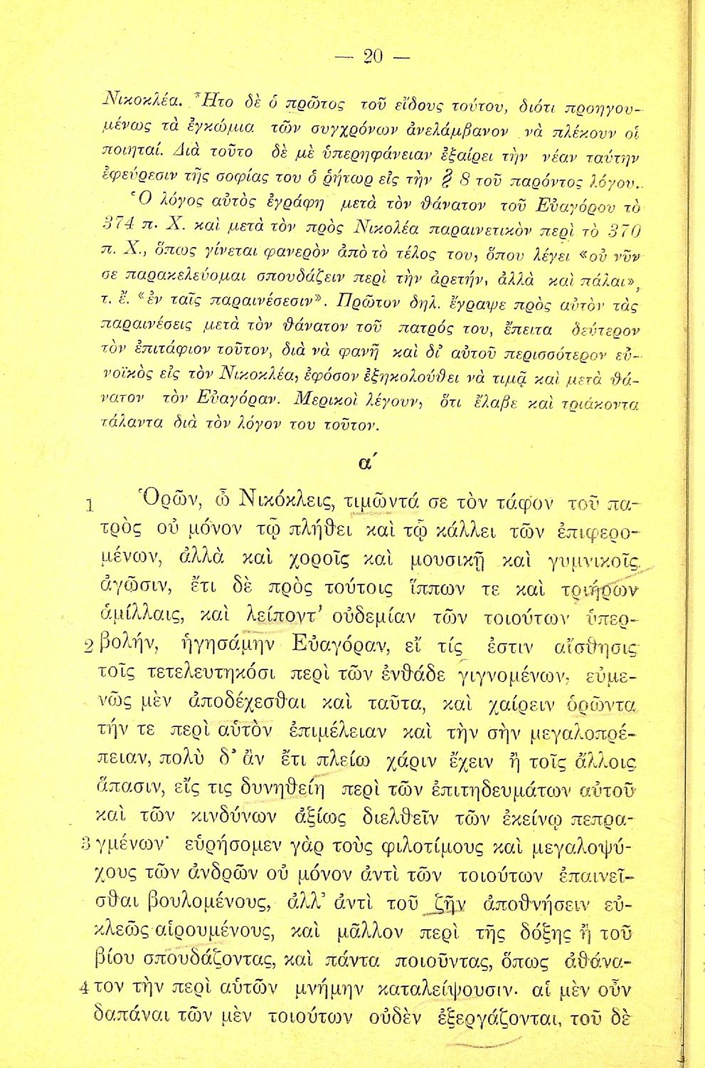 Σχολικό εγχειρίδιο Αρχαίων Ελληνικών Ε΄ Εξαταξίου Γυμνασίου που περιλαμβάνει εισαγωγή στη ζωή και στο έργο του Ισοκράτη, τους Λόγους του Προς Νικοκλέα και Ευαγόρας και ερμηνευτικά και λεξιλογικά σχόλια.