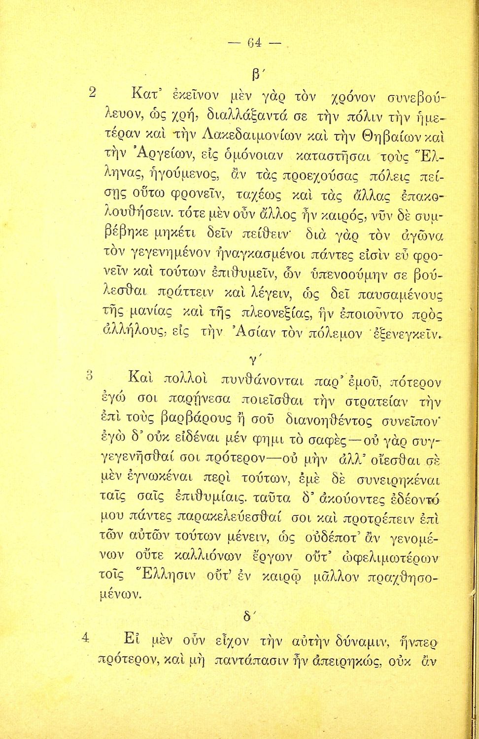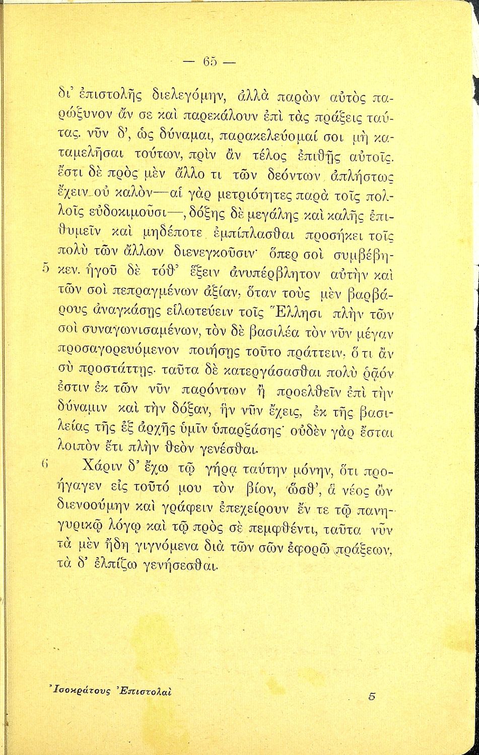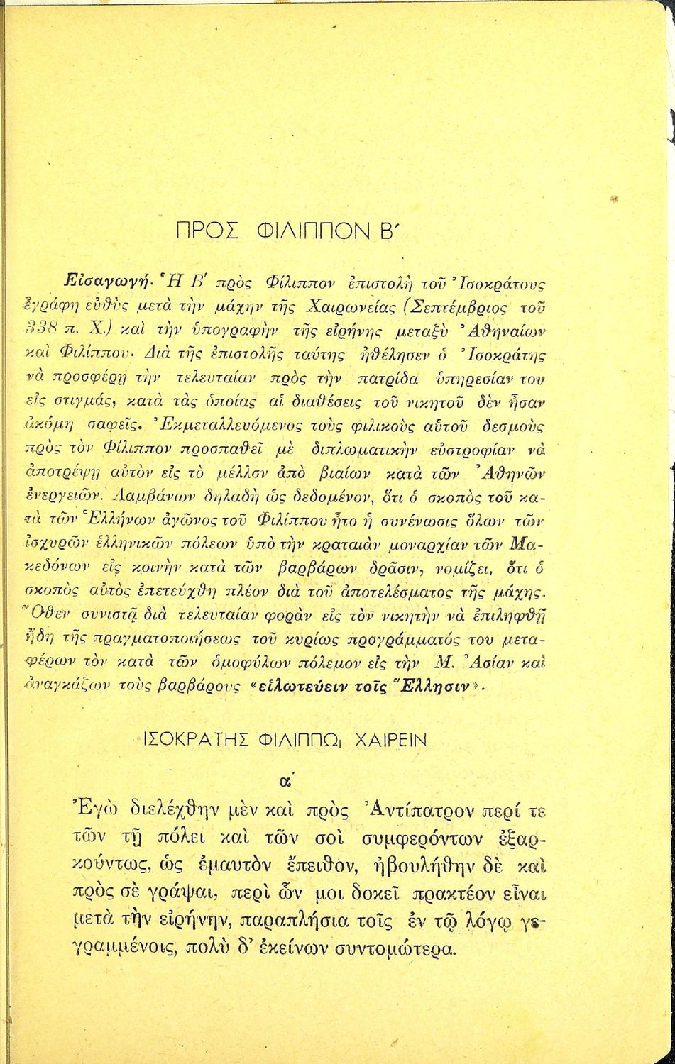 Σχολικό εγχειρίδιο Αρχαίων Ελληνικών Δ΄ Γυμνασίου που περιλαμβάνει εισαγωγή στη ζωή και το έργο του Ισοκράτη, τις επιστολές Α΄ και Β΄ προς Φίλιππο και ερμηνευτικές παρατηρήσεις.