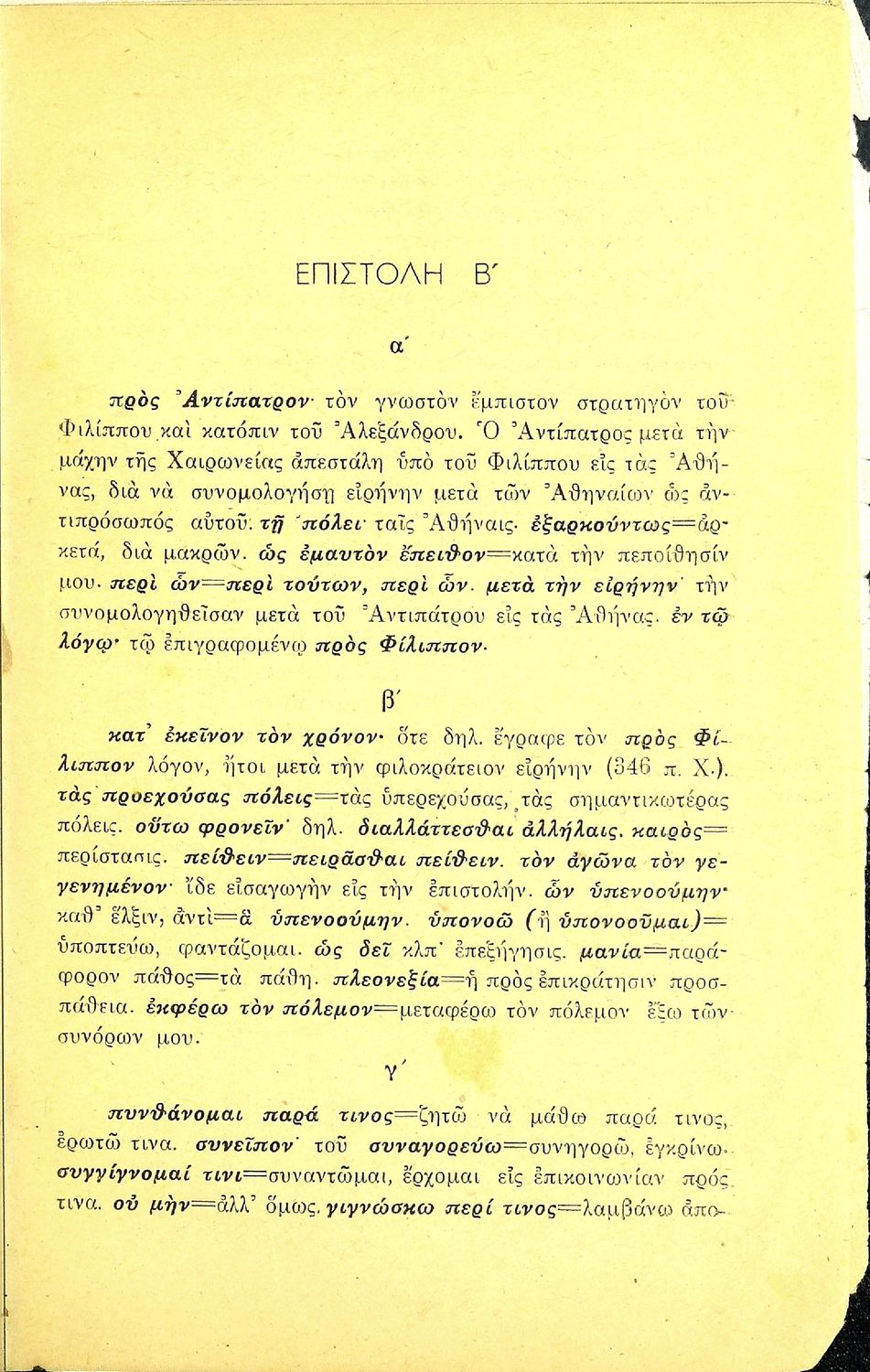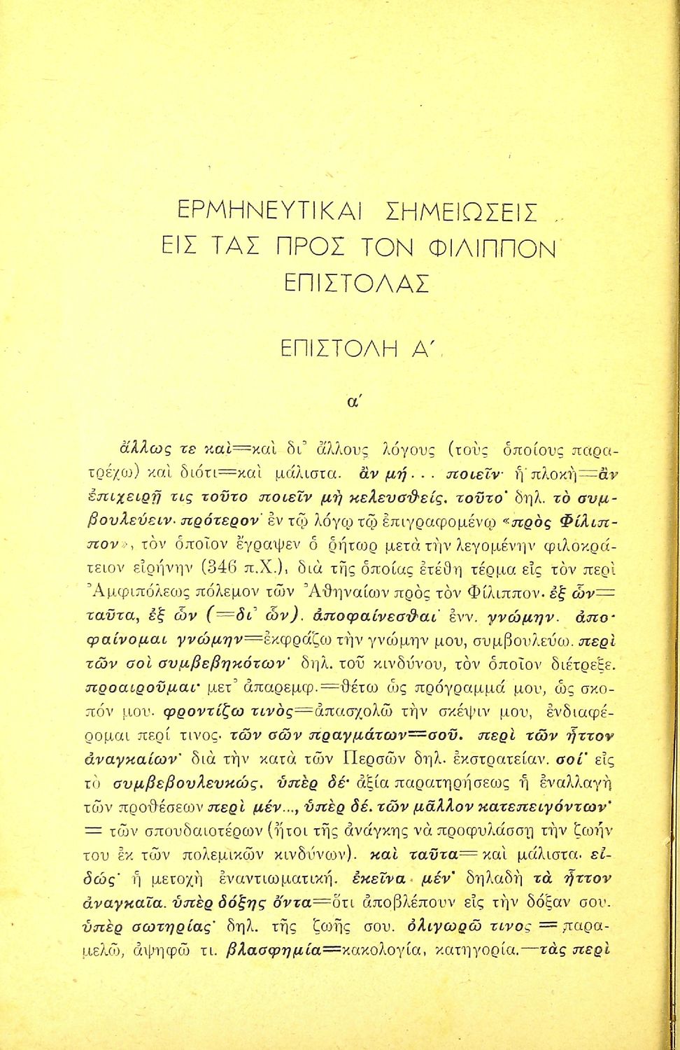 Σχολικό εγχειρίδιο Αρχαίων Ελληνικών Γυμνασίου που περιέχει τους Ολυνθιακούς Α΄ και Β΄ και τους Φιλιππικούς Α΄ και Β΄ του Δημοσθένη, το Λόγο κατά Λεωκράτους του Λυκούργου και τις Επιστολές προς Φίλιππο του ...
