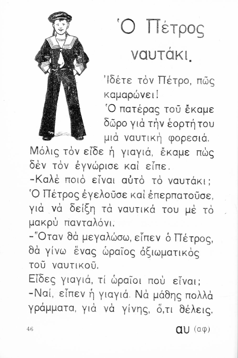 Βαθμίδα εκπαίδευσης: Πρωτοβάθμια Τάξη: Α' Δημοτικού Μάθημα: Νέα Ελληνικά Γλώσσα: Δημοτική Παρουσίαση περιεχομένου: Αναγνωστικό Α΄ Δημοτικού που περιλαμβάνει τα γράμματα του ελληνικού αλφαβήτου, εικόνες, τις πρώτες συλλαβές και λέξεις και μικρά ποιήματα και διηγήματα με ιστορίες από την φύση, την οικογένεια και την ελληνική ύπαιθρο. |