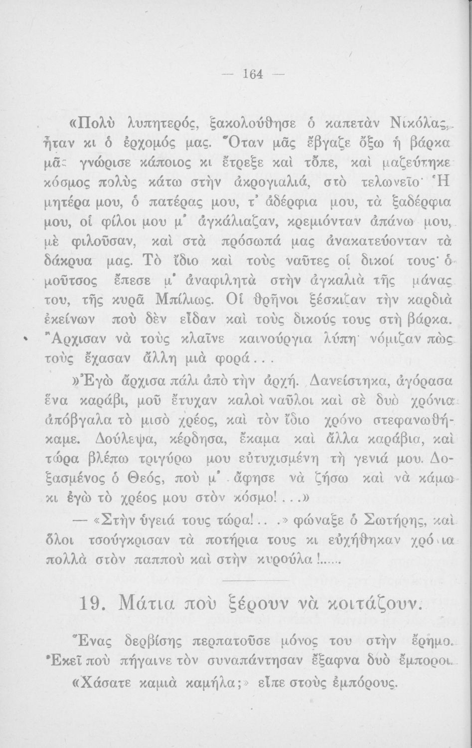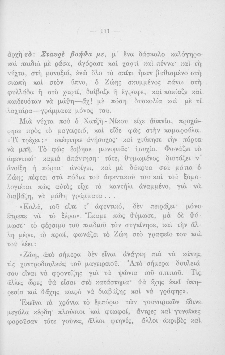 Αναγνωστικό Ε΄ Δημοτικού που περιλαμβάνει κείμενα εμπνευσμένα από την οικογενειακή παράδοση, το εθνικό και πατριωτικό καθήκον σε περίοδο ειρήνης και πολέμου, την ελληνική φύση και την αγάπη για τα ζώα, την ελληνική ιστορία και τα ήθη και έθιμα. Δίνεται ιδιαίτερη βαρύτητα στις ηθικές αρετές και αξίες. Παρατηρείται η έλλειψη του θρησκευτικού στοιχείου.