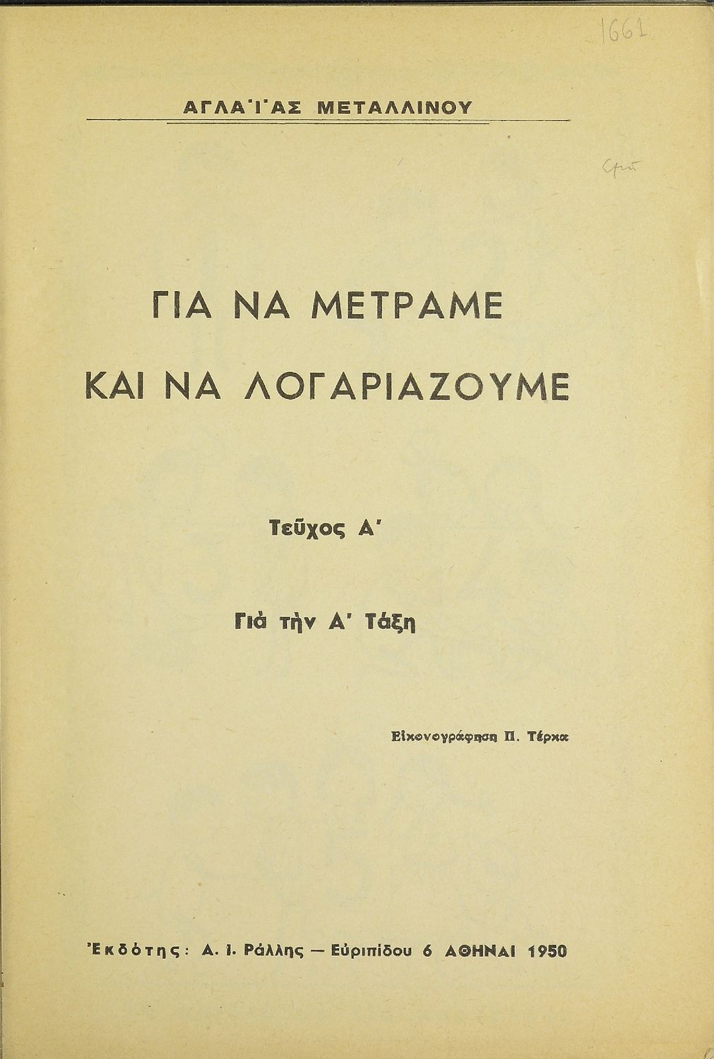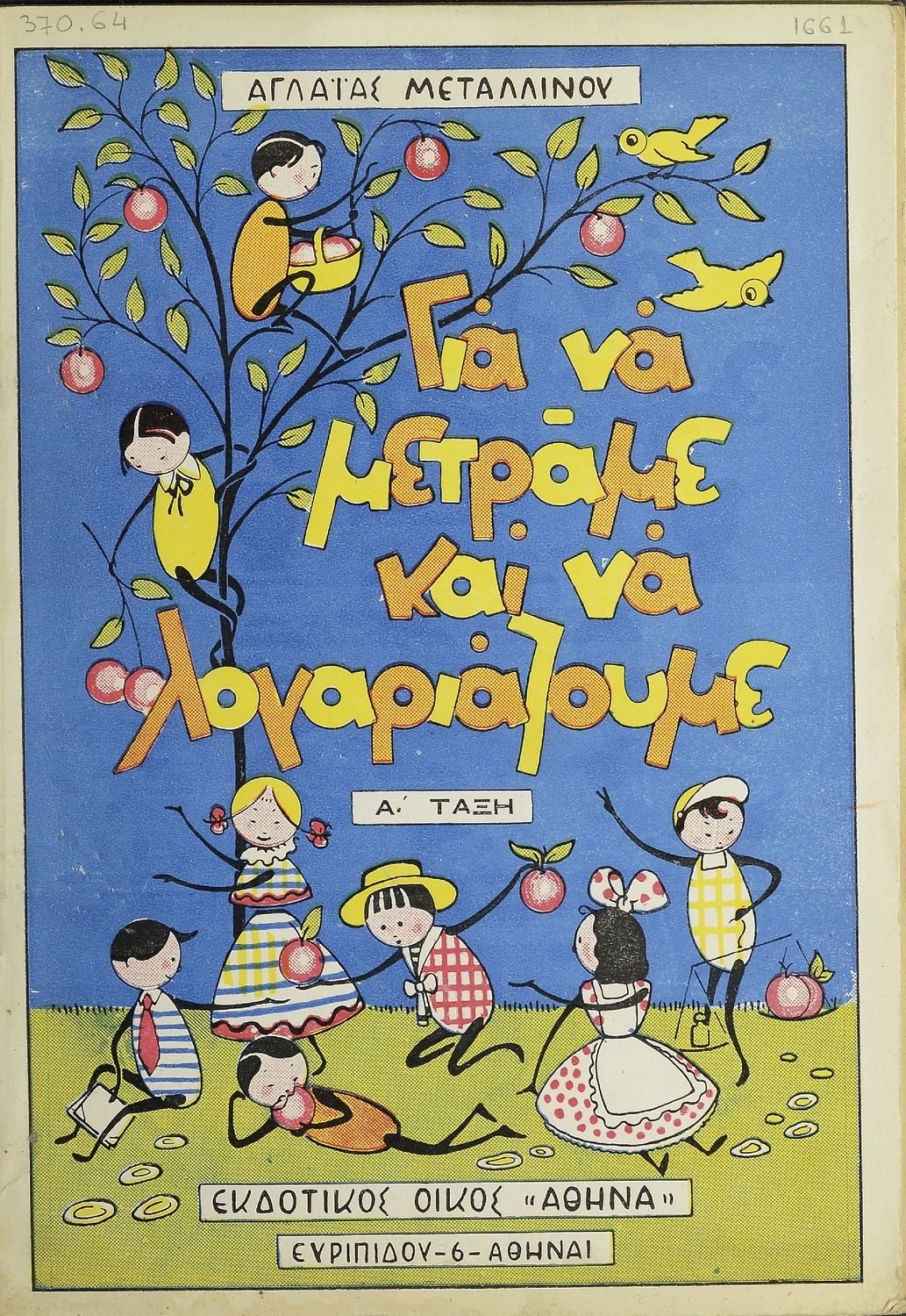 Κωδικός αναγνώρισης: 20-01661 Τίτλος: Για να μετράμε και να λογαριάζουμε για την Α΄ τάξη, τεύχος Α΄ Συγγραφέας: Αγλαΐα Μεταλλινού Εικονογράφος: Π. Τέρκα Μέγεθος και υπόστρωμα: Μαθητικό βοήθημα, 23εκ., μαλακό εξώφυλλο, 34 σελίδες. Εξώφυλλο (έγχρωμο), σκίτσα (ασπρόμαυρα). |