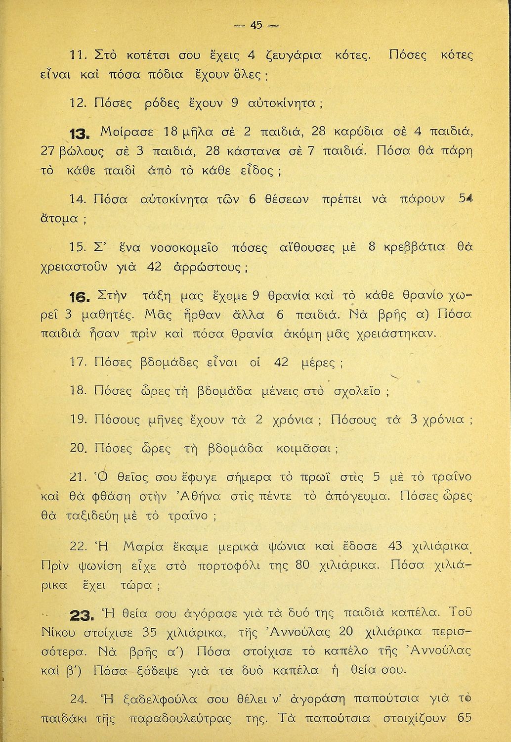 Παρουσίαση περιεχομένου: Μαθητικό βοήθημα Αριθμητικής Β΄ Δημοτικού που περιλαμβάνει θεωρία, προβλήματα και ασκήσεις και εστιάζει στις αριθμητικές πράξεις και τη μέτρηση του χρόνου και του βάρους. Περιέχει και προβλήματα μαθηματικής σκέψης.