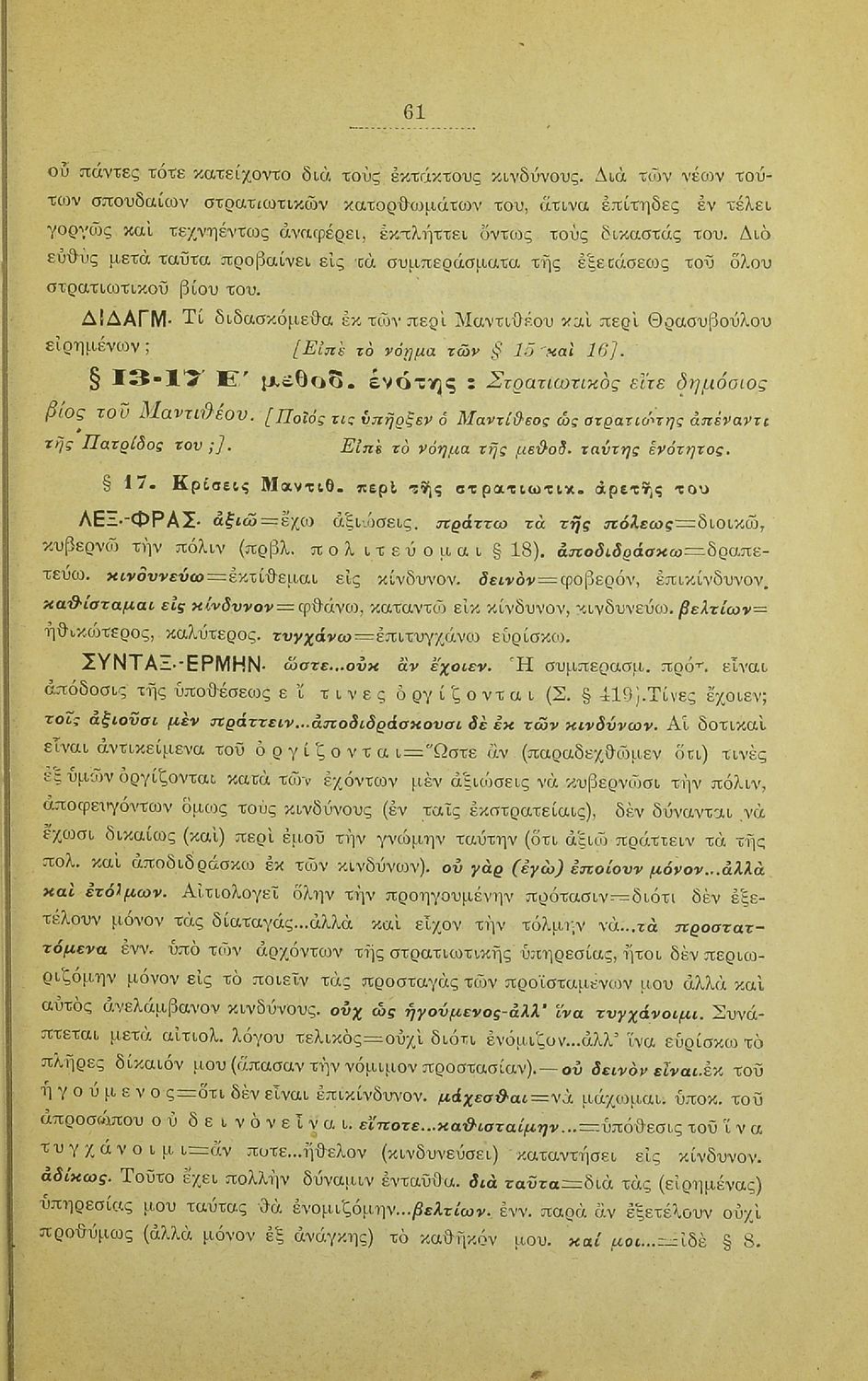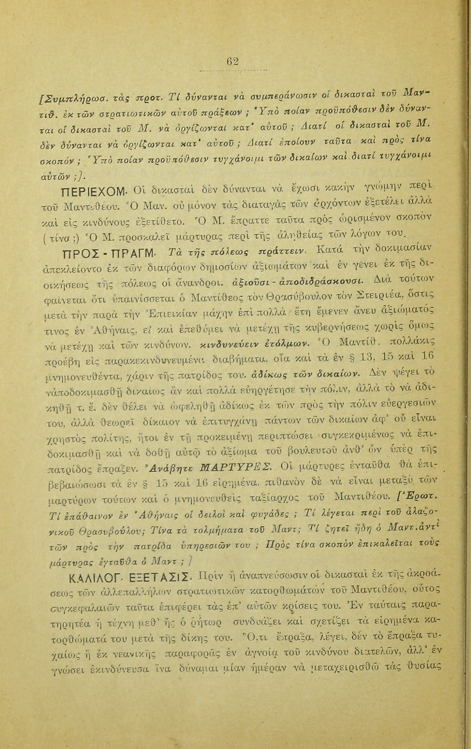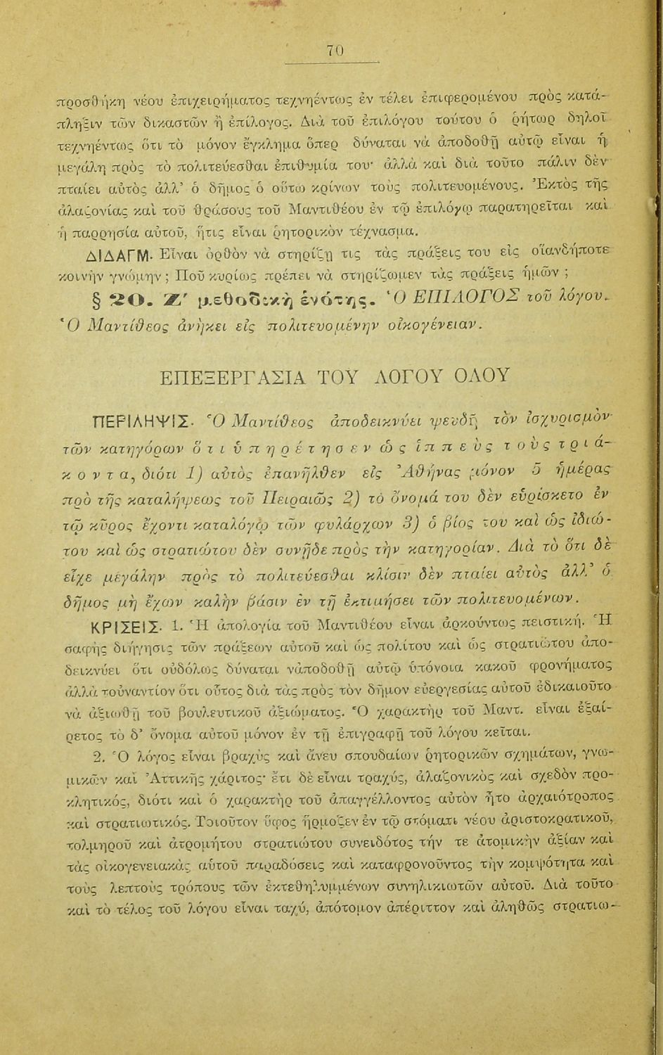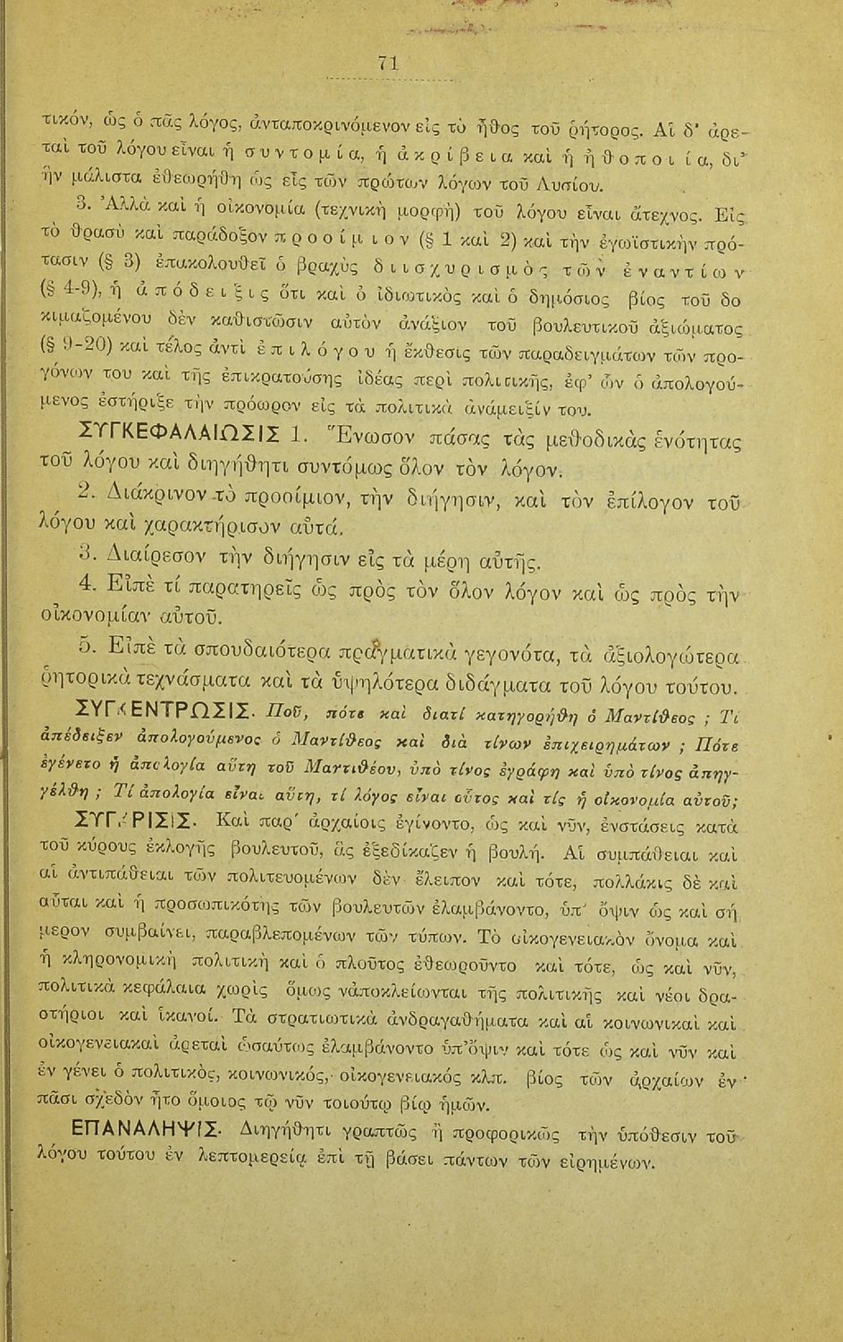Σχολικό εγχειρίδιο Αρχαίων Ελληνικών που περιλαμβάνει τους λόγους του Λυσία Υπέρ Μαντιθέου και Περί δημοσίων αδικημάτων, εισαγωγή στη ζωή και το συγγραφικό έργο του, τα είδη ρητορικών λόγων, και γραμματικά, ερμηνευτικά και συντακτικά σχόλια.