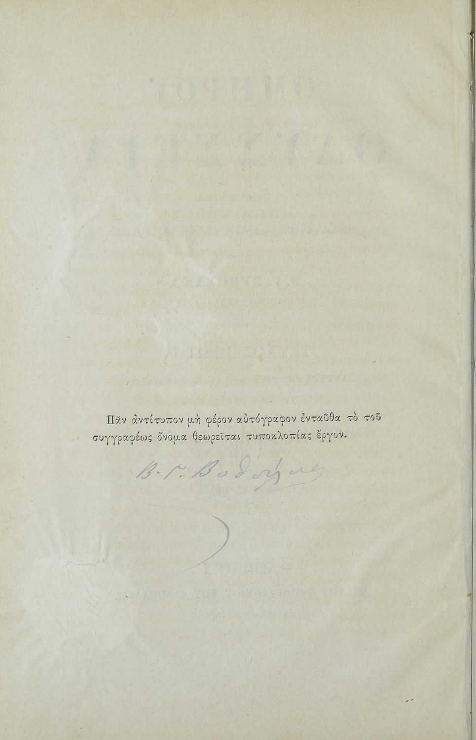 Τίτλος: Ομήρου Οδύσσεια τεύχος πρώτον, περιέχον Α΄ και Β΄ ραψωδίαν μετά σημειώσεων ερμηνευτικών