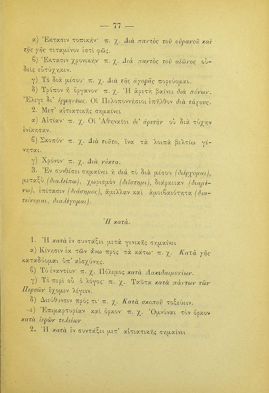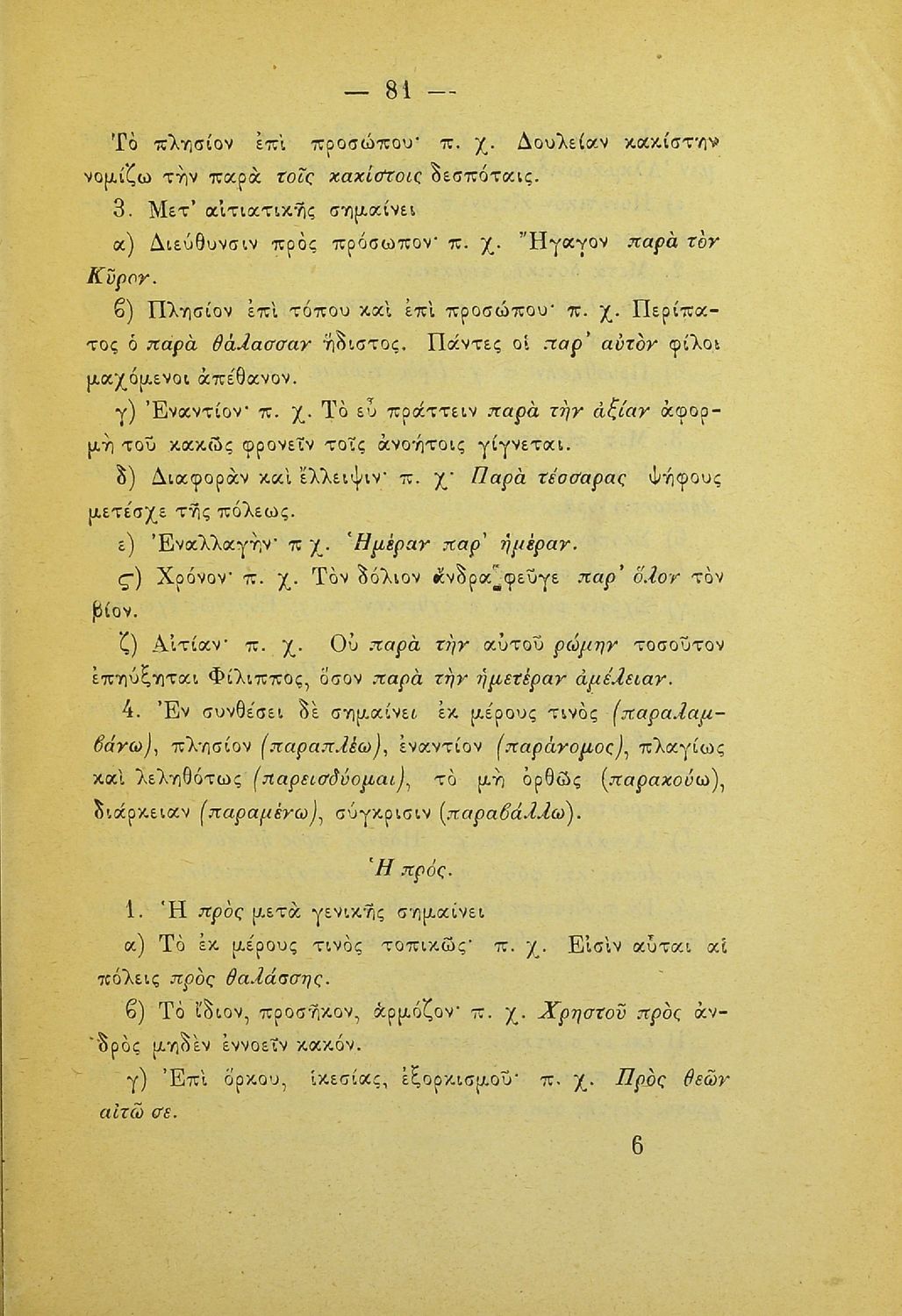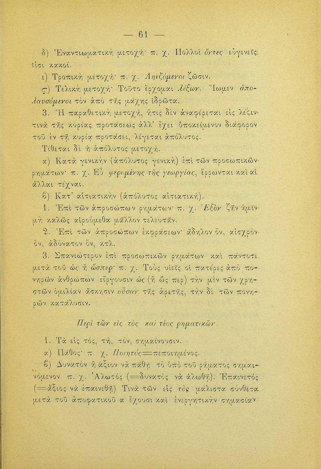 Σχολικό εγχειρίδιο Αρχαίων Ελληνικών για τους μαθητές των Ελληνικών Σχολείων και Παρθεναγωγείων που εξετάζει τα μέρη του λόγου και την σύνταξή τους.