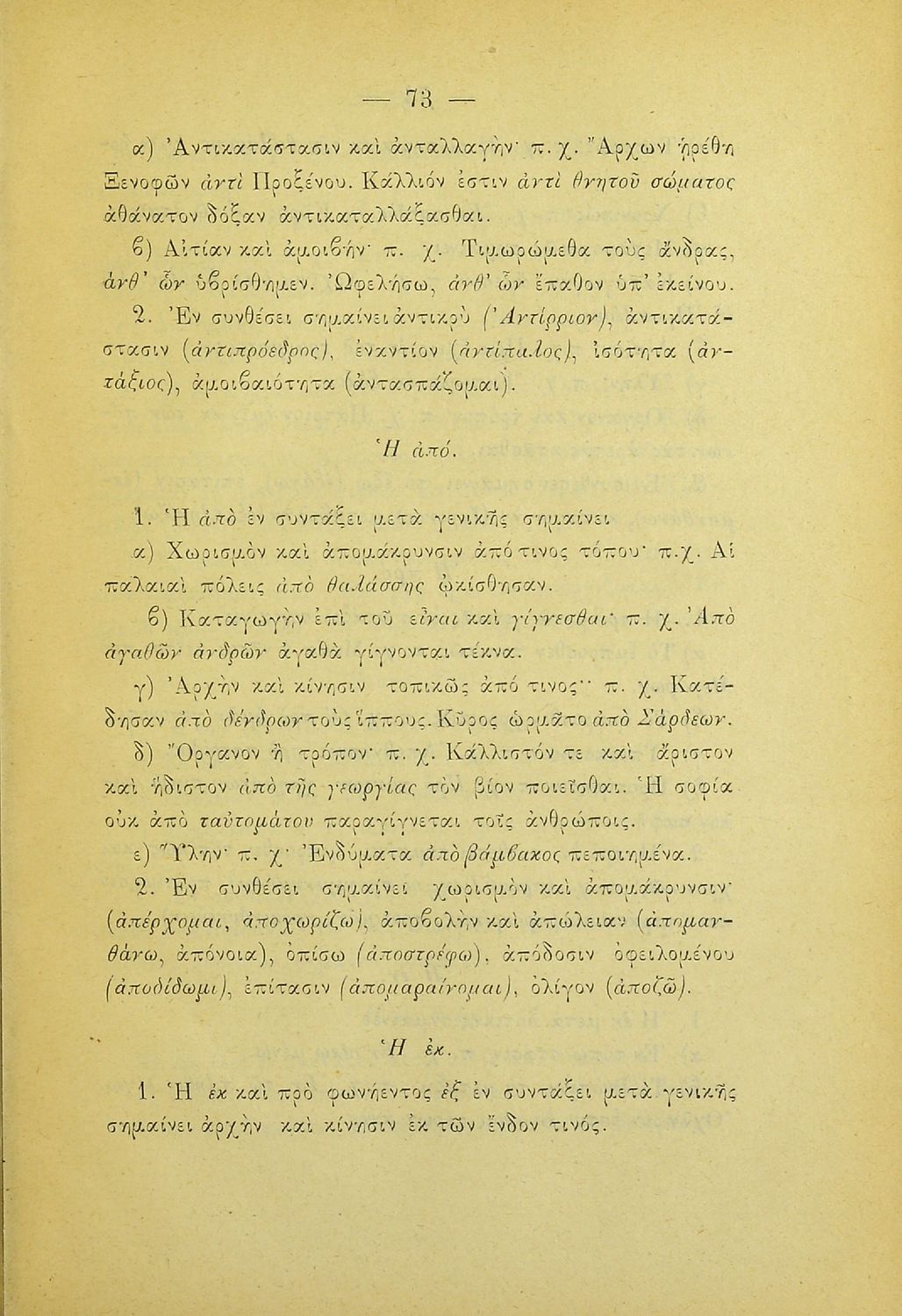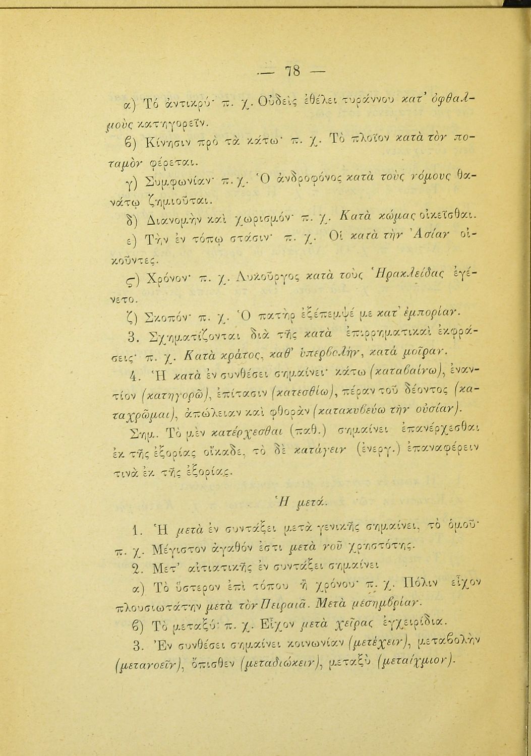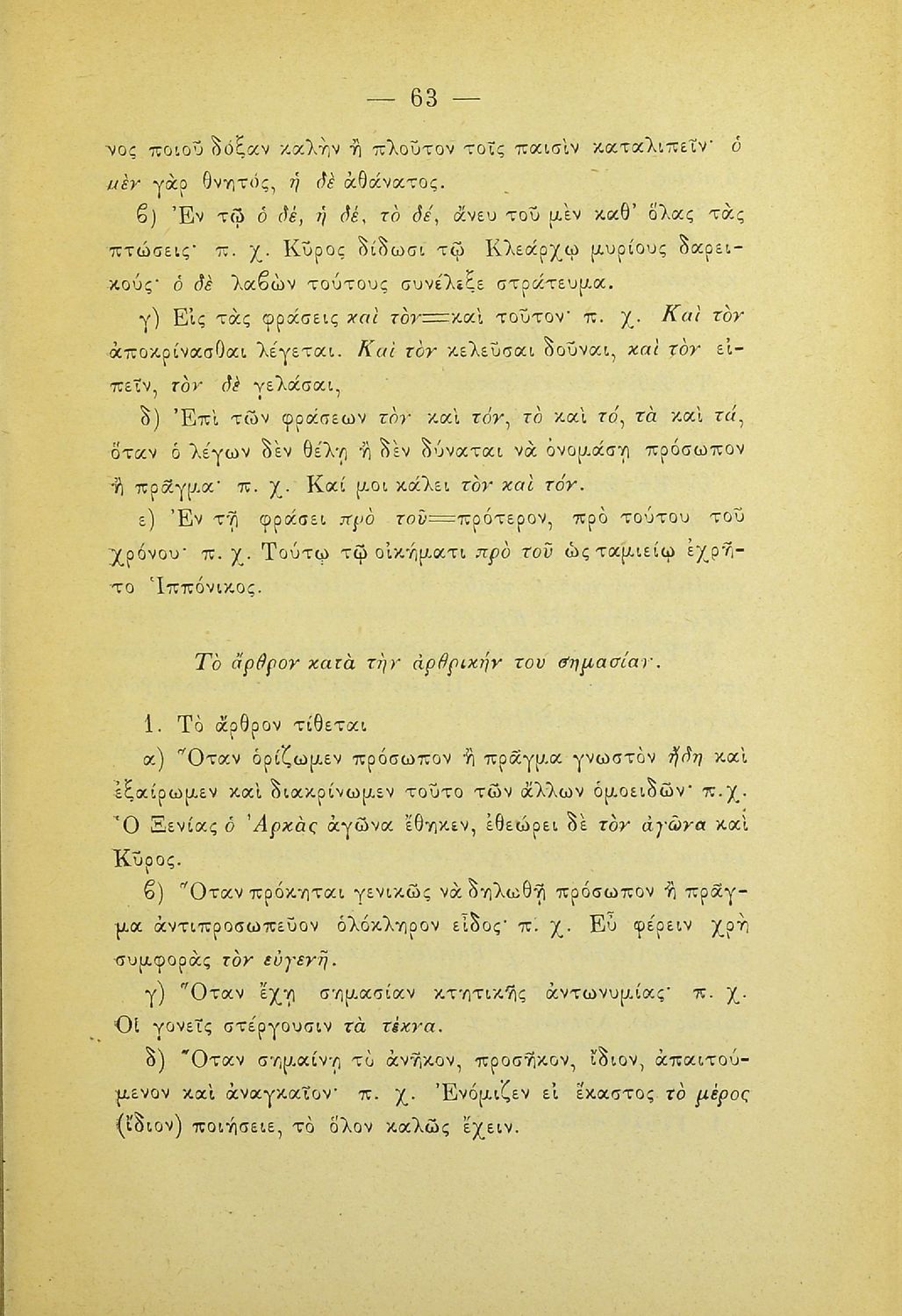 Σχολικό εγχειρίδιο Αρχαίων Ελληνικών για τους μαθητές των Ελληνικών Σχολείων και Παρθεναγωγείων που εξετάζει τα μέρη του λόγου και την σύνταξή τους.